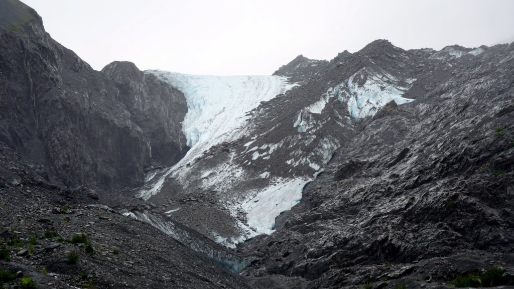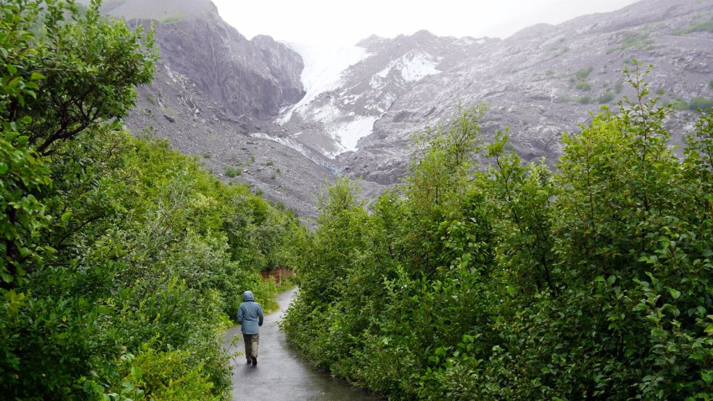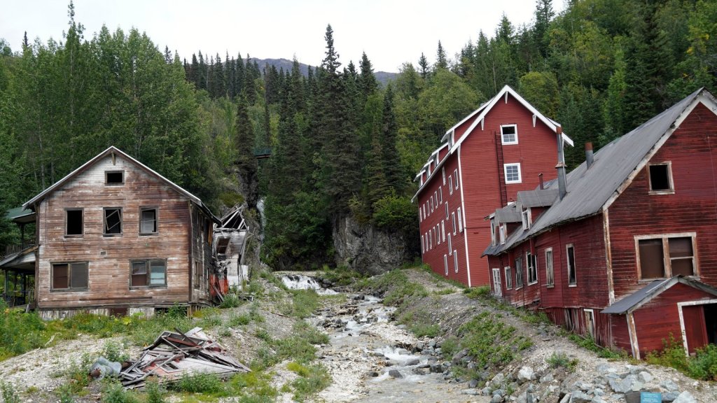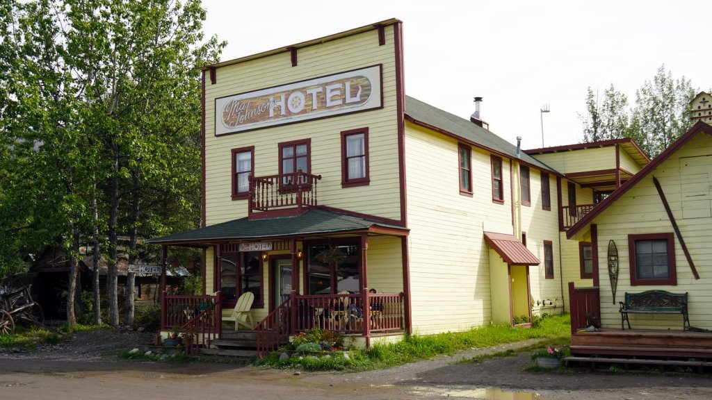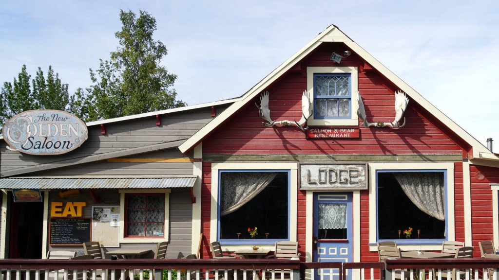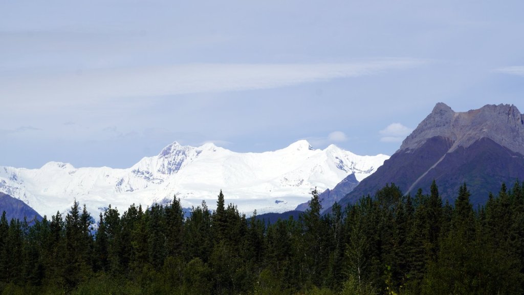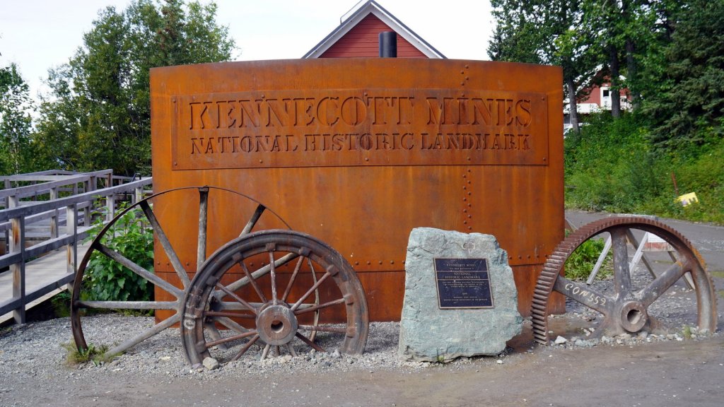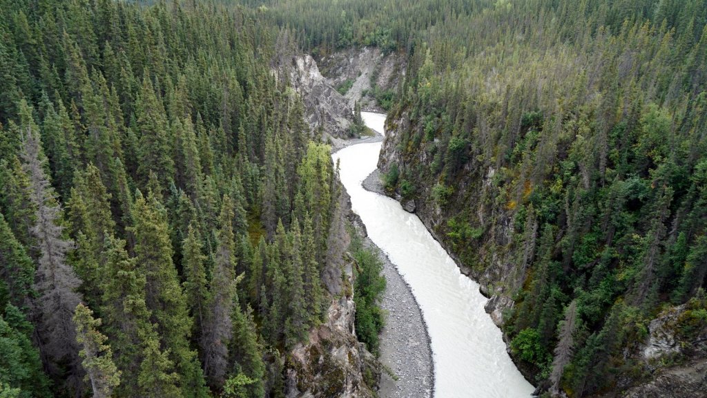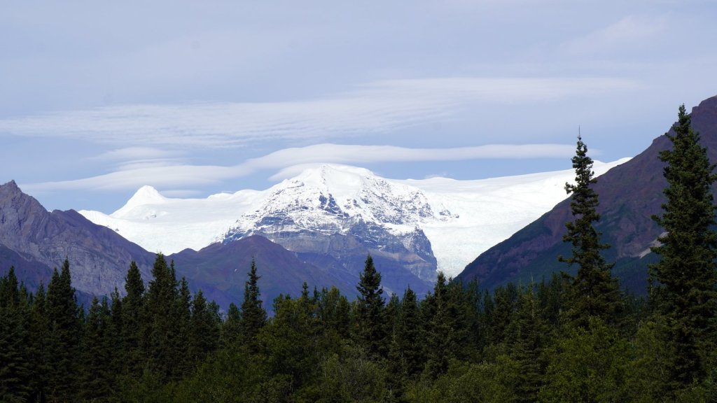 We made our way up out of the sound and over the mountains. Finally it stopped raining on the other side of the pass. From several people we heard that the Wrangell range near McCarthy is worth a visit. Moreover there is a pre 1938 Coppermine Kennicott nearby. It was a long drive following the Copper river and later the Chitina river though valleys in between the mountains. The first night we had a magnificent view down to braided and fast flowing Chitina river. The drive was over the rail bed of the old train line which the mine company had constructed, to ship the ore out to Cordova on the Gulf of Alaska, some 190 km away. Beside a narrow cut though a mountain outside Chitina and the remains of some high wooden bridges, you did not realise you are driving over an old rail line. The train bed has been improved to facilitate visitors, as a gateway to the Wrangell-St. Elias National park. Many people walked up to the artistic town of McCarthy or take the provided free shuttle bus. (You need to leave your vehicle by the foot bridge as no one is allowed to drive further from the parking lot). And then take the next free shuttle bus up to the mine. From there you can walk to one of the glaciers coming down the 4982 m high Mnt. Blackburn. You can either walk there yourself or take a one day guided tour which take you to the glacier and with provided crampon walk on it. We did not do the walk to the glacier but instead spent our time exploring the remains of the extraction plant of the Kennicott mine. Much of the red painted wooden structure is still standing since it was abandoned in 1938 when the ore ran out. Several buildings have been cannibalised over the years and much of the equipment has been removed. It is now a historical site and what is left is being preserved. When discovered around 1905 the ore was one of the riches ever found. The ore was however high up on the mountain where the volcanic green stone came in contact with the limestone above it. You can clearly see this from a distance. Three mines were developed into the mountain side just under the top with many tunnels to bring the ore out. The whole area was mostly covered with snow and the mill was actually situated at the side of the glacier. After an interesting afternoon exploring the ruins of the mill we drove out and camped at a small pullout next to a lake. The following day we drove all the way out and north following the Copper river. The banks of the river is sometimes 100 m higher than the river with many great views of the Wrangell range. Before arriving, we left the Copper river and crossed over the low end of the Alaska range back to Tok on the Alaskan Highway. We had already visited this town when coming over the mountains from Dawson City, Canada. We had a much needed shower and drove off to an uninteresting camp spot on an abandoned section of the old Alaskan Highway some 24 km outside town.