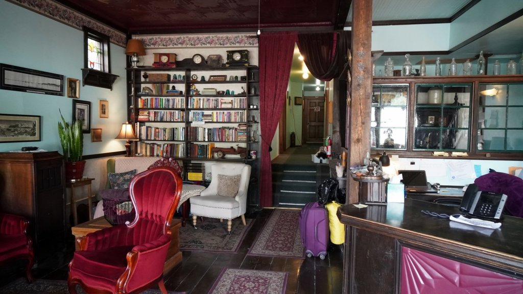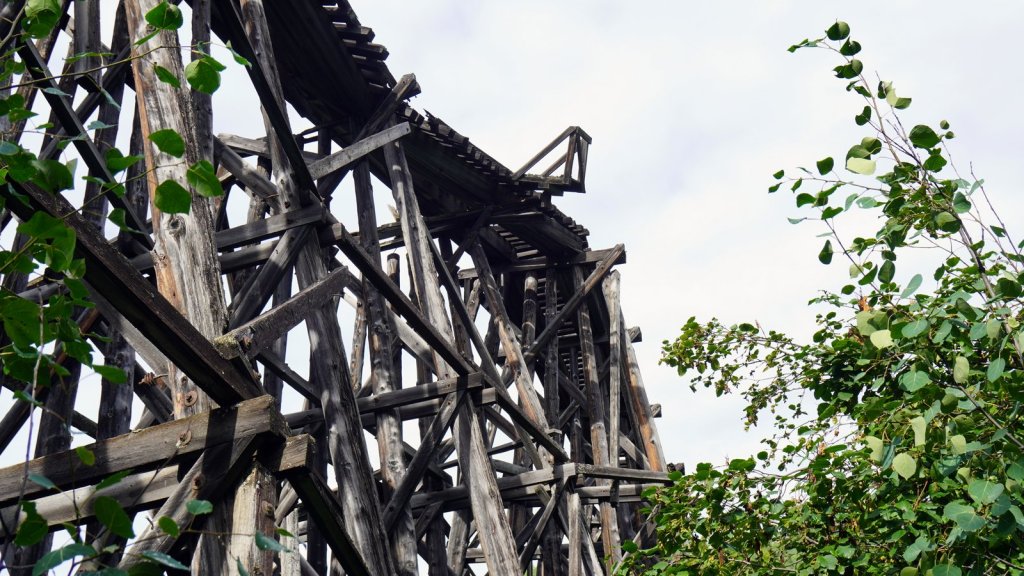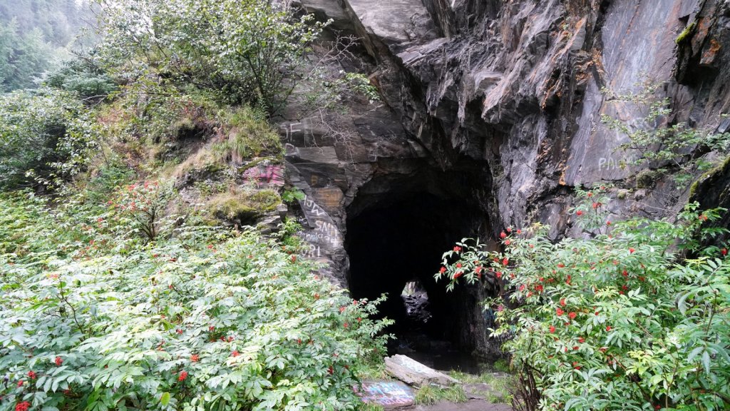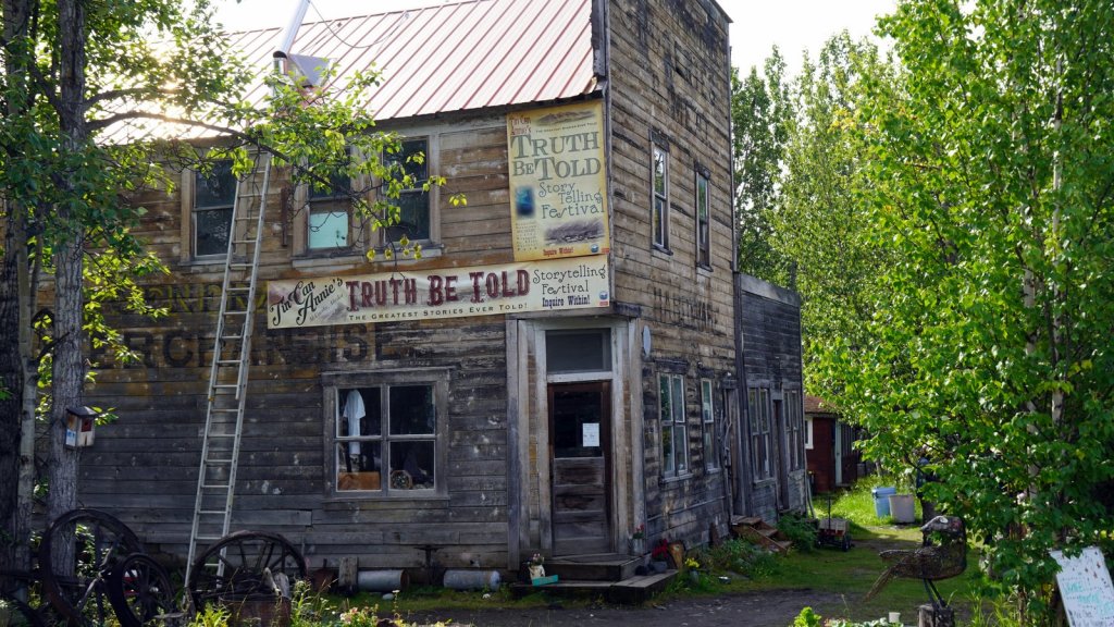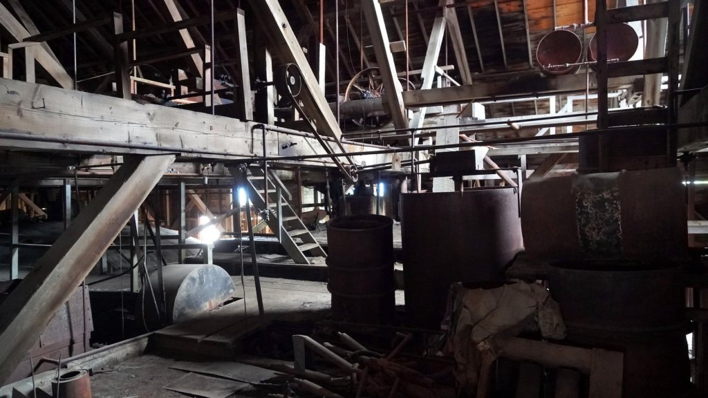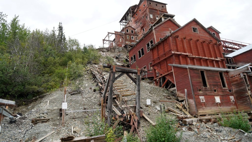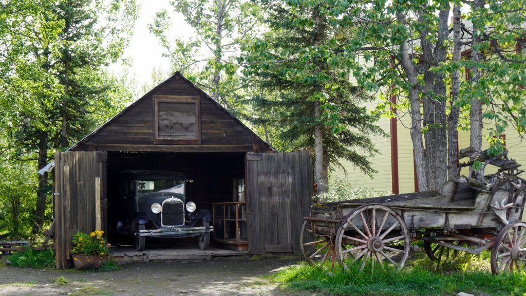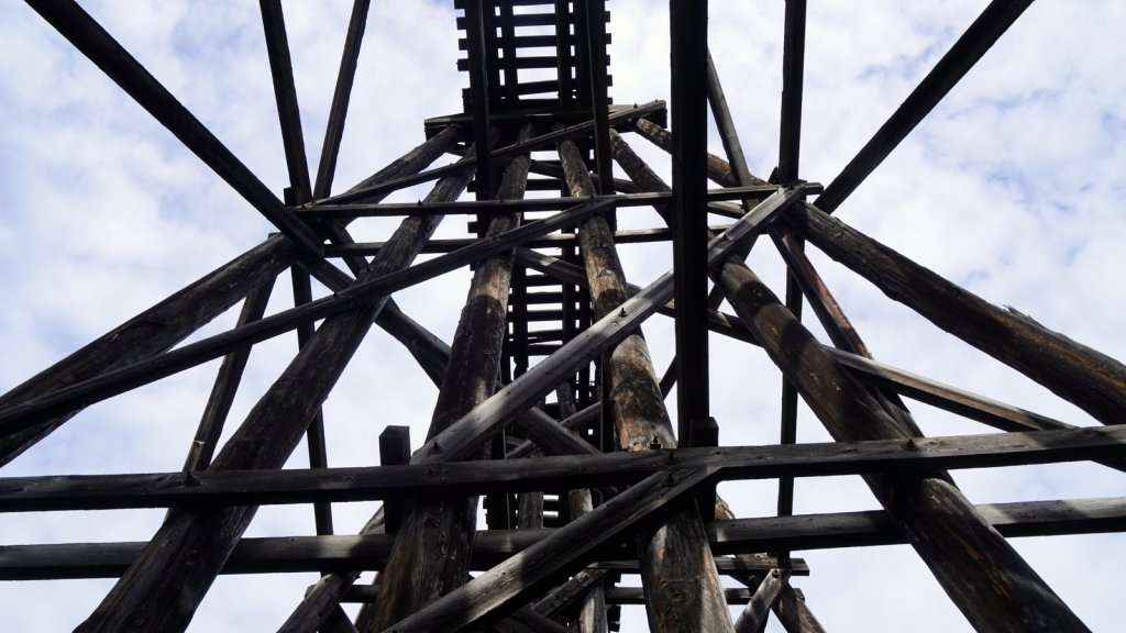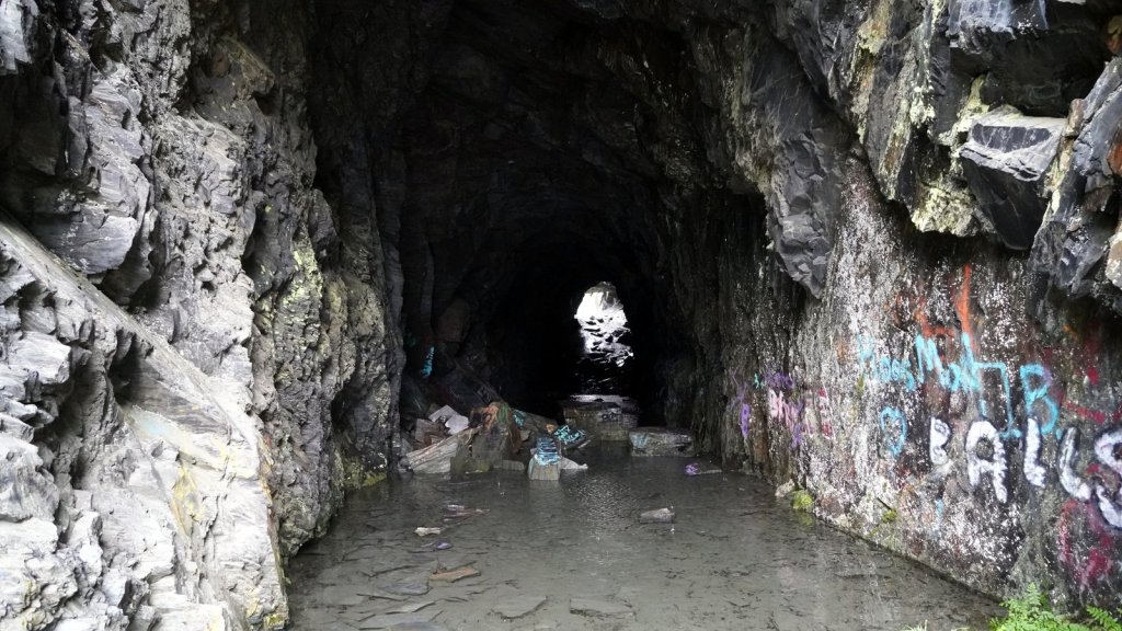 We made our way up out of the sound and over the mountains. Finally it stopped raining on the other side of the pass. From several people we heard that the Wrangell range near McCarthy is worth a visit. Moreover there is a pre 1938 Coppermine Kennicott nearby. It was a long drive following the Copper river and later the Chitina river though valleys in between the mountains. The first night we had a magnificent view down to braided and fast flowing Chitina river. The drive was over the rail bed of the old train line which the mine company had constructed, to ship the ore out to Cordova on the Gulf of Alaska, some 190 km away. Beside a narrow cut though a mountain outside Chitina and the remains of some high wooden bridges, you did not realise you are driving over an old rail line. The train bed has been improved to facilitate visitors, as a gateway to the Wrangell-St. Elias National park. Many people walked up to the artistic town of McCarthy or take the provided free shuttle bus. (You need to leave your vehicle by the foot bridge as no one is allowed to drive further from the parking lot). And then take the next free shuttle bus up to the mine. From there you can walk to one of the glaciers coming down the 4982 m high Mnt. Blackburn. You can either walk there yourself or take a one day guided tour which take you to the glacier and with provided crampon walk on it. We did not do the walk to the glacier but instead spent our time exploring the remains of the extraction plant of the Kennicott mine. Much of the red painted wooden structure is still standing since it was abandoned in 1938 when the ore ran out. Several buildings have been cannibalised over the years and much of the equipment has been removed. It is now a historical site and what is left is being preserved. When discovered around 1905 the ore was one of the riches ever found. The ore was however high up on the mountain where the volcanic green stone came in contact with the limestone above it. You can clearly see this from a distance. Three mines were developed into the mountain side just under the top with many tunnels to bring the ore out. The whole area was mostly covered with snow and the mill was actually situated at the side of the glacier. After an interesting afternoon exploring the ruins of the mill we drove out and camped at a small pullout next to a lake. The following day we drove all the way out and north following the Copper river. The banks of the river is sometimes 100 m higher than the river with many great views of the Wrangell range. Before arriving, we left the Copper river and crossed over the low end of the Alaska range back to Tok on the Alaskan Highway. We had already visited this town when coming over the mountains from Dawson City, Canada. We had a much needed shower and drove off to an uninteresting camp spot on an abandoned section of the old Alaskan Highway some 24 km outside town.