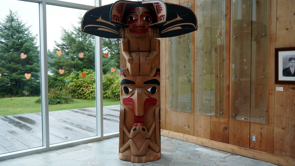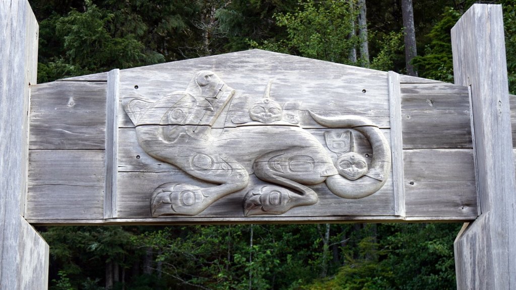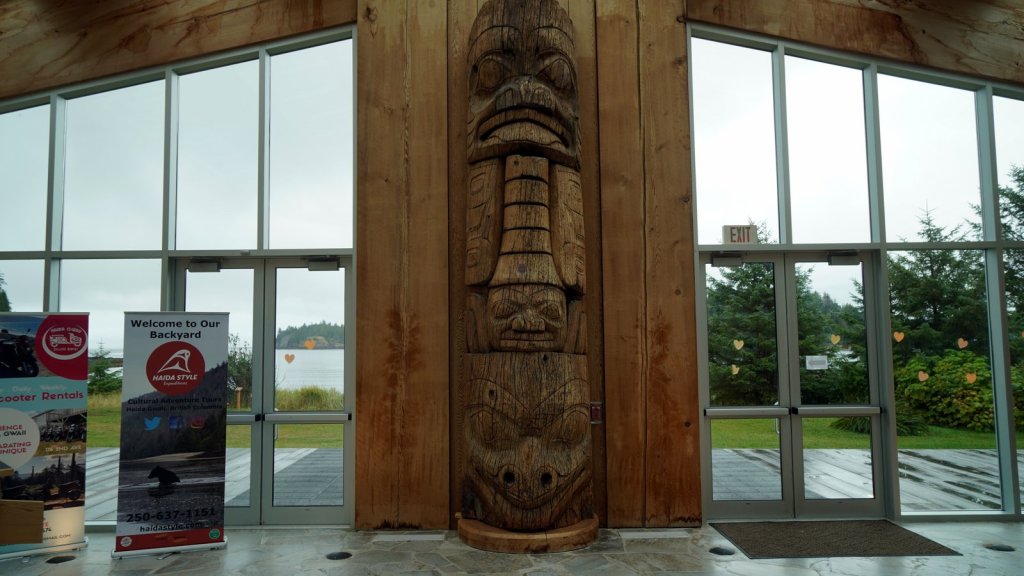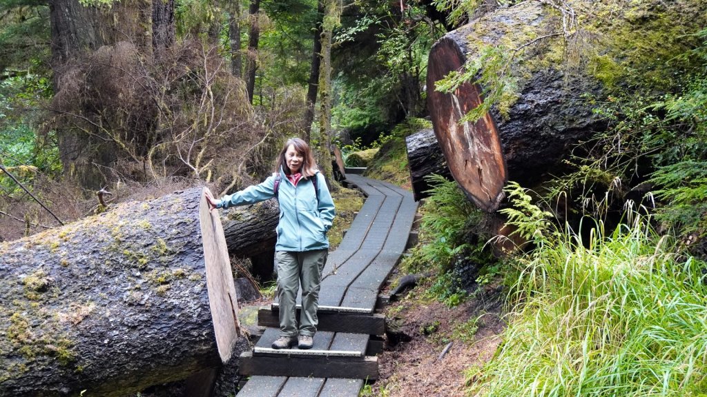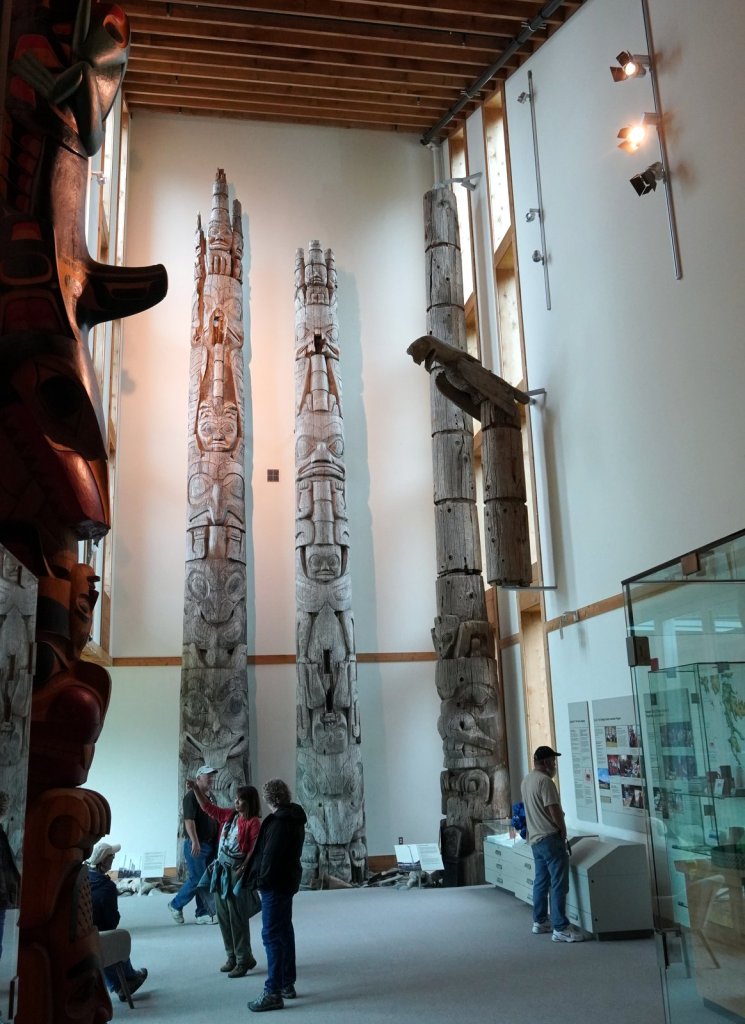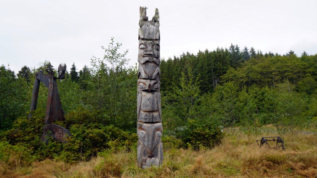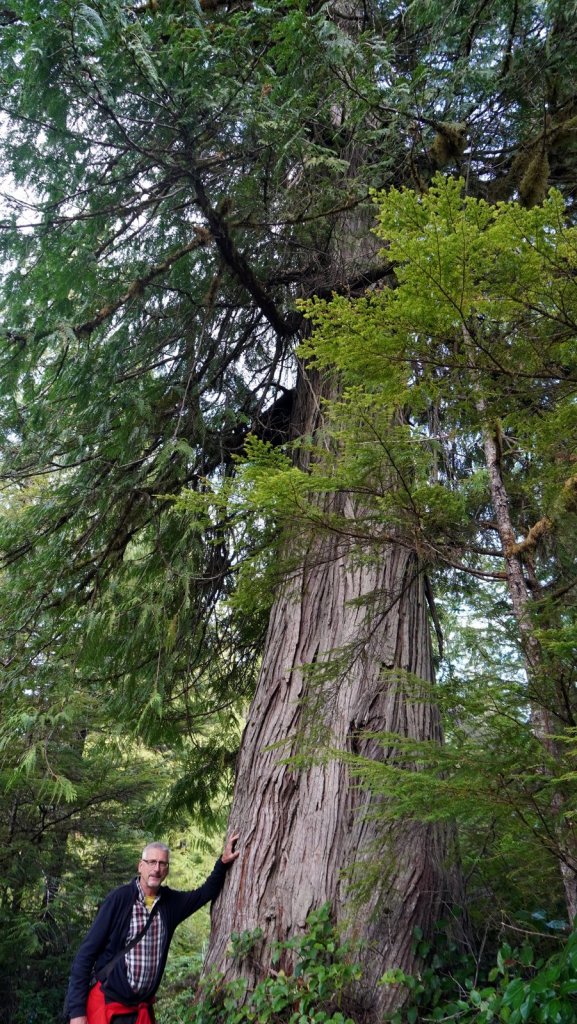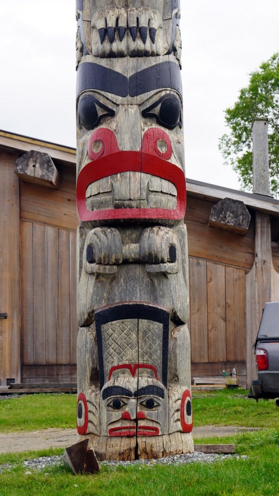 The last day on the island was rainy (again). On the way back to the ferry, we stopped at various towns along the road. Most towns have a large native presence which is obvious by the community houses with totem poles in front of them. In Port Clements, we took a detour to walk the Golden Spruce trail. Once a golden coloured spruce was standing here along the river. An environmentalist made a large cut in the tree trunk so it would fall by the next storm. He was protesting against the ongoing logging of old growth trees on the island and that only token groups of trees were left behind for tourists. So he decided to take away one of the main tourist attractions (The Golden Spruce) suggesting that there is more to a forest than a few token trees. (We got this information from the newspaper clipping in the museum in town). The Golden Spruce trail was again an impressive trail through old, large and tall magnificent trees.