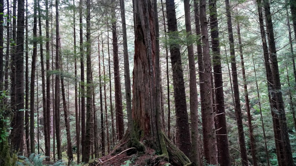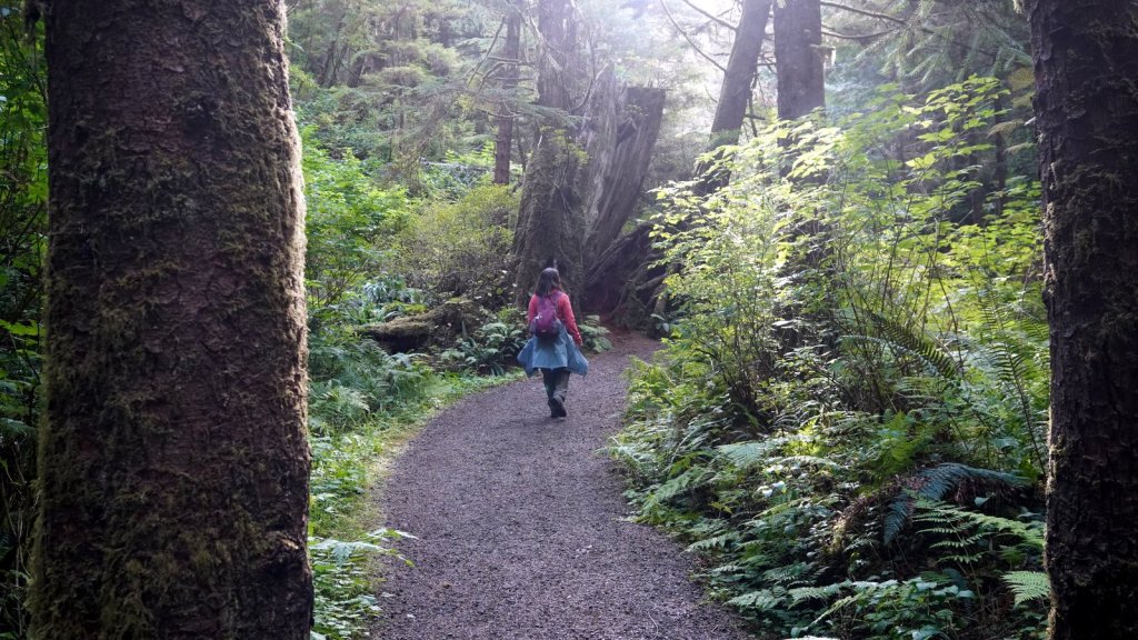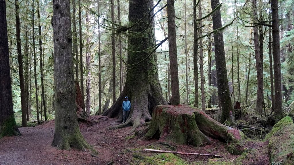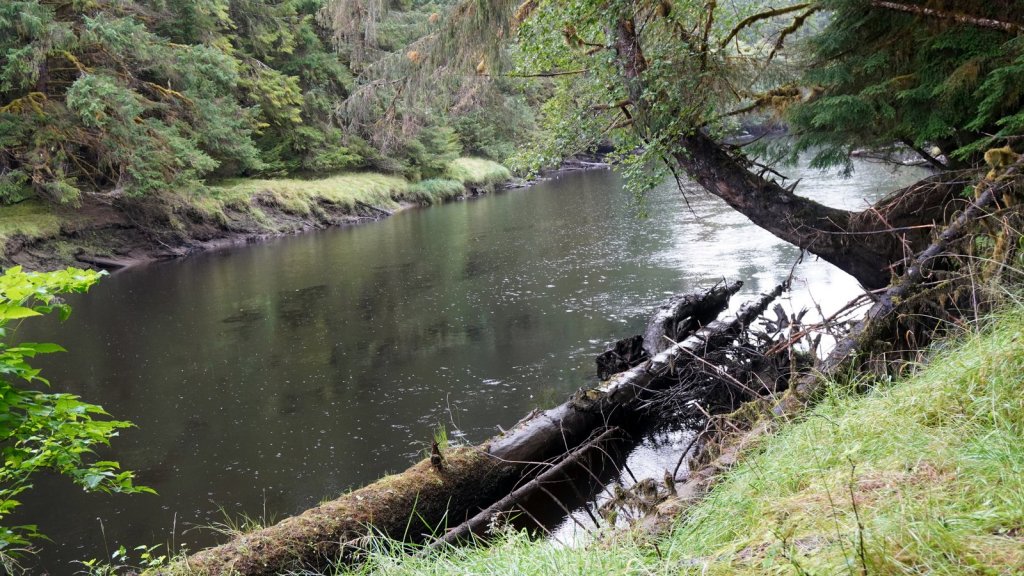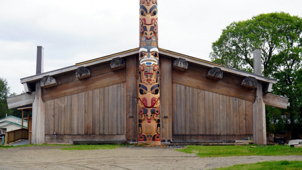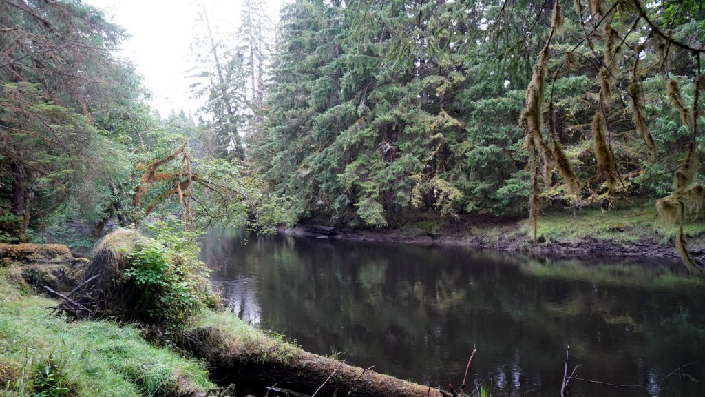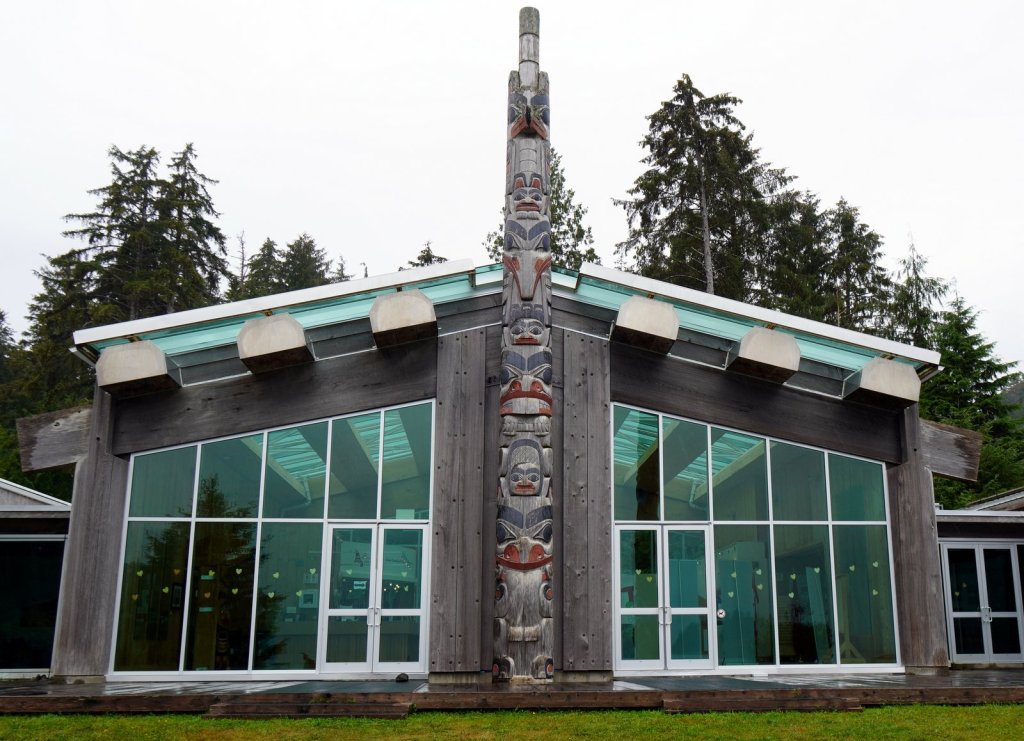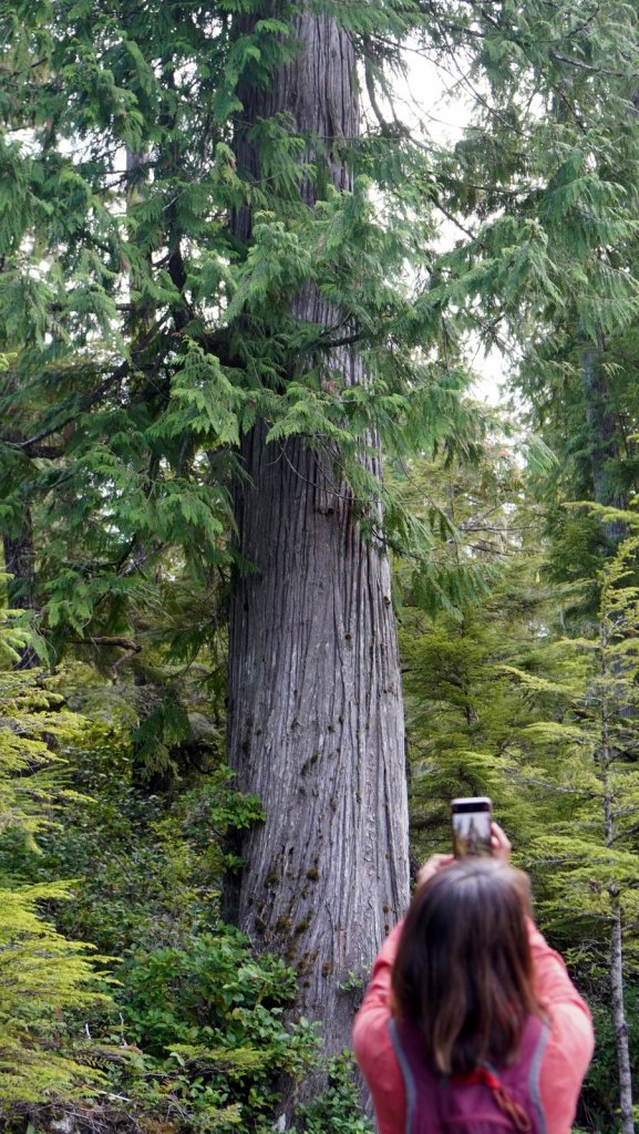 The last day on the island was rainy (again). On the way back to the ferry, we stopped at various towns along the road. Most towns have a large native presence which is obvious by the community houses with totem poles in front of them. In Port Clements, we took a detour to walk the Golden Spruce trail. Once a golden coloured spruce was standing here along the river. An environmentalist made a large cut in the tree trunk so it would fall by the next storm. He was protesting against the ongoing logging of old growth trees on the island and that only token groups of trees were left behind for tourists. So he decided to take away one of the main tourist attractions (The Golden Spruce) suggesting that there is more to a forest than a few token trees. (We got this information from the newspaper clipping in the museum in town). The Golden Spruce trail was again an impressive trail through old, large and tall magnificent trees.