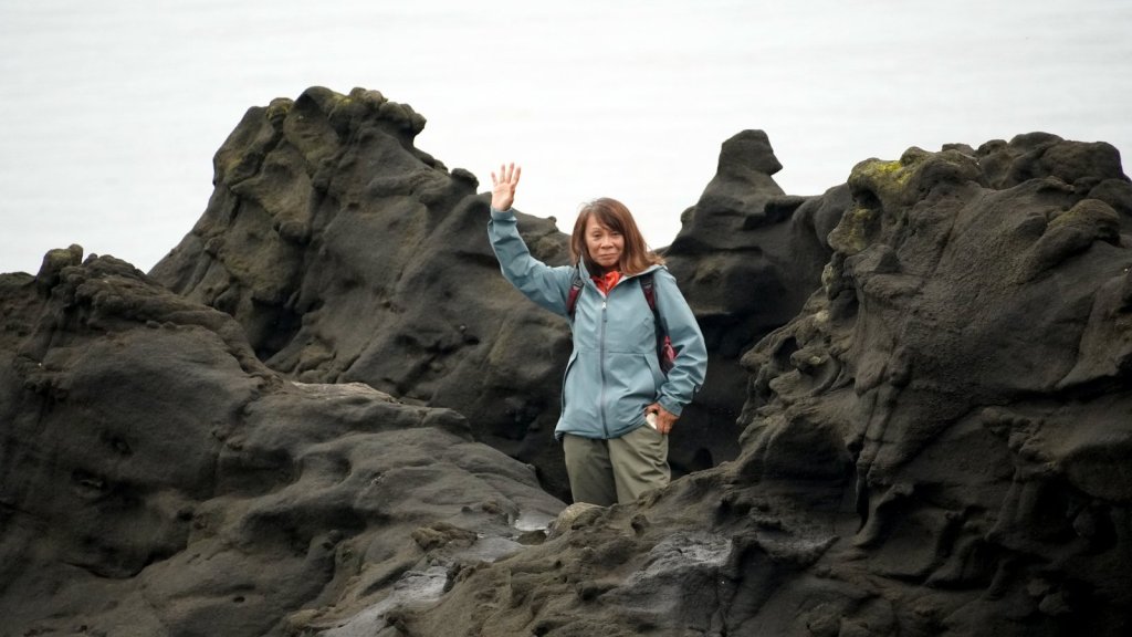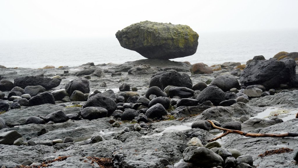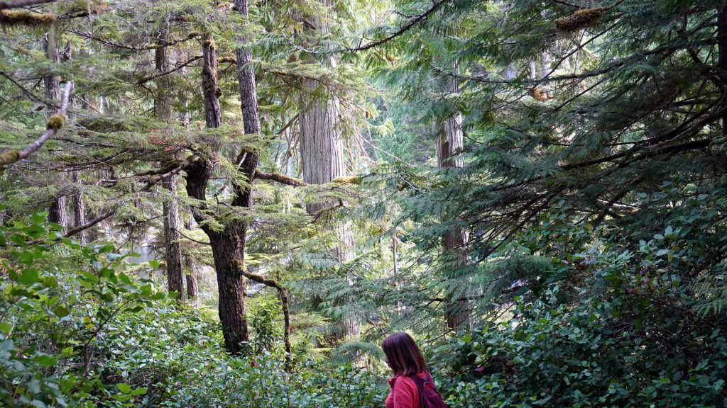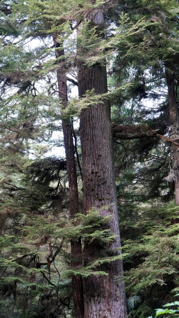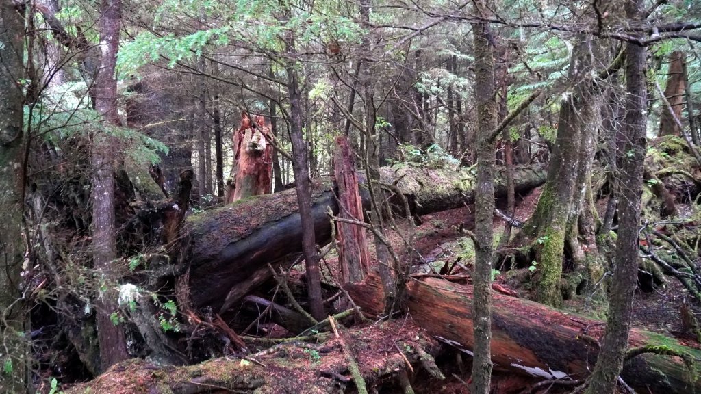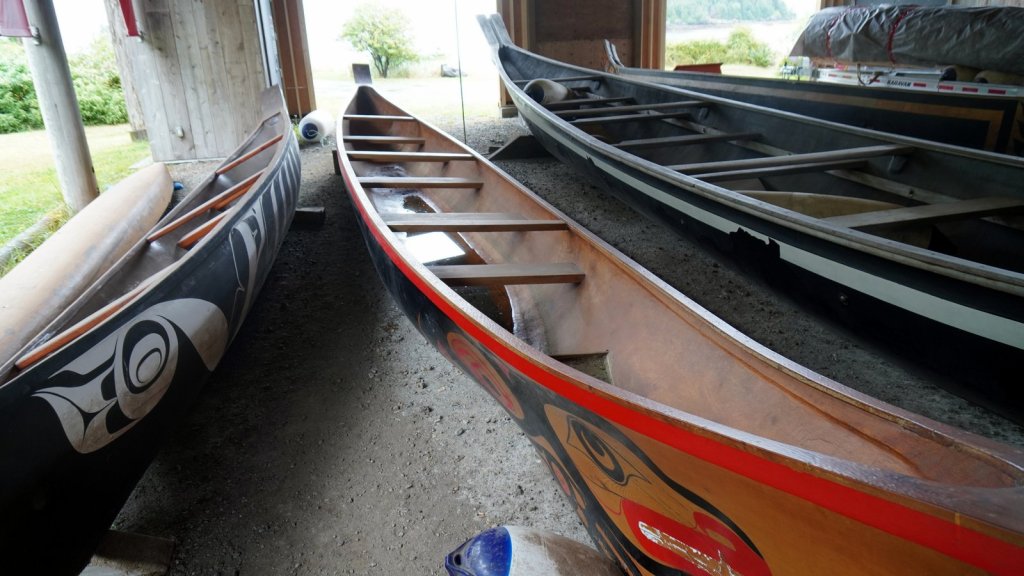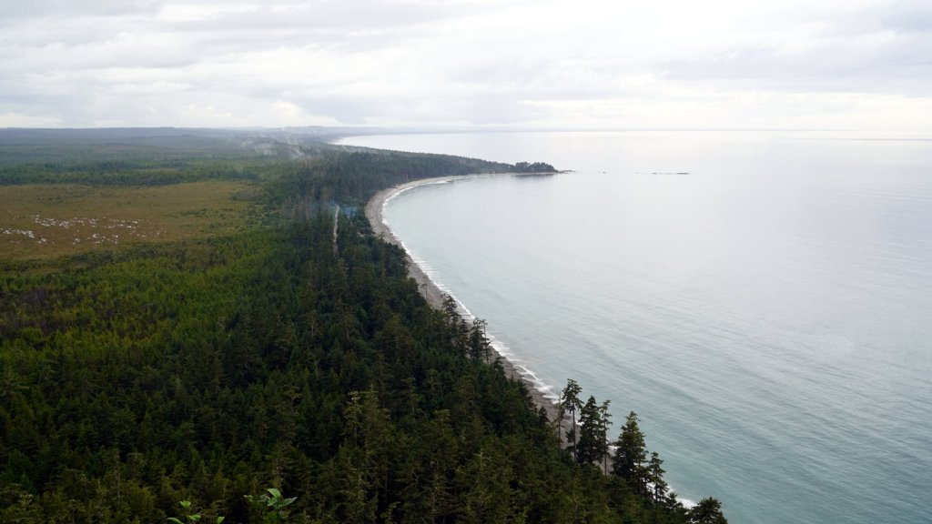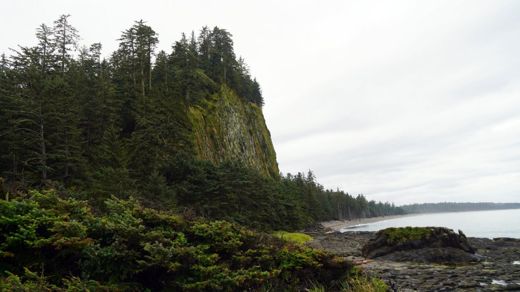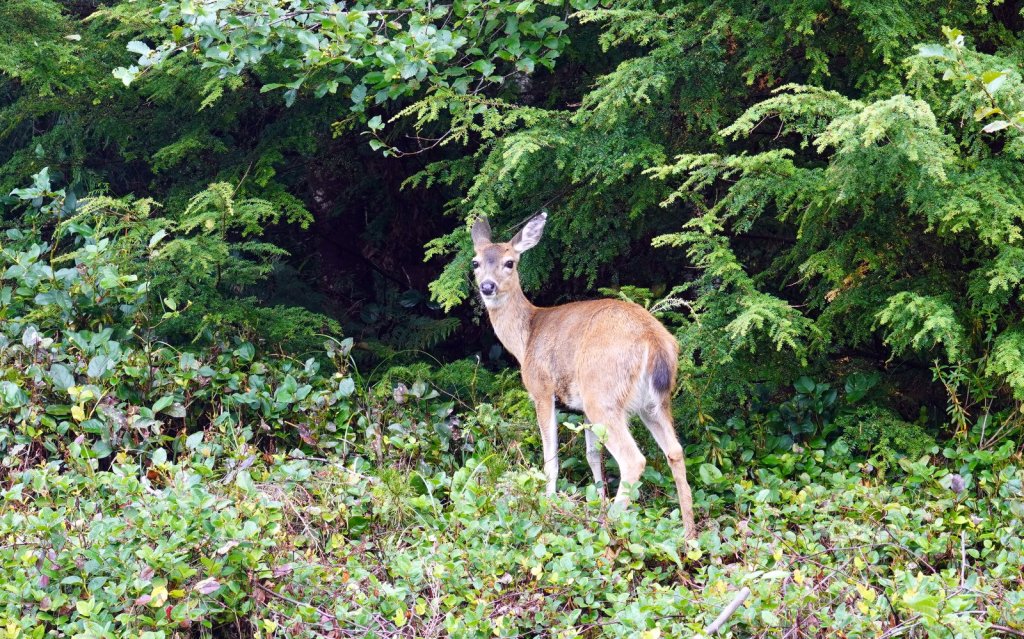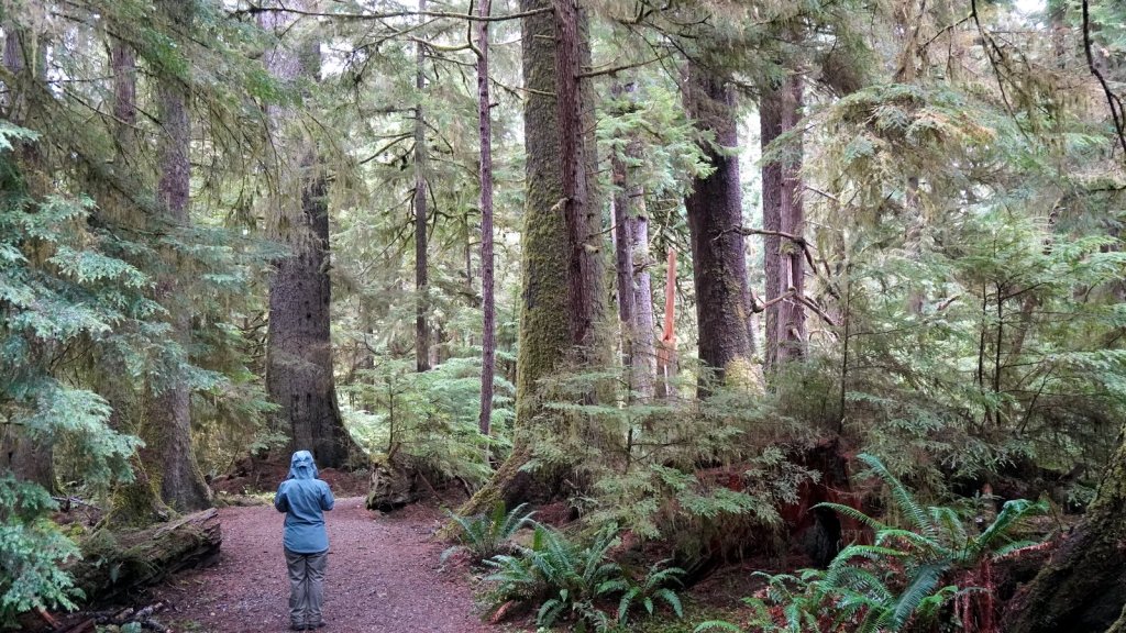 We spent 3 nights on the main island of this archipelago. The islands were never invaded by large amounts of fortune seekers. However they did experience the devastating effects of European diseases and missionaries who did not appreciate the local customs and had many of the traditional totem poles cut or burnt. These poles stood in front of every long house in which several related families lived. There is a strong movement on-going to revive the old culture. New totem poles are created and raised in front of shops, hospitals and other buildings. Beside experiencing the revival of the old culture we also came to the island to see the old growth temperate forests with many large trees (Western hemlock, Sitka spruce, Lodgepole pine, Western red-cedar). Each day we made a walk through these forests at different sites (Spirit Lake, Tow hill/Blowhole trail, Golden spruce trail). Not only are the trees big but also the undergrowth is full of fallen trees. overgrown with moss and serving as base for other trees to grow on top. The forest floor is therefore very bumpy. At the north of Graham Island we drove along a bay towards Rose point. The narrow well maintained sand road cuts through the primary forest and from the car you can see the large 300+ year old trees standing proud in between their many offspring. The main 100 km road on the island is wider and has a wide grass shoulder. Therefore the trees on each side are not visible because there is enough light for bushes to grow. At the end of the road there is a boardwalk through the forest to the bay. At high tide there should be water spouting up through “blow holes”. We were at the wrong time. There is a well laid out climb to the top of a cliff (tow hill viewpoint) overlooking the bay. Again you followed a path made of planks. Otherwise it would be difficult to walk through the forest with all its fallen and overgrown trees. The night was spent at a provincial park campsite right on the pebble beach underneath the trees. If it was not for the rain it would have been the ideal place. But it cleared up later in the evening and we were able to enjoy a nice sunset and a campfire (courtesy of our next door neighbour who had kindly donated some firewood).