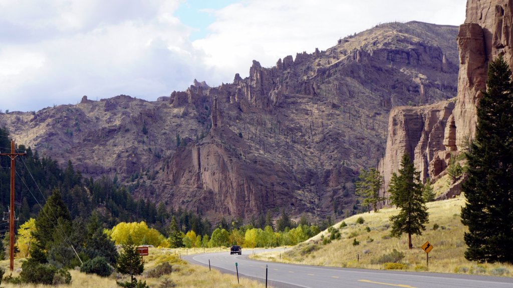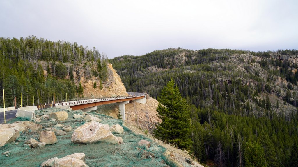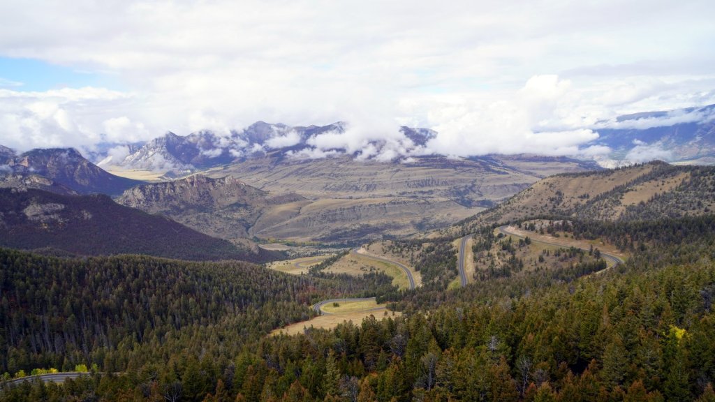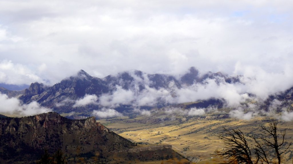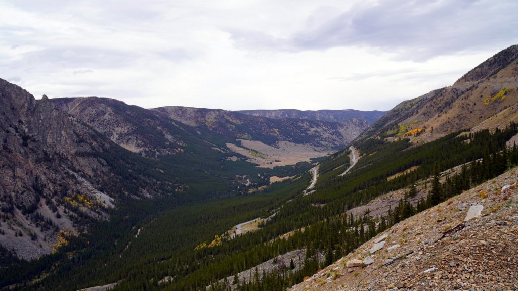 We followed Hwy 90 going east. This highway is the northern most Interstate across the US going from Boston to Seattle. It is busy and full of large trucks. Where there is a climbing section there is fortunately an overtake lane since our small 100 Hp engine has trouble getting up some of the steeper slopes. Based on recommendations from other travellers we met along the way, we turned off the highway at Columbus to go south to Red Lodge. This town is an accommodation town for visitors entering Yellowstone from the North east. However this entrance is closed because the road was washed out during a huge flood in June. The town itself had also some damage. After Red Lodge the Beartooth highway starts. This is a very scenic road climbing up the mountains towards Beartooth pass at 3338 m. From many point along the road you can look back down the valley and see how the road snakes up the mountain. On the other side of the pass you first stay a while above the 3000 m. The area is windswept and cold. No trees grow here. After a while you start to descend towards the closed (Northeast) park entrance. We found a secluded campsite at 2300 m on the Crazy creek with a view of Beartooth mountain.