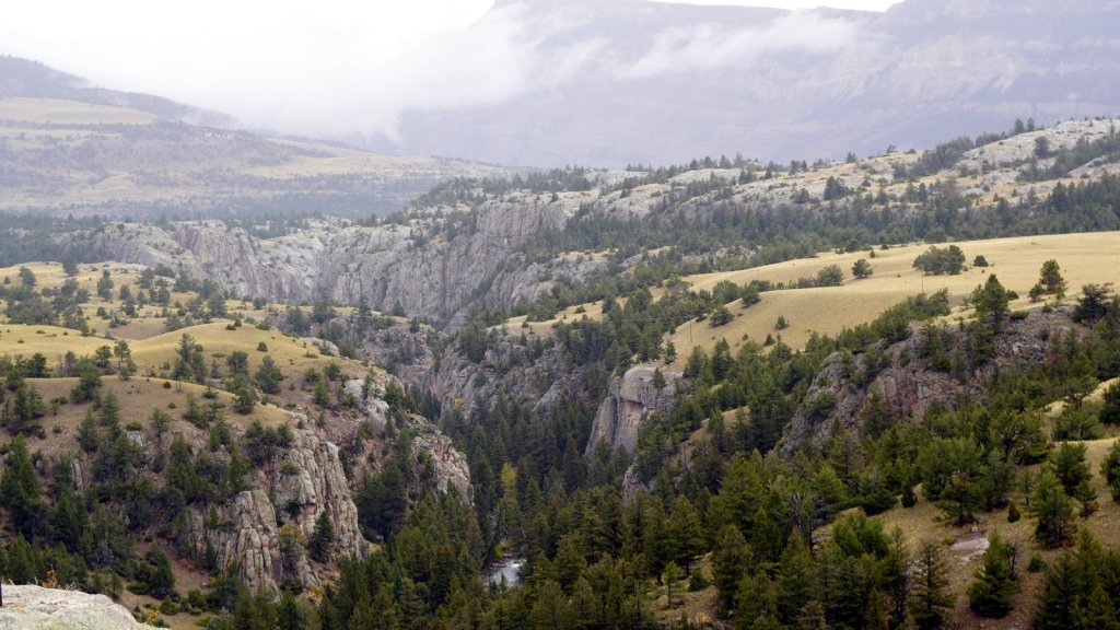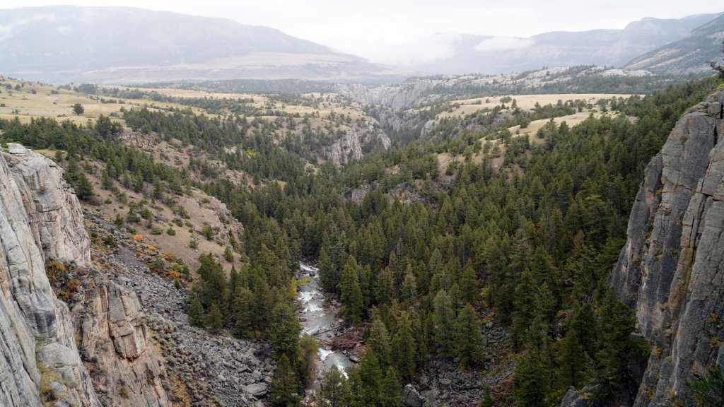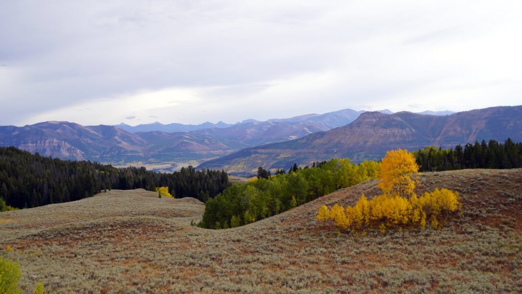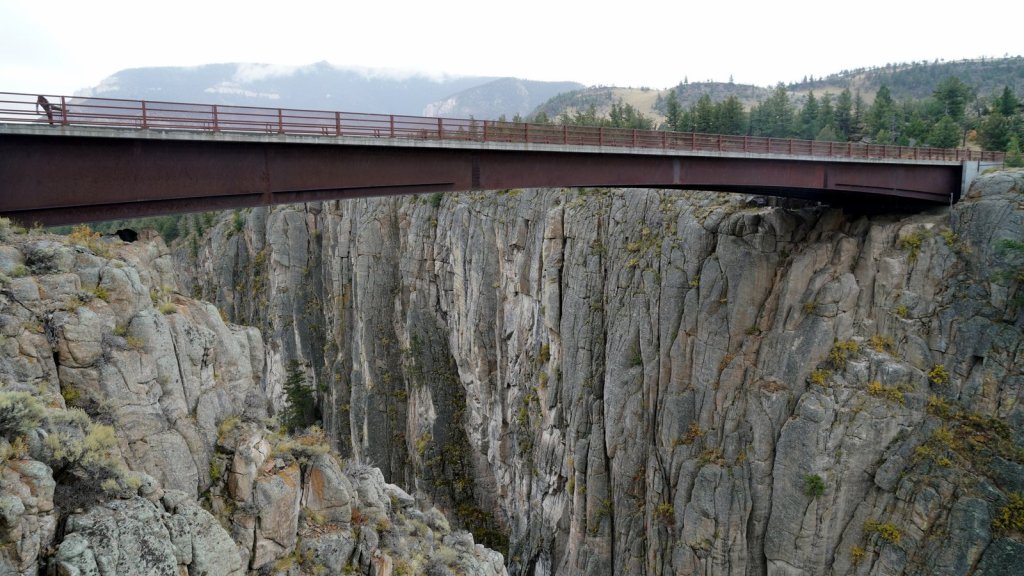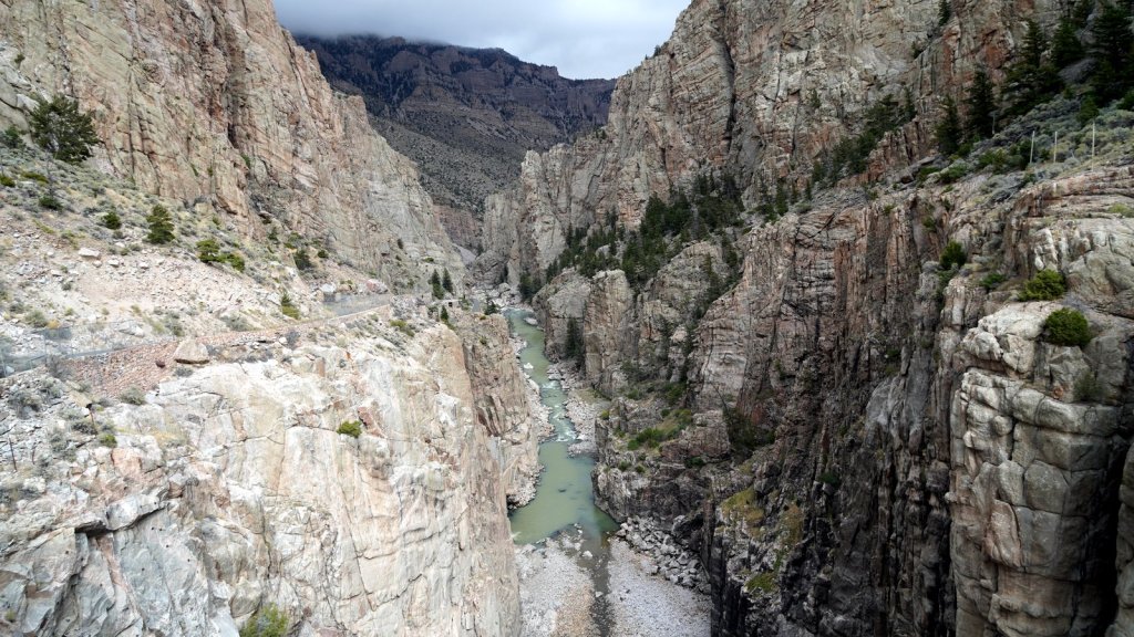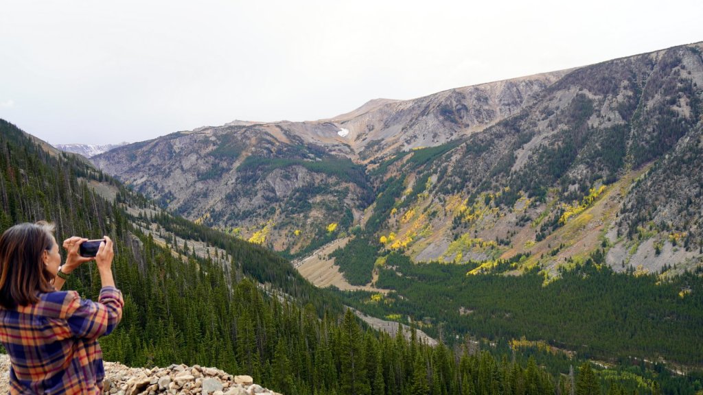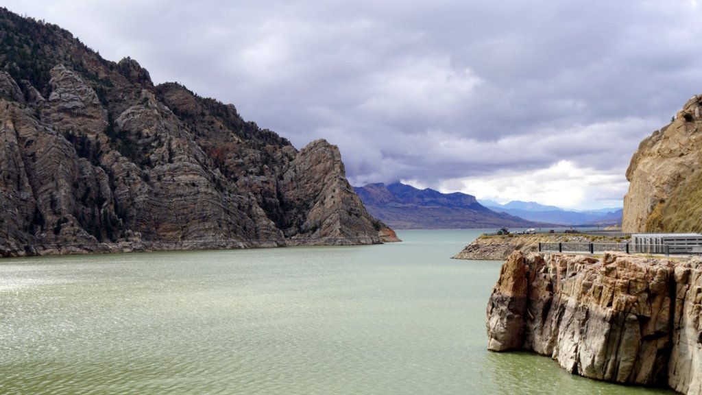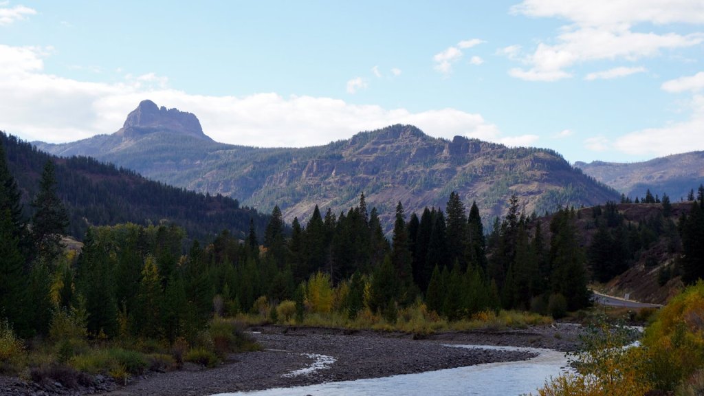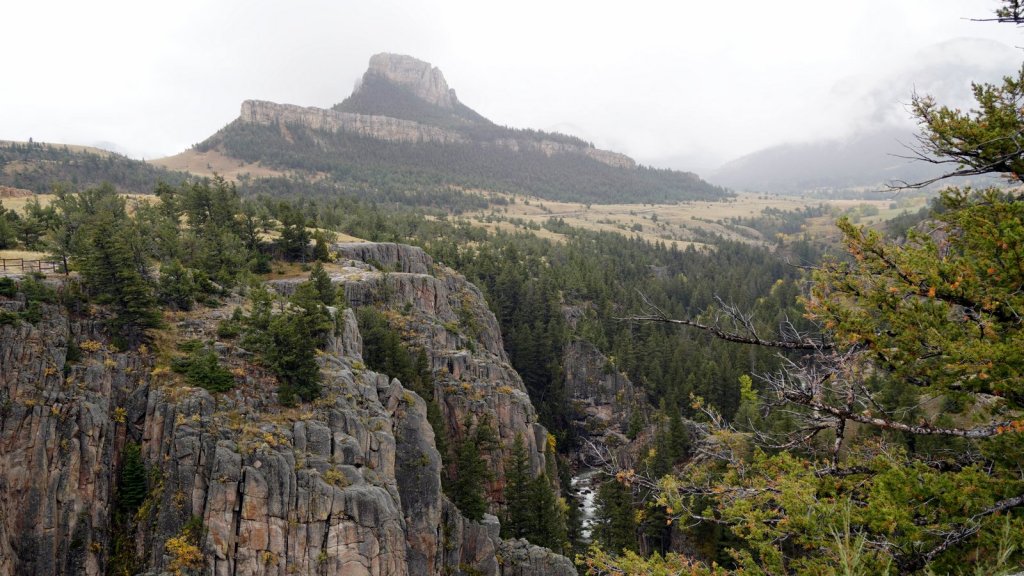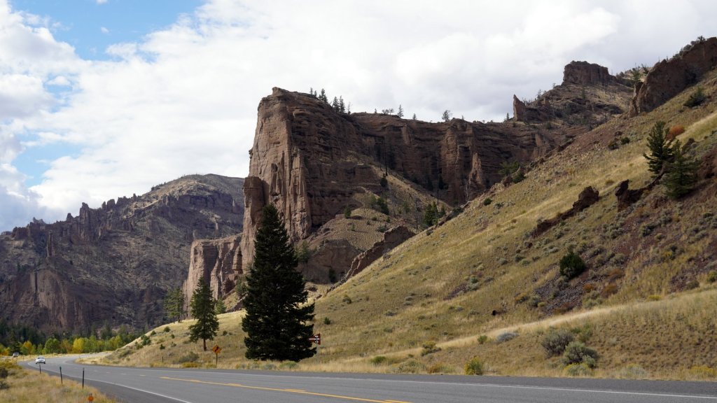 The following day we took the Chief Joseph highway towards Cody. It was a cold and wet day. It had rain last night. This section of the road crosses one of several Yellowstone river gorges going down towards Cody. Another great scenic road with lots of switchbacks. After a Taco lunch in Cody, we drove towards the east entrance of Yellowstone NP. Just outside town a dam was built in a narrow section of the Shoshone river gorge to create a water reservoir for irrigation of the land as well as to generate electrical power. At this time (1910) it was the highest dam in the world (>100m). We drove over the Sylvan pass (2675m) into the Yellowstone caldera with its large lake in the centre. To celebrate Jamaliah’s birthday we spent the night in the Lake Yellowstone Colonial Hotel.