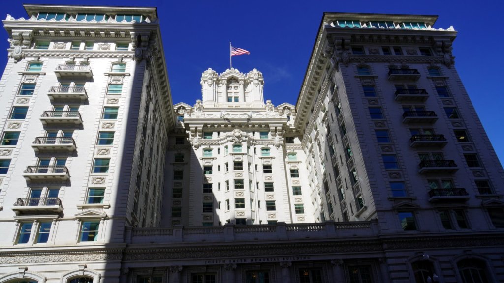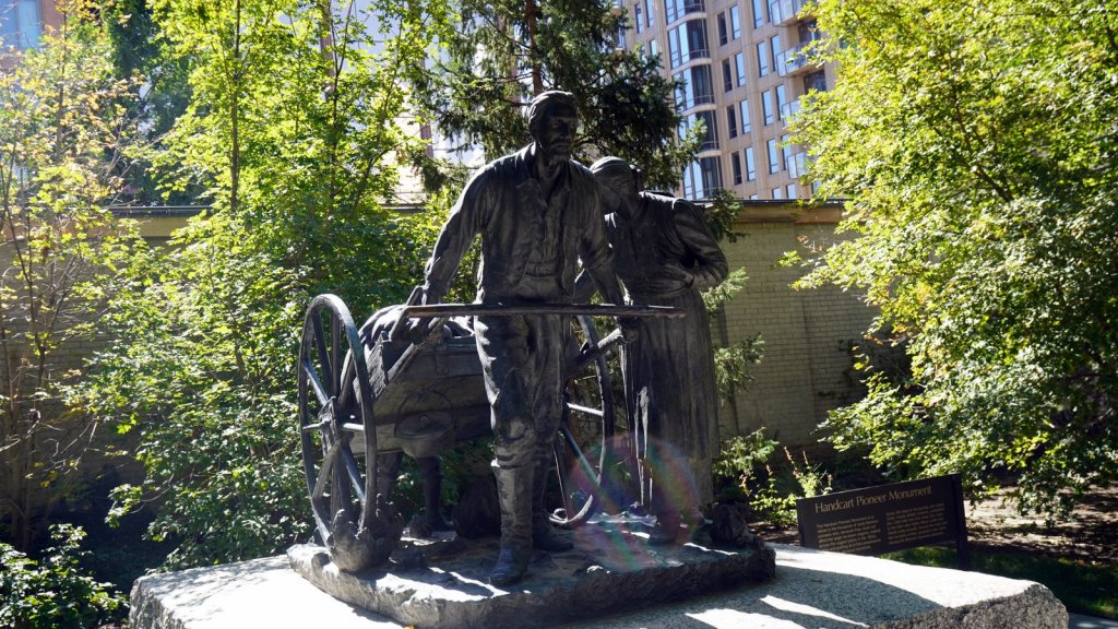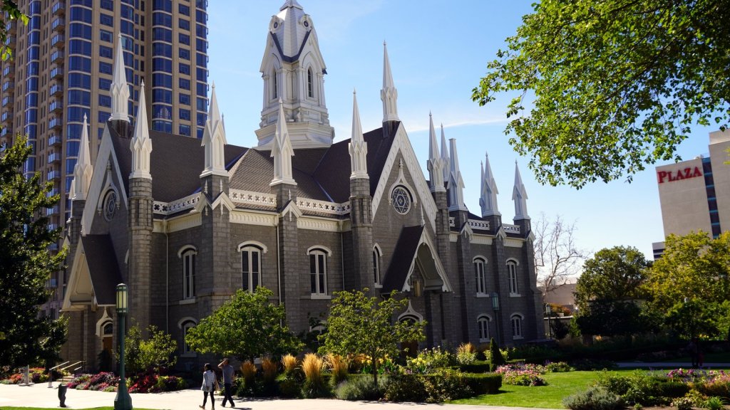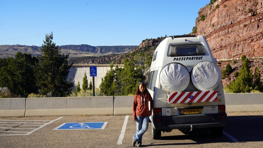 The drive from the campsite to the Salt Lake City was longer than we thought. We went up and over the mountain pass to the other side of the mountain where we camped on a motorway with one lane closed. Our camper is slow going up mountains so we had a long tail behind us. Because we entered the city area from the south we drove some 50 km through all the outskirts of Salt Lake City before reaching our objective: The Mormon temple in the heart of the city (actually way up on the north side.) While looking for the temple we met 2 young sisters who were happy to guide us to the temple plaza. Many young Mormons do 1 ½ year of voluntary community work. Some are sent around the world while others serve in and around the temple complex. The 2 sisters handed us over to 2 other sisters whose task was to give tourists a tour of the 2 church buildings open to the public. The smaller church is there for praying and the large hall of singing, lectures etc. The main temple is not open for the uninitiated and also was not visible due to restoration work. The atmosphere was very pleasant and the sisters did their best to explain the principal of their religion. (It is based on the book of Mormon which was revealed to Joseph Smith in 1826 which describes, like the old testament in prophet stories/books, what happened to a group of believers which ended up in South America some 600 BC and includes the teachings of Jesus Christ. The group started in the New York area but was slowly chased (persecuted) out of the east of the country and moved to the unoccupied Salt lake area in the west, which was just purchased from the Spanish. There they settled and flourished, even today.) Across the street from the temple complex is a modern temple complex. A very large modern shopping mall. The climate is such (dry and sunny) that most plaza’s are in the open air with the usual expensive shops around the plaza. We refrained from shopping and settled for the food court. We left the city late and drove again over the mountains back into the Rockies. There we found a campsite near a water reservoir. There are grass fields on the side of the hills dotted with large, unoccupied, parked RV’s. It looked like the owner parked their campers there on Thursday in order to reserve the spot for the weekend.