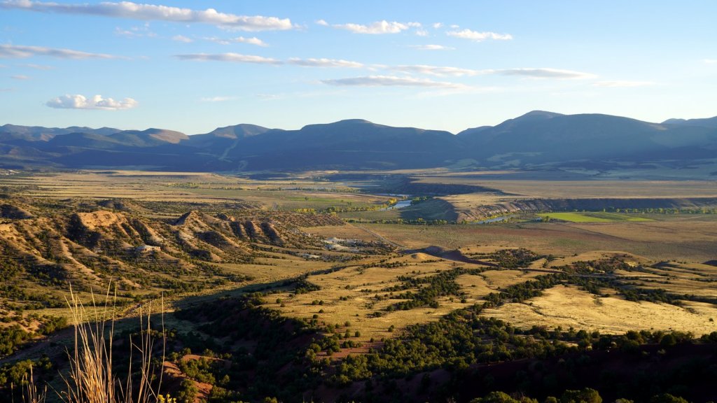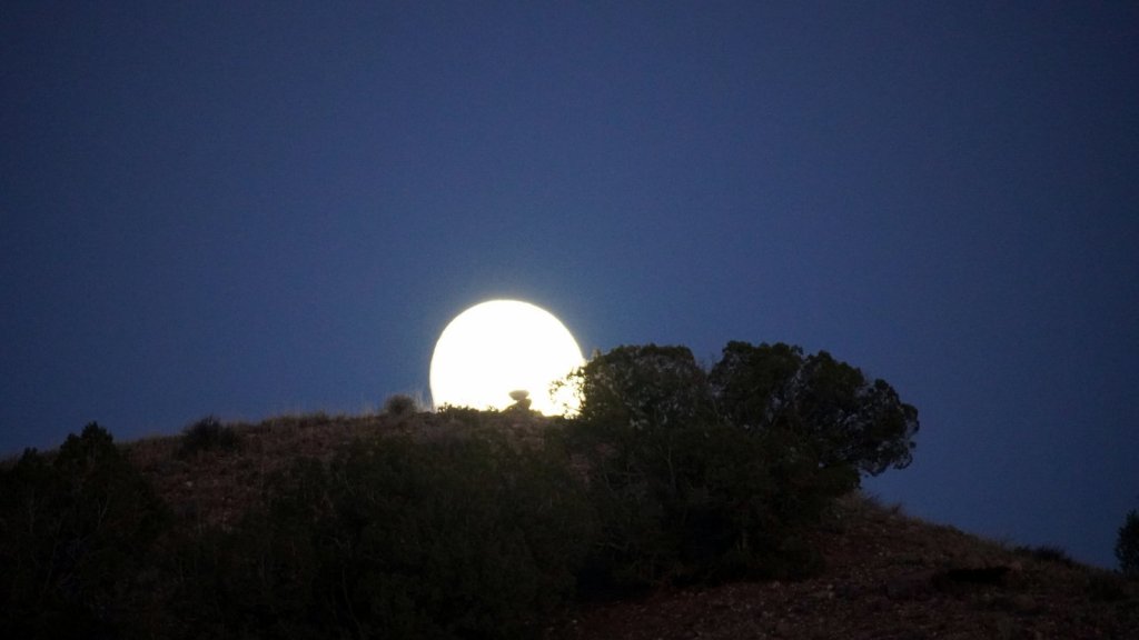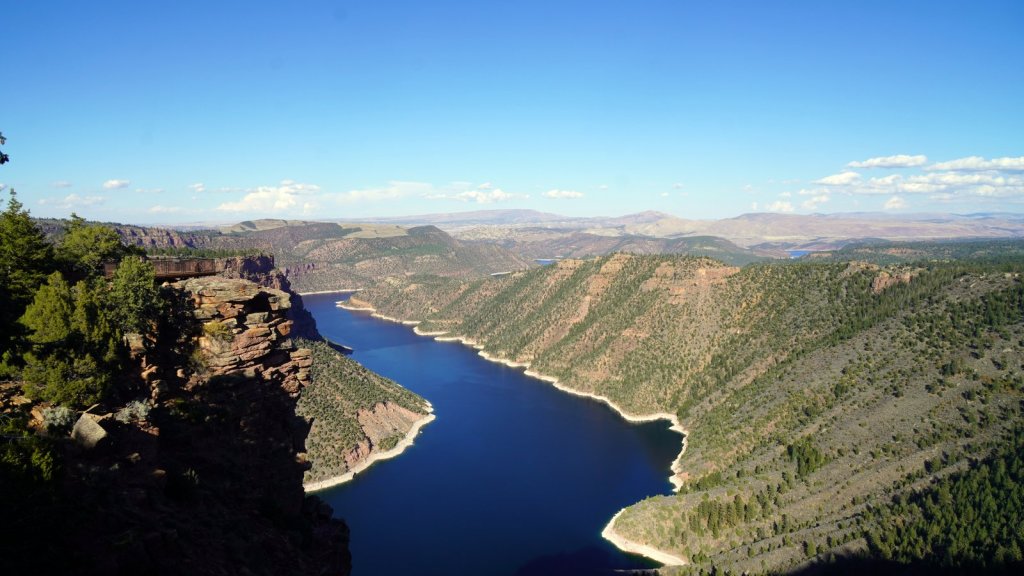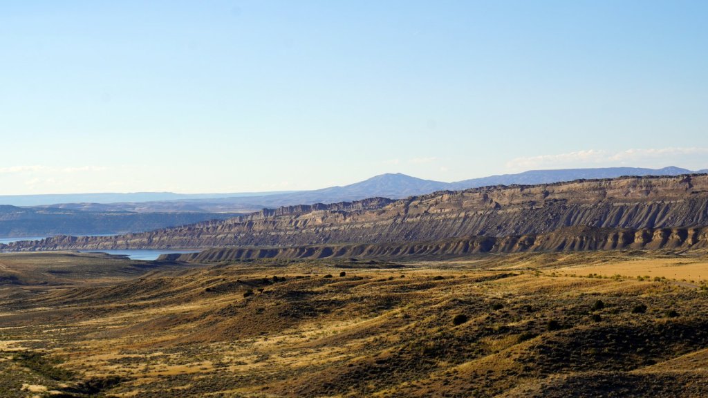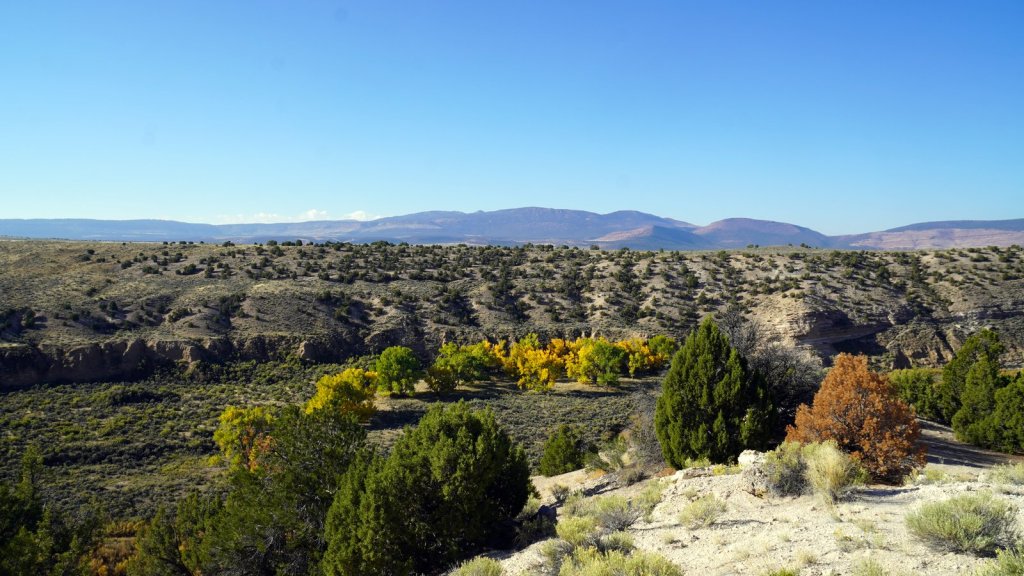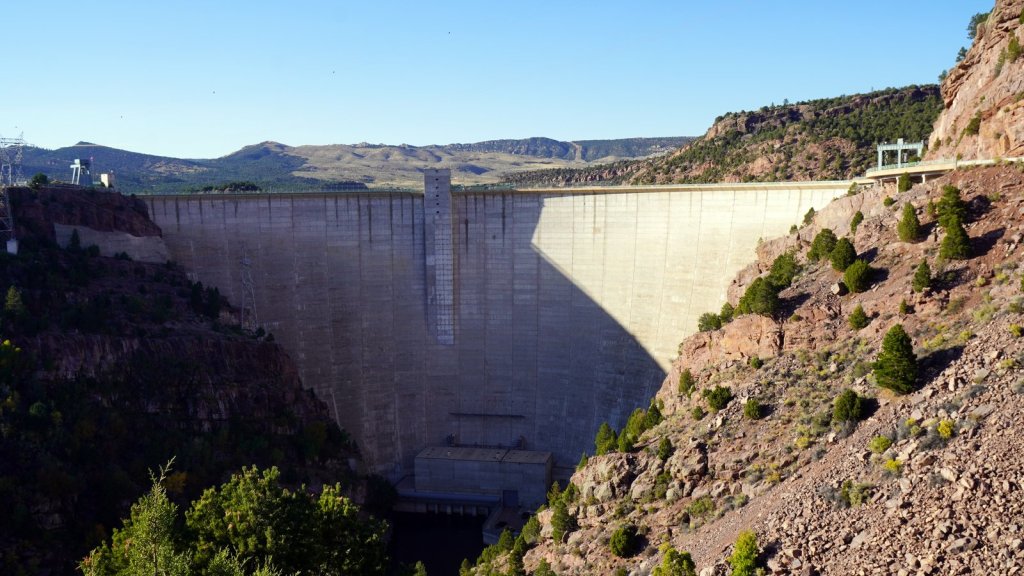 We followed the Hwy 40 further east into the mountains. At Vernal, we stopped and visited the Dinosaur museum. This is a fantastic museum showing the full range of fossils found in the nearby mountains. In one layer out of the Jurassic period they dug up many skeletons of Dinosaurs. But on top of that layer is a younger Cretatious layer which had fossils of many of the predecessors of the animals which populate the earth nowadays. For me the most interesting one is a heavy tank-built animal like a inodorous which had several horns with which they head butted like the modern elks fighting for the cows. After the museum, we decided not to drive to the actual fossil dig site but instead drove up the mountain through all the geological strata to the Flaming Gorge. In the gorge below us, a dam closes off the Green river (a contributor to the Colorado river) and forms a large lake. The cliff has several camping sites (mostly closed for the season) in a forest of nicely smelling Ponderosa pines. We had made an agreement to meet our friends in Boulder (550 km further) the next day, so decided to already make a start and drove down the mountain following another route. This was initially a very bumpy dirt road but once we crossed over the Wyoming state line back into Utah and later Colorado the road improved. I do not know if this is also due to the oilfield on the mountain slope we drove through. Before sunset many trucks pulling a fishing boat drove up the mountain. We had a lovely moon rise in the evening at this site which is on the shore of the Green river which had just come out of the bottom of the dam further up river.