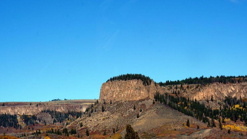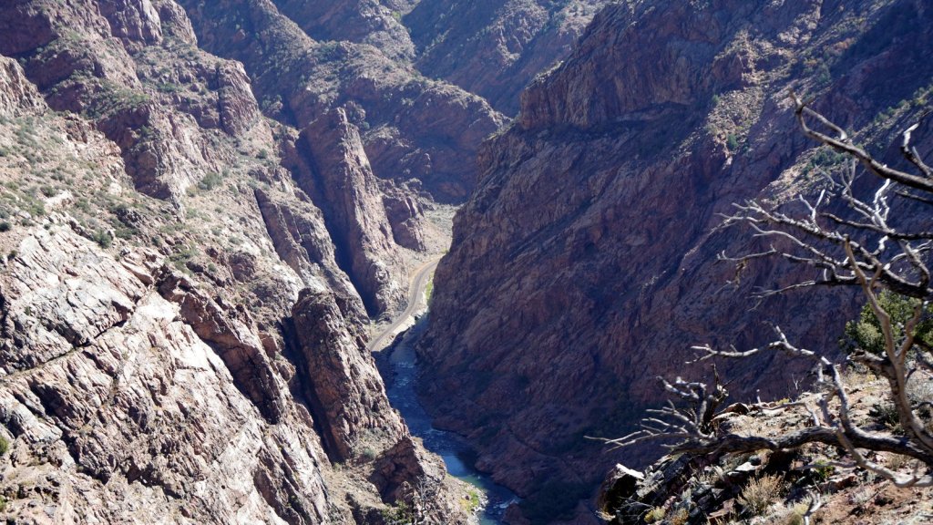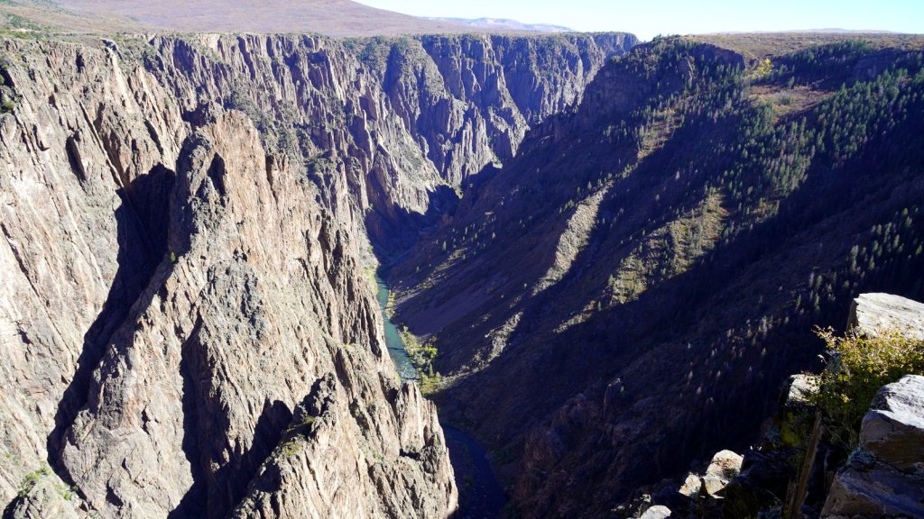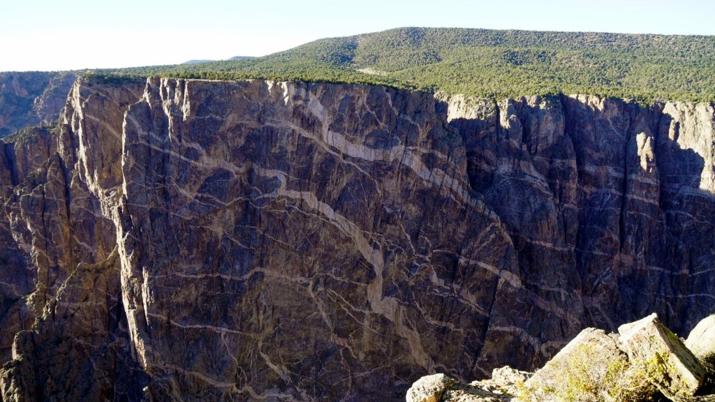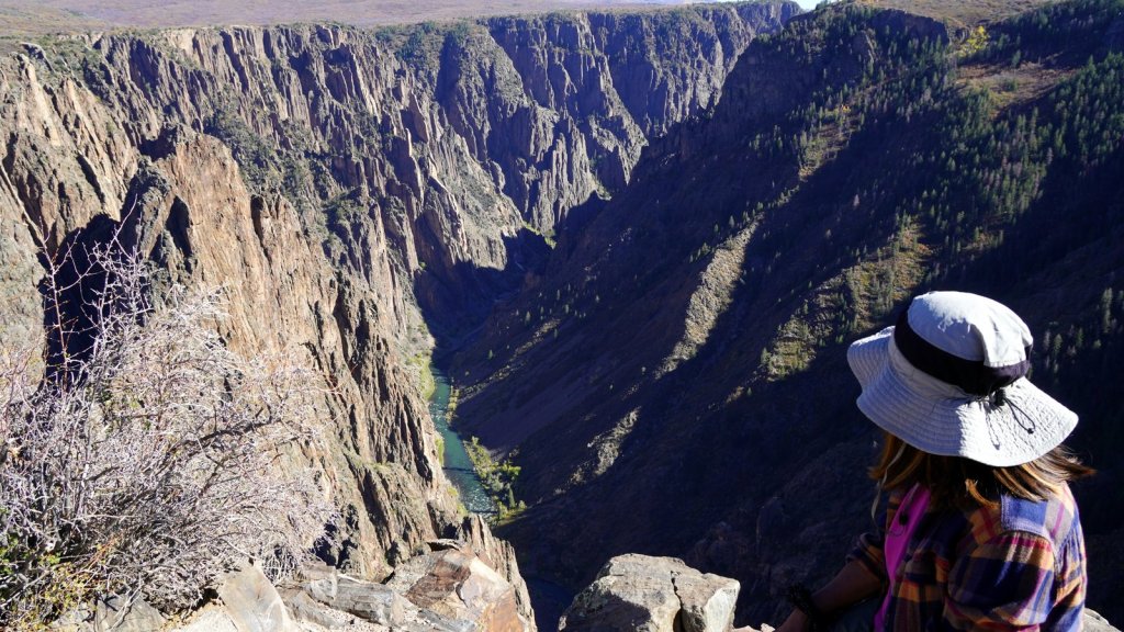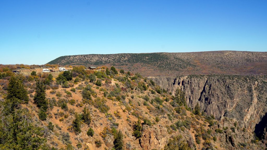 Yesterday we drove further east through the Rocky Mountains and stopped at the Black Canyon. Rich had recommended this stop and it is well worth it. We drove up and around the rim of the canyon and made many stops at the lookouts and at the end of the road, a walk to the end of the ridge where you could look towards the low green irrigated valleys with snow camped mountains in the distance. This canyon is black with colourful bands of pegmatite’s and gneiss waving though the black granite walls. You can descend into the canyon but cannot walk or canoe upstream through it. At the beginning of the gorge, the river is dammed and the water diverted through 5 mile tunnel to irrigate the prairie. The green fields can clearly be seen from the top. In the evening we camped just outside the park next to an American/German couple. This free campsite is under the trees in the rocky pine/juniper forest. The sites are not level so we were struggling to find a good spot, despite the levelling green plastic bricks we had bought some time ago. After sunset we joined the neighbours at the campfire and exchanged stories about our and their trip through Iceland. They had some magnificent daytime drone footage of the volcano outburst we had only seen during the night in the fog and rain. They also gave us some tips for things to visit on our way south west.