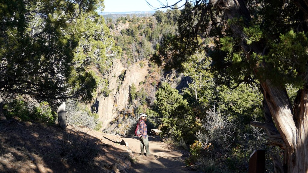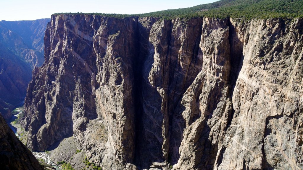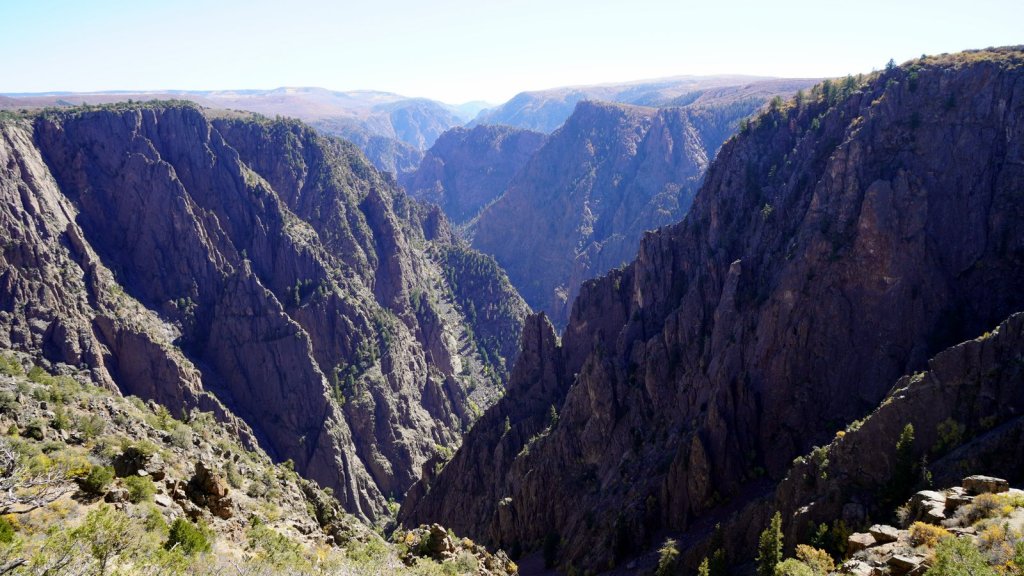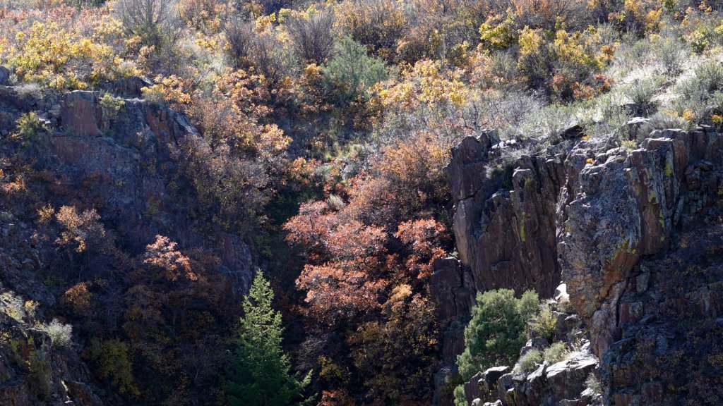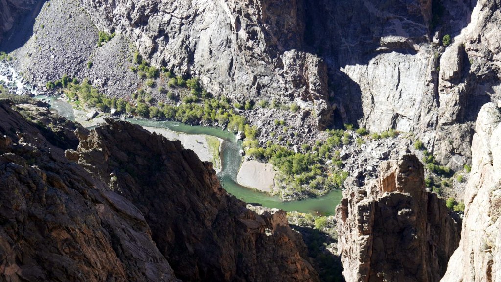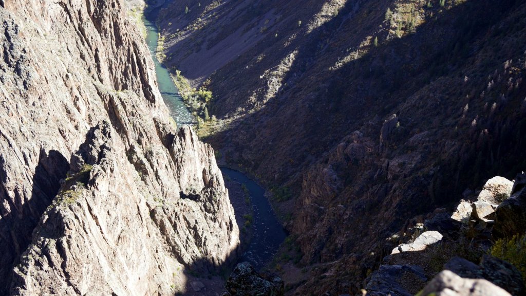 Yesterday we drove further east through the Rocky Mountains and stopped at the Black Canyon. Rich had recommended this stop and it is well worth it. We drove up and around the rim of the canyon and made many stops at the lookouts and at the end of the road, a walk to the end of the ridge where you could look towards the low green irrigated valleys with snow camped mountains in the distance. This canyon is black with colourful bands of pegmatite’s and gneiss waving though the black granite walls. You can descend into the canyon but cannot walk or canoe upstream through it. At the beginning of the gorge, the river is dammed and the water diverted through 5 mile tunnel to irrigate the prairie. The green fields can clearly be seen from the top. In the evening we camped just outside the park next to an American/German couple. This free campsite is under the trees in the rocky pine/juniper forest. The sites are not level so we were struggling to find a good spot, despite the levelling green plastic bricks we had bought some time ago. After sunset we joined the neighbours at the campfire and exchanged stories about our and their trip through Iceland. They had some magnificent daytime drone footage of the volcano outburst we had only seen during the night in the fog and rain. They also gave us some tips for things to visit on our way south west.