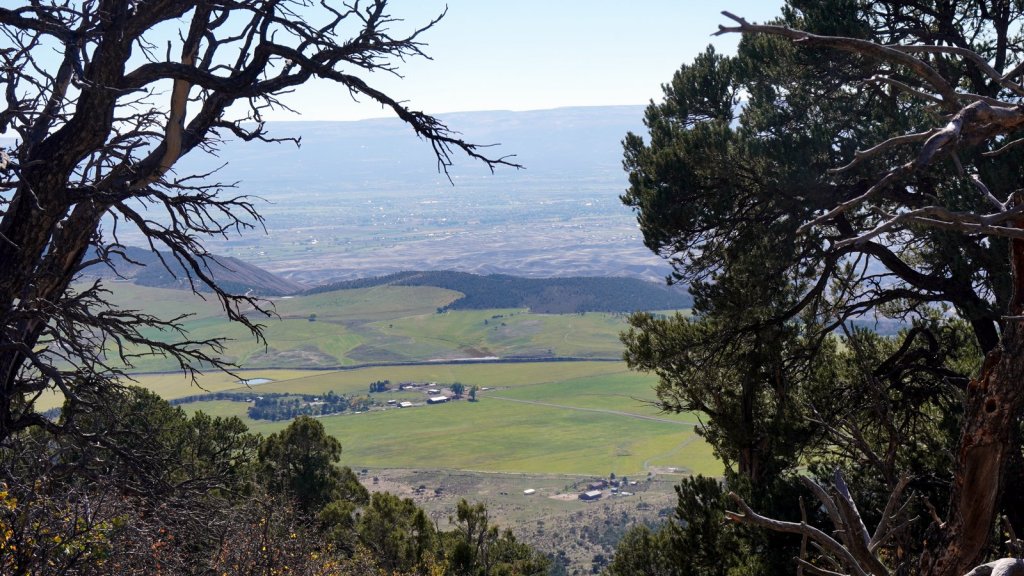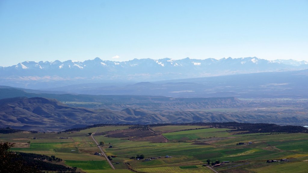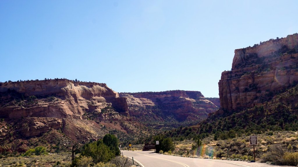 It was not too far to Grand Junction (junction of the Colorado and the Gunnison rivers). The landscape is dry and the rivers have cut away at the mountains. Particularly at Grand Junction, the Colorado river has cut through the red colour sandstone to create the Colorado National Monument. Our “America the Beautiful” pass gave us free access. We bought this pass in Alaska and it is valid for 1 year in all US national parks. Since park entries vary from $20 to $35, you quickly recuperate the $80 that the pass cost. At our first attempt to enter the park, we heard a weird scratching sound coming from underneath the camper. It felt like something was wrong with the rear brakes. We found no stones but one of the break disks was very hot. We drove back into town and were lucky to find a garage open on a Saturday. They were willing to have a look but did not give us much hope. One of the right rear brake pads was worn out and steel was scraping on steel. The other pad was hardly worn. Obviously the hydraulic system was not functioning well. After some lubrication the cylinder worked. One of our spare brake pads was installed and we were all good to go again. What a relief that we could get it fixed so quick. It was getting late when we re-entered the park and so we drove straight to the park campsite. Again we were lucky to get a spot (with a view down into the valley) since this is one of the main attractions in this area and fills up quickly in the weekend.