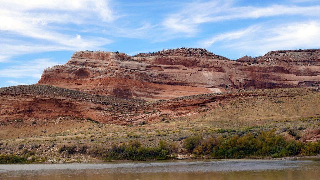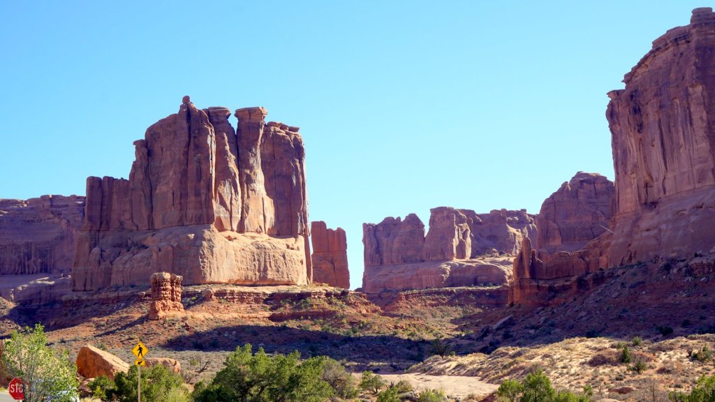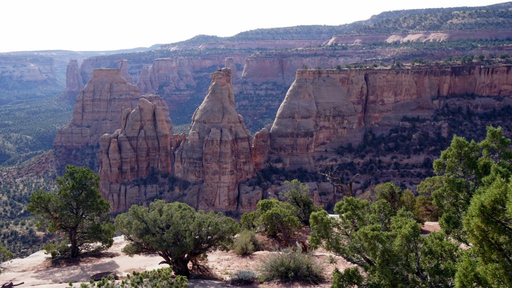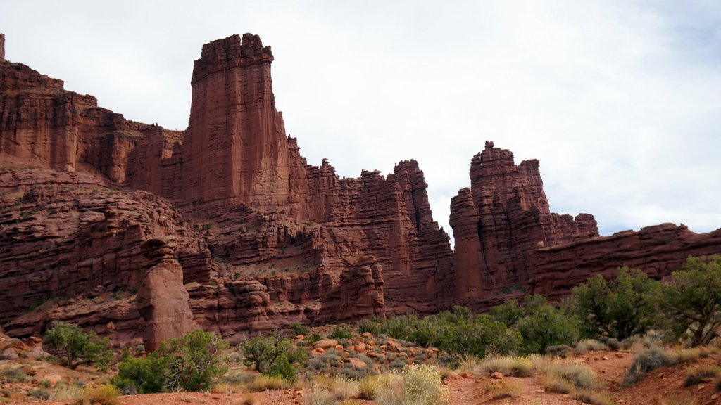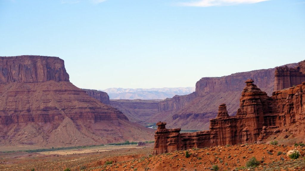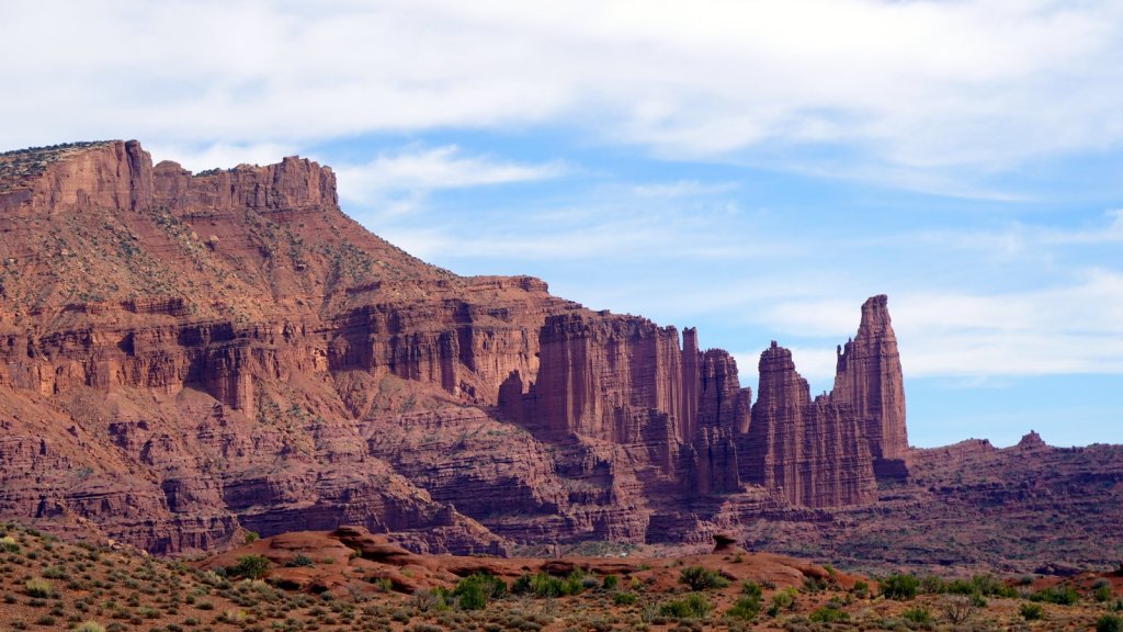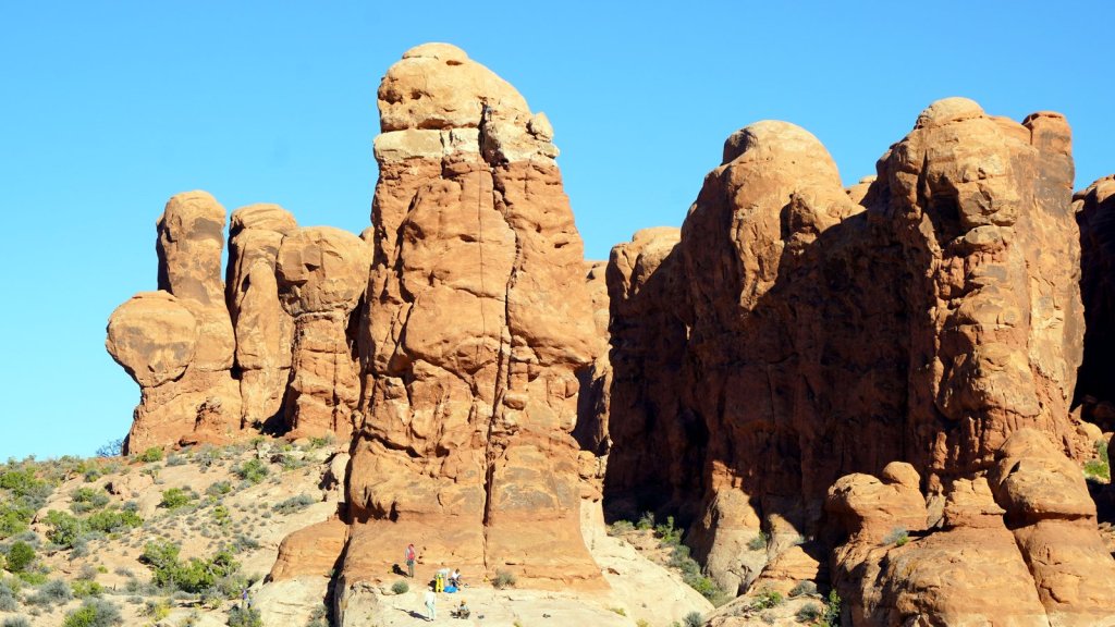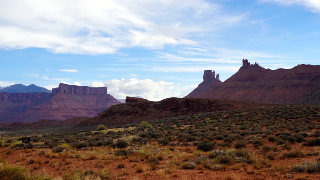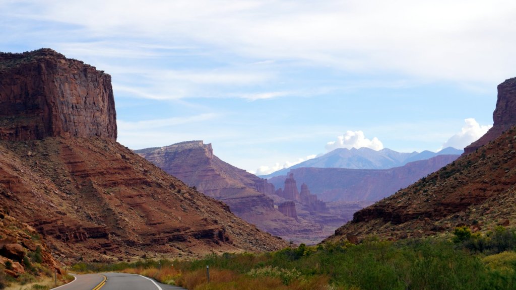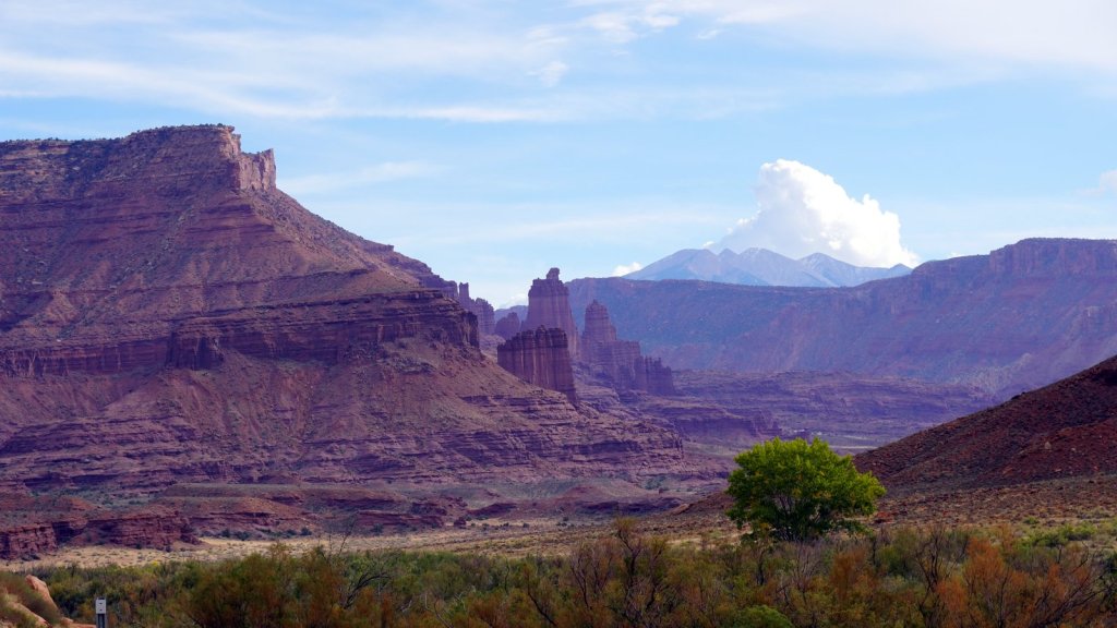 In these last few days we visited several State and National parks. The parks are all along the canyons made by the Colorado and Green river. First the Colorado National monument. Here we spent half a day driving around the rim of the mesa (table mountain) looking down into the valley below. The road twisted and turned along the valley rim and the sights are breathtaking. It was our first taste of this rugged dry red landscape. From here we followed the Colorado river as it cut its way through the country side on Scenic Hwy 128. Instead of looking down from the mountain into the red coloured valley we were driving in it! At the so-called “Fisher Towers” we stopped for lunch. The high sandstone towers are a favourite for climbers. There is a campsite here but with only 5 places and it had already filled up. We drove further following the river and passed many campsites on this road. Most of them appeared full. When reaching Moab, we decided to drive all the way up the mountain to the park campsite at the end of the Arches NP. Unfortunately, it was full (as expected) but we could reserve a site with the camp host for the next day. We did this and drove back to Moab and found, in the dark, a campsite just outside town.