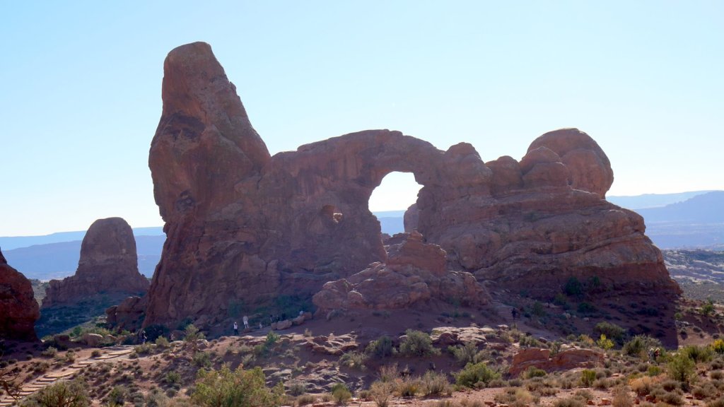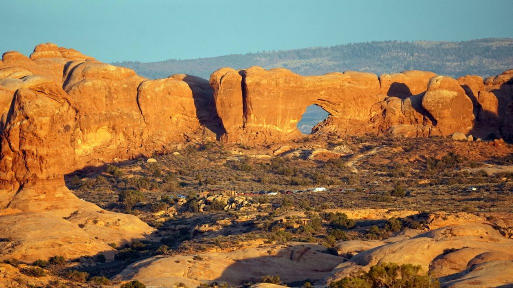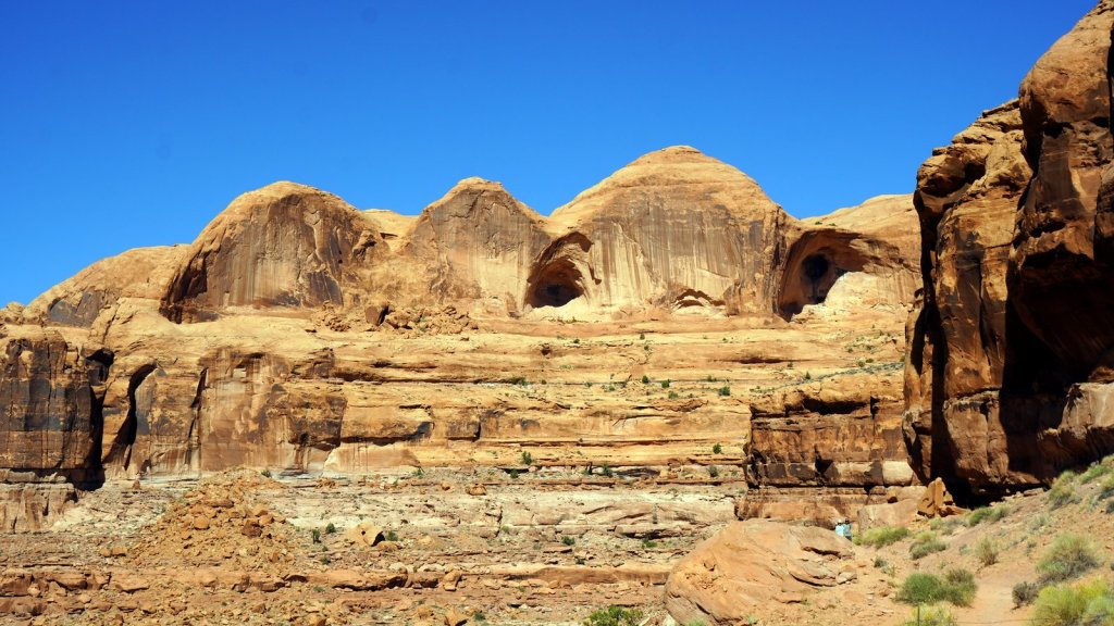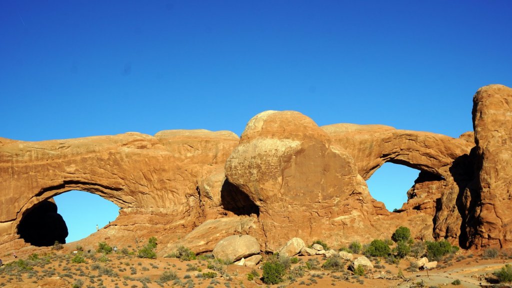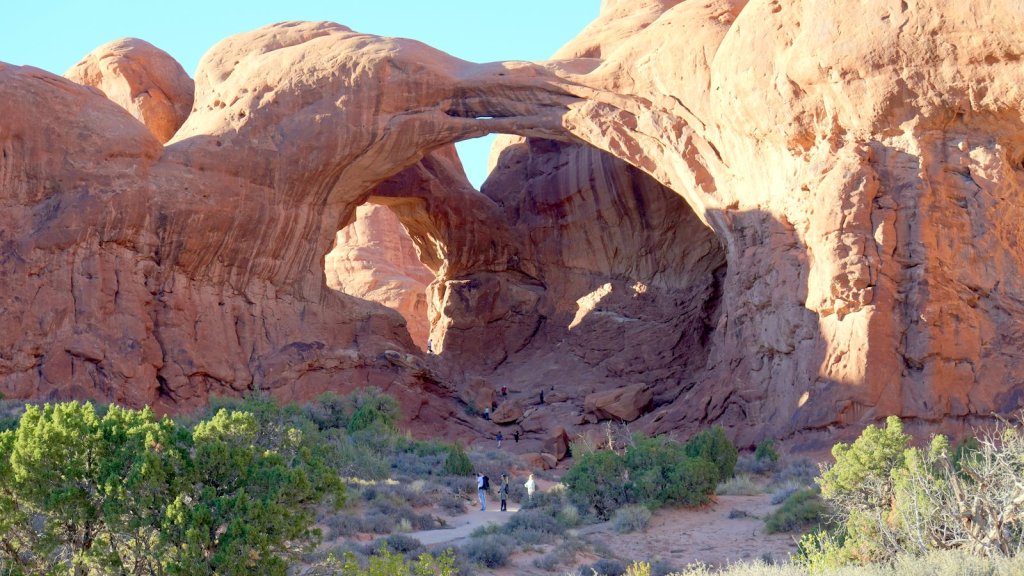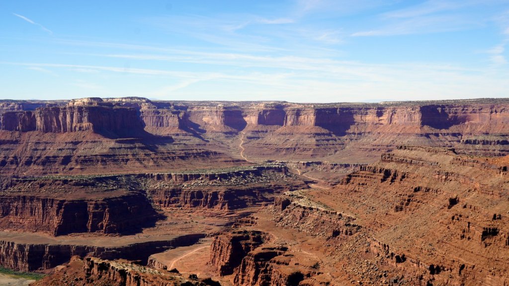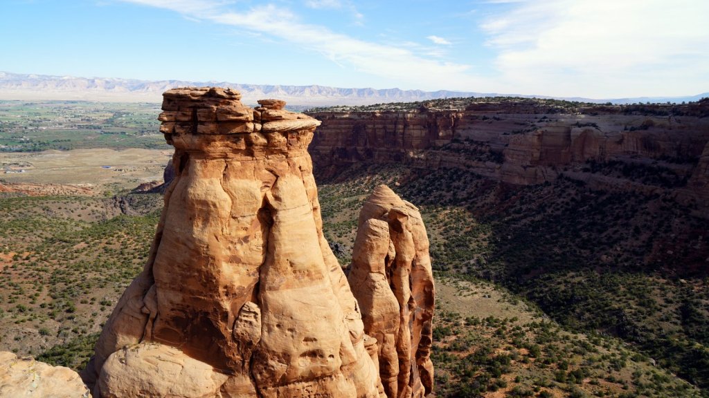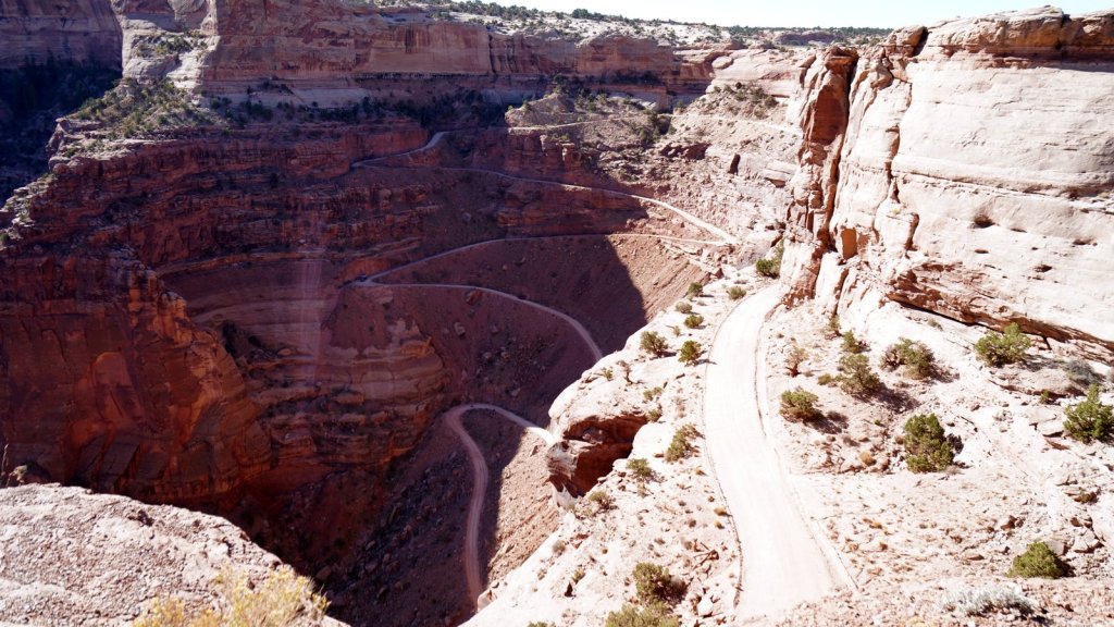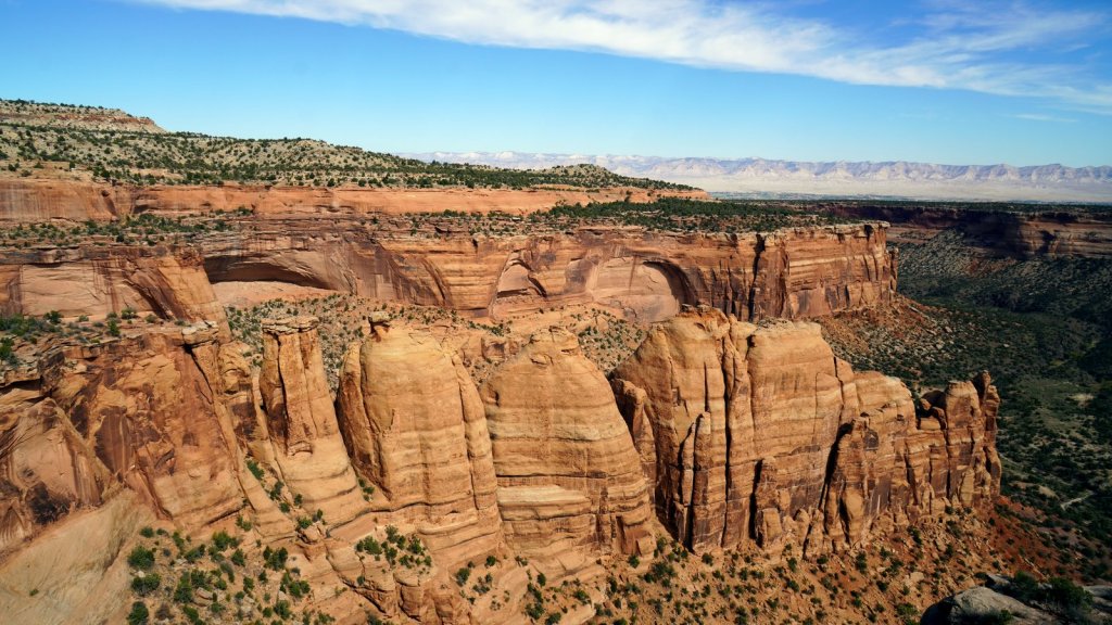 In these last few days we visited several State and National parks. The parks are all along the canyons made by the Colorado and Green river. First the Colorado National monument. Here we spent half a day driving around the rim of the mesa (table mountain) looking down into the valley below. The road twisted and turned along the valley rim and the sights are breathtaking. It was our first taste of this rugged dry red landscape. From here we followed the Colorado river as it cut its way through the country side on Scenic Hwy 128. Instead of looking down from the mountain into the red coloured valley we were driving in it! At the so-called “Fisher Towers” we stopped for lunch. The high sandstone towers are a favourite for climbers. There is a campsite here but with only 5 places and it had already filled up. We drove further following the river and passed many campsites on this road. Most of them appeared full. When reaching Moab, we decided to drive all the way up the mountain to the park campsite at the end of the Arches NP. Unfortunately, it was full (as expected) but we could reserve a site with the camp host for the next day. We did this and drove back to Moab and found, in the dark, a campsite just outside town.
