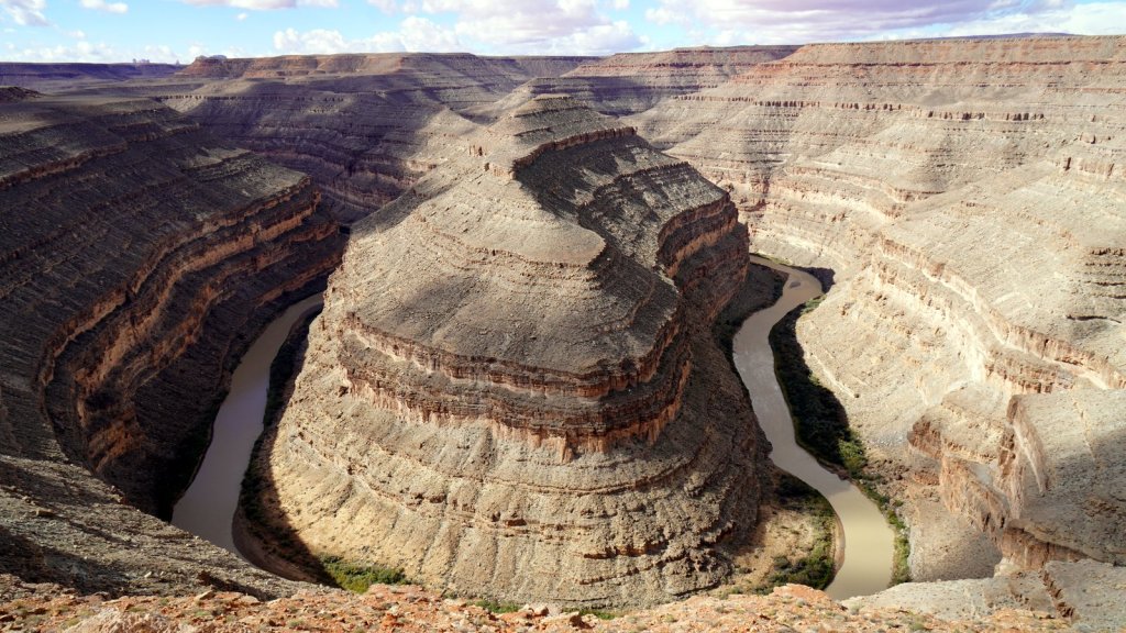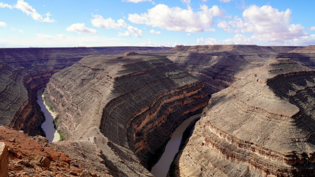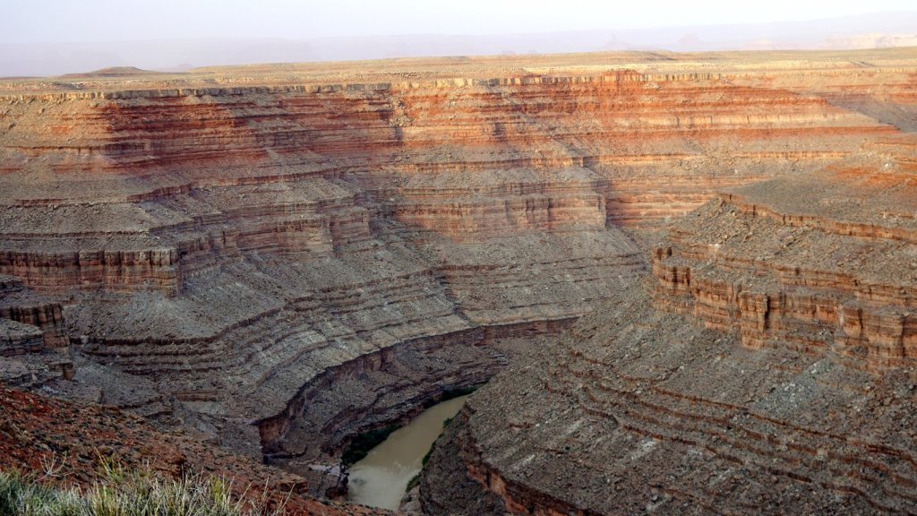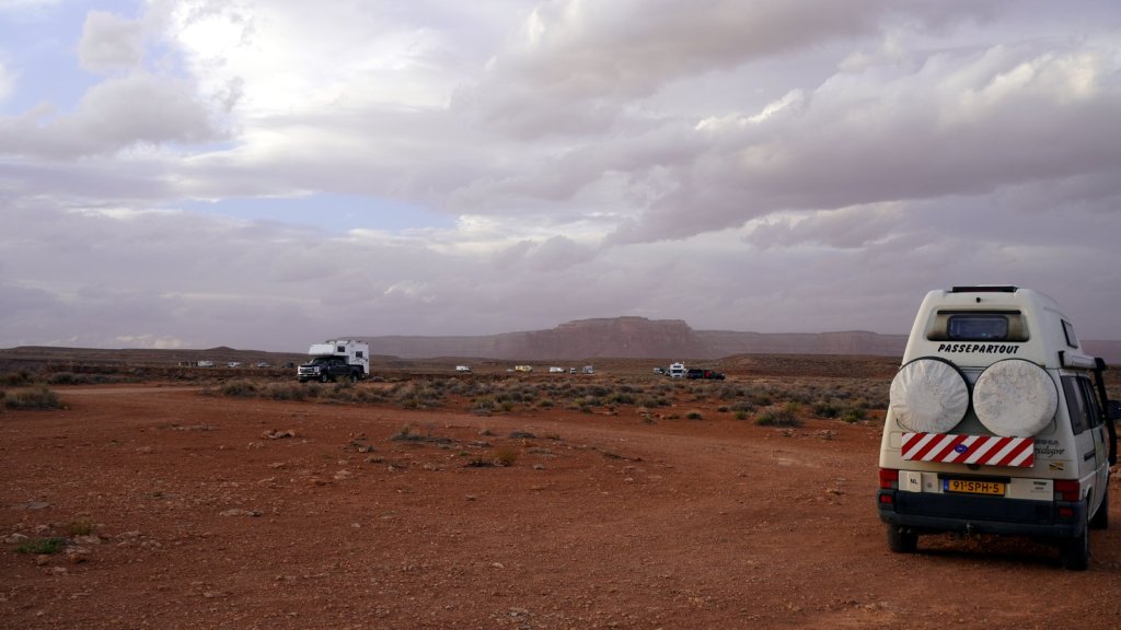 The most touristic way is to take the steam train from Durango to Silverton. This roundtrip takes all day. We also wanted to drive further up the mountain over the Million Dollar highway (to Quray and Telluride) so the train was not an option (even if we could get a ticket). Many mines were once active in these mountains. Everywhere you see tailing dumps and ruins of old villages and mining mills. The road climbs over several passes of 3200+ m. Needles to say that Passepartout with its 100 hp engine takes its time to get up and over these passes. By the time we reached the old mining town of Silverton (now a well-known skiing and summer holiday village) it was time to find a campsite. Just outside of town there is a well established BLM (Bureau of Land Management) campground alongside a small river. Several other campers were already there. At night it cooled down till below freezing and inside it was 2 deg. Frost was on the windows in the morning. What do you expect if you camped at 2800 m in October. In the morning a local told us that severe weather warning with up to 6 inches of snow is expected later in the evening. Good that we were on our way out of the mountains (we have no snow chains). First however we had to drive further up over the Million Dollar highway. It is a very picturesque drive with many switchbacks and sharp drop-offs. At the end of the climb we took a side road and drove through another valley back down to Cortez and then turned South East towards southern Utah and on to Gooseneck NP. When we arrived it was very windy and almost dark. The campsite is on top of the ridge of the San Juan river gorge. Looking over the cliff you see the river deep below snaking through the rocks. During the night the wind picked up even more and it started to rain too. We had installed our steel mosquito grills to get some ventilation because we did not dare to open any other windows. Needless to say the camper was rocking in the wind and we were both rolling back and forth in our beds at every wind gust.