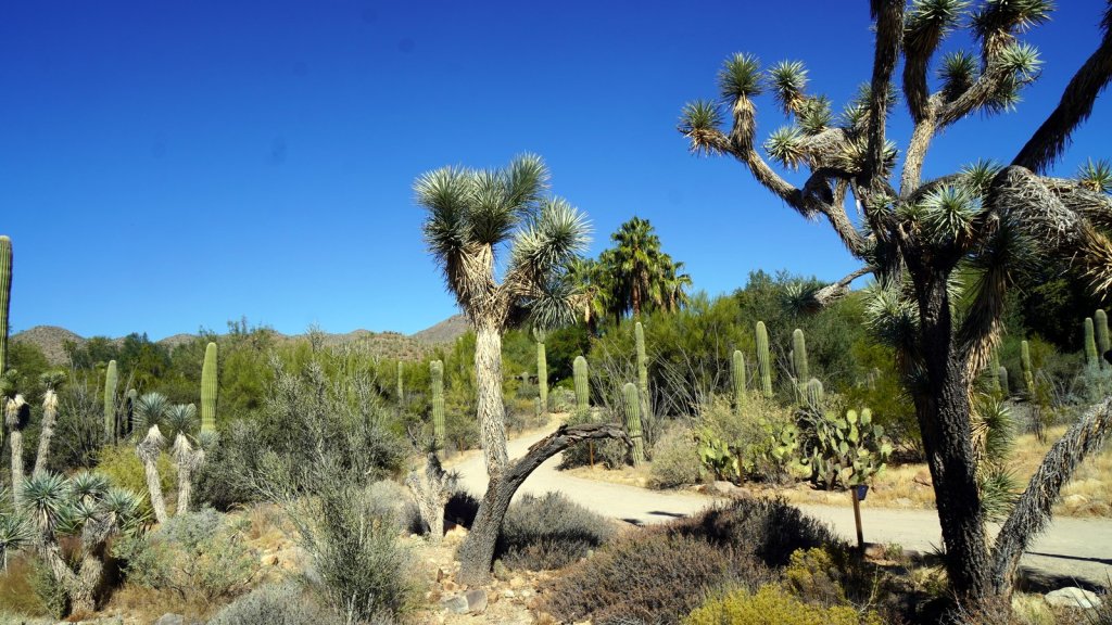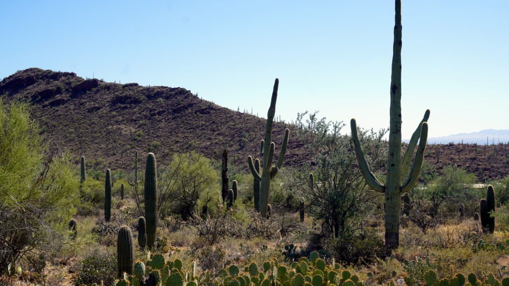 To avoid going through Phoenix on our way to Tucson, we took the smaller roads further to the east. The surrounding is remarkably forested. This must be due to the height. Sometimes the road wind up to 2200 m and we had to let faster trucks and campers pass. In the low valleys (800 m) the countryside is much more barren and you started to see all types of cactus along the road. We spent an extra night along the road camping close to Lake Roosevelt (another artificial lake created by a dam in the river. Also here there are many recreational facilities along the lake).