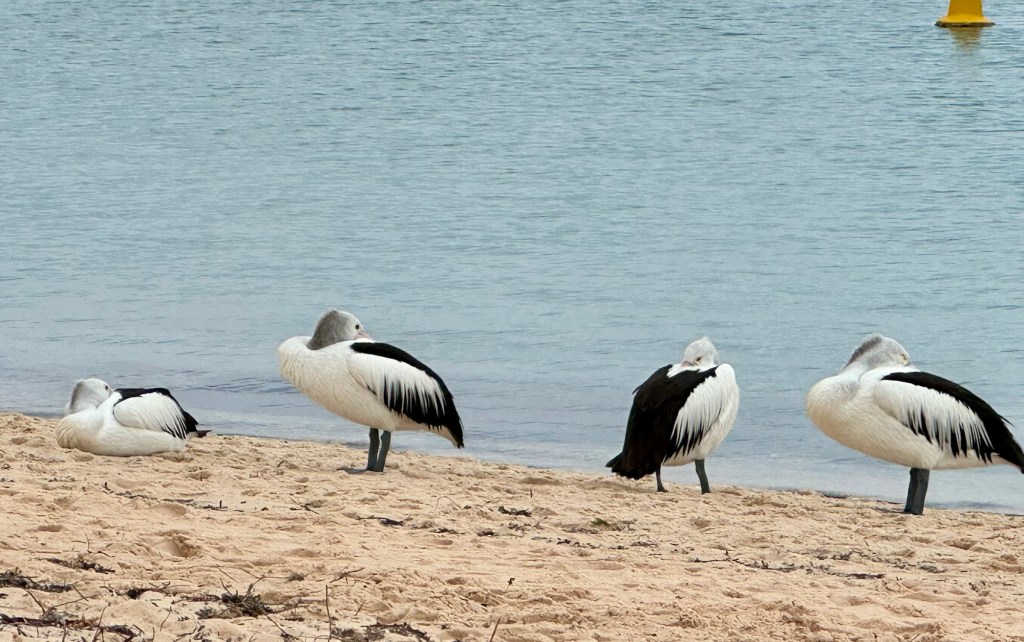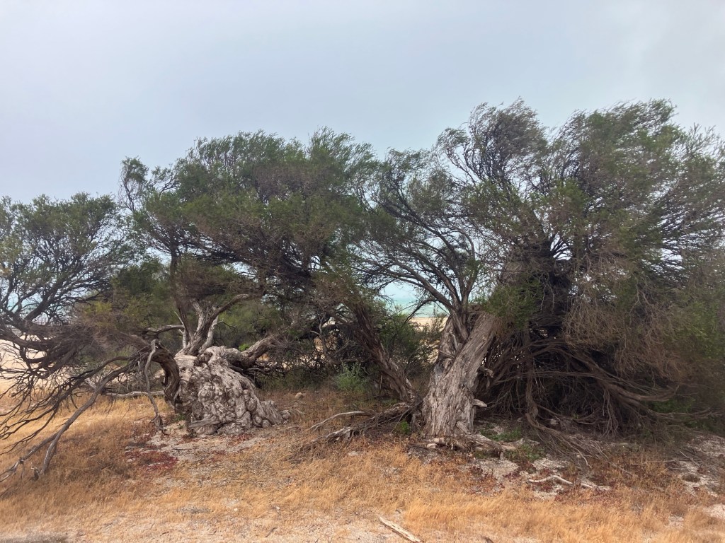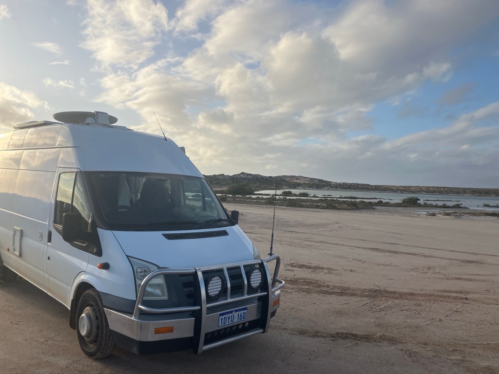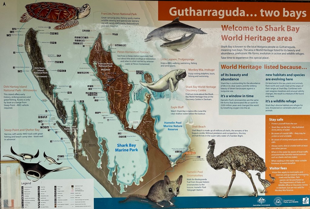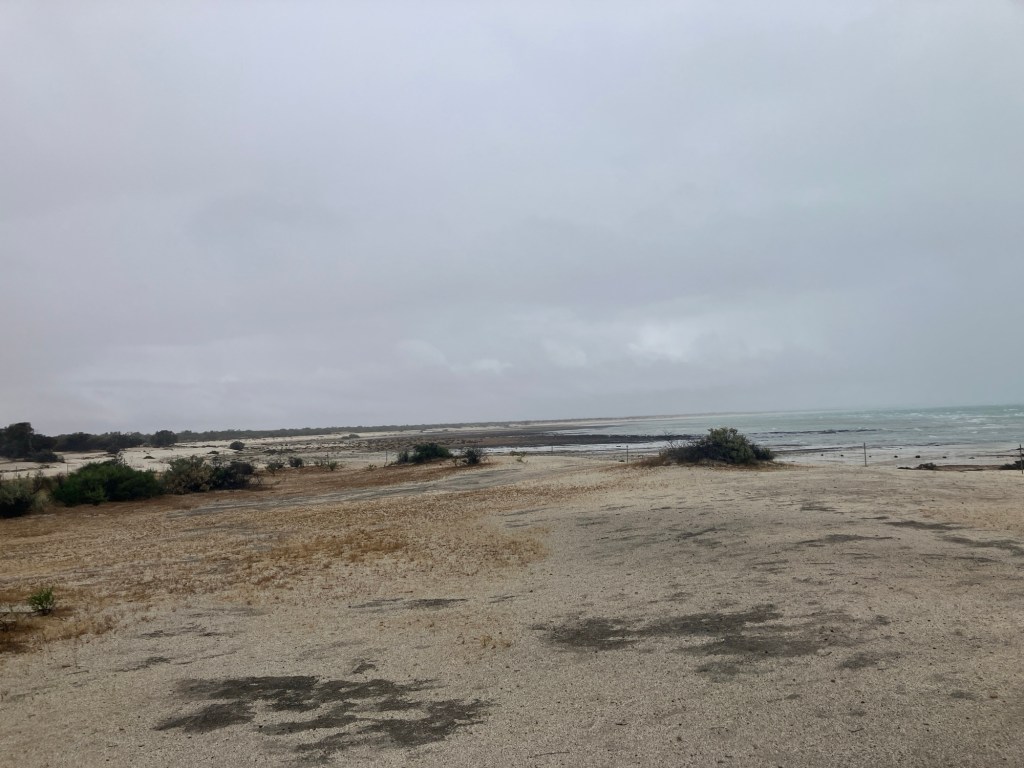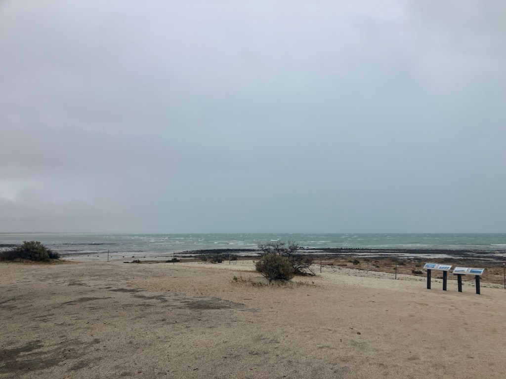 It was a very windy and rainy day. We drove into the Shark-bay World heritage park hoping to have some good stops along the way. The stromatolites are under water from the tide and the rain. We saw them again on the way out of the park the next day, but they were still not very impressive. Live, millions of years old algae growing on rocks is exciting only for geologists. In Denham we stocked up again (bread and juices and for Rudy, his supply of beers) and bought a permit (from the visitor centre) to camp at one of the 4 established park campsites along the coast. We drove on to explore the major attraction in the area: Monkey Mia. We knew there would be no dolphins at this late hour but at least we got a feel of the area. It is a large tourist resort/campsite on a beautiful beach. Too touristic for us. We were glad that we could stay at the park beach campsite with only 5 other campers close to the sea.
