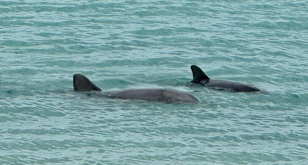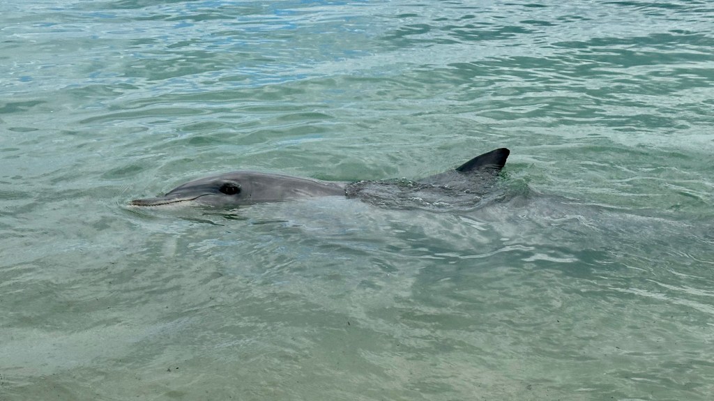 The next morning, we had the full dolphin experience. You stand in the shallow water and a pair of dolphin’s swims in front of you waiting for their daily handout of fish. The dolphins are fed only a few fishes so they still must hunt for their own daily meal. Everything is well scripted, so the animals know what is coming and do not expect more fish.