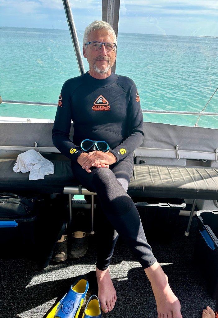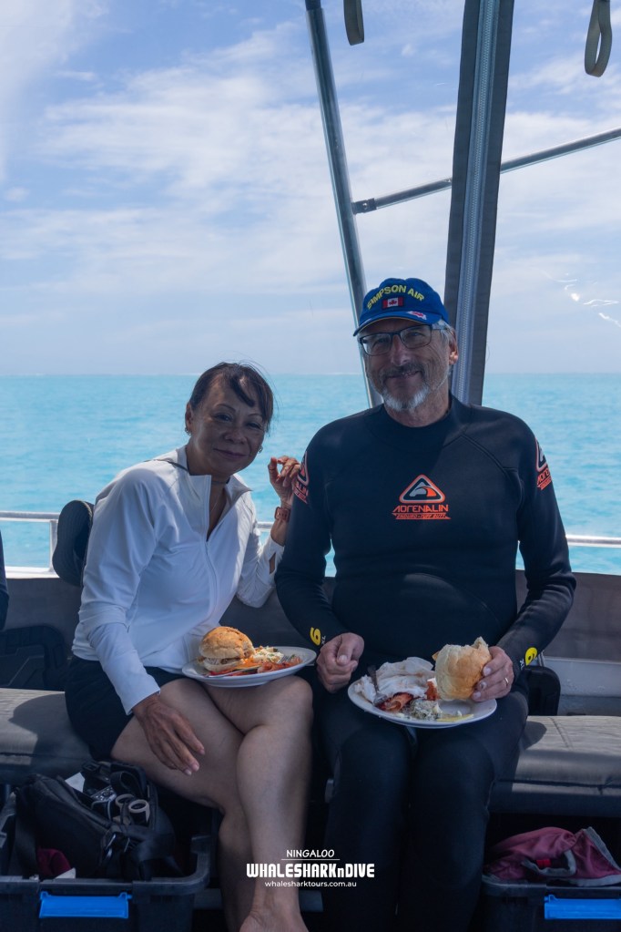 On Sunday 6/10 we boarded a boat tour to go out and swim with the whale shark. This is the largest fish in the ocean. It can reach up to 12 m long. Some whales are bigger, but they are mammals. We did see some humpback whales splashing into the water, but they were too far to photograph. The boat had 18 snorkelers on board, and we were looked after by 5 staff. In groups of 9 we jumped into the water to swim close to the whale shark. It was difficult to keep up with the animal who was just slowly waving its large tail. After 10 min the boat picked us up again and the next 9 could swim with the shark. As you can imagine it can get quite tiring jumping in and out of the water all the time. Rudy had to skip 2 trips but he had ample opportunity to observe and swim with the whale shark. The tour photographer recorded these events. We were incredibly lucky that the sharks were still around. Mostly they are already gone in September, and it is now October. Also, we were lucky that the water was so clear (and the sea calm) that you could see not only the shark but also manta-rays flying underneath you. Since all the campsites in the park by the beach were still fully booked, we left town and drove on to a large campsite at the Bullara Station, some 140 km back towards Hwy 1. This campsite is very popular. It has large sites spread out in the bush. There is a restaurant, and, in the morning, you can buy fresh scones and meat pies. Needles to say that Jamaliah bought some on our way out. Though this is a cattle farm, we were not bothered by flies and in the evening, we could sit outside till late watching the stars without mosquitoes. Amazing.