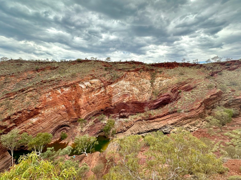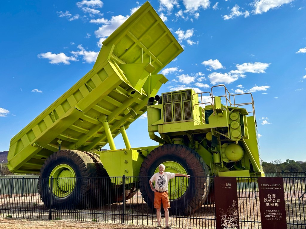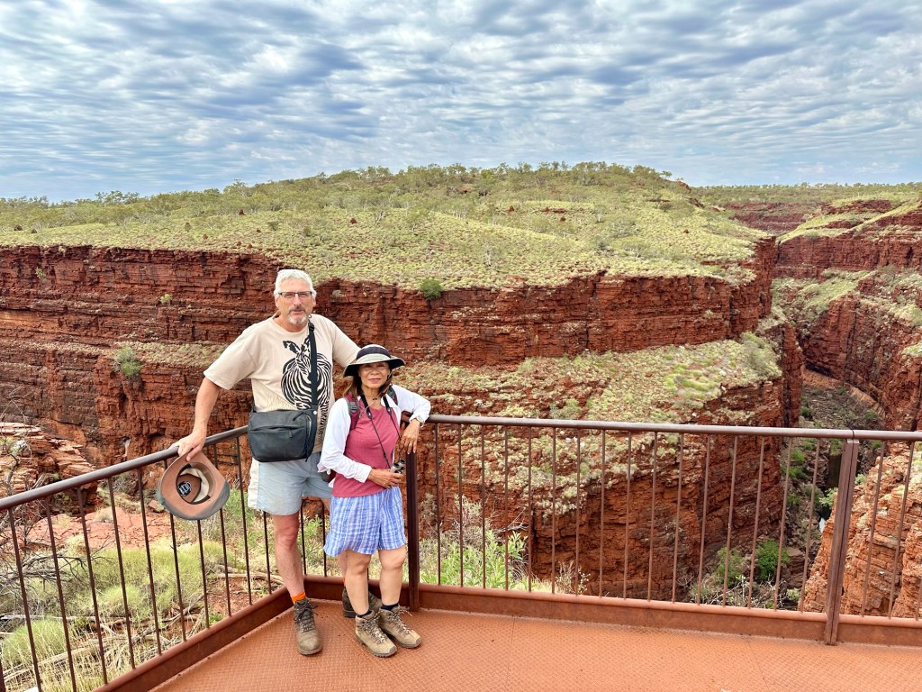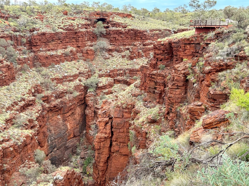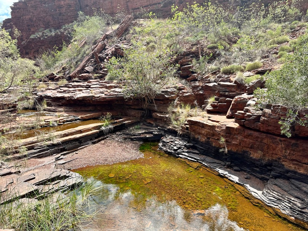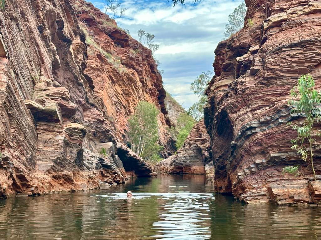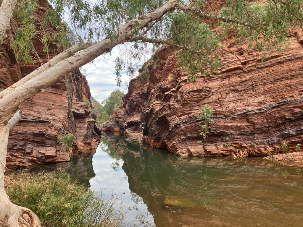 The iron ore mining town of Tom Price lies 540 km further inland. The road is good, and it starts to get hilly the closer you get to the town. The hills around Tom Price are primarily built up by hematite and magnetite. The concentration of these minerals is so high that they only have to blast the mountain, crush the rock, and send it by train to the coast for shipment overseas. We booked a mine tour to get a better look at the mining process. At one point there was a deep hole in the ground where they had followed a high-grade seam till it ran out. Many of the hills/mountains around the mining area form the Karijini NP. We are spending now our second night at the park’s Eco Campsite. The main attraction is the many deep gorges the water streams have cut into the deep-sea sedimentary hematite rock over millions of years. We have now visited 4 of them. In 2 we climbed down for a refreshing swim and one we climbed down and walked along the gorge floor out of the mountain. Given both Jamaliah’ hernia and my condition we are immensely proud of these achievements and enjoyed them.