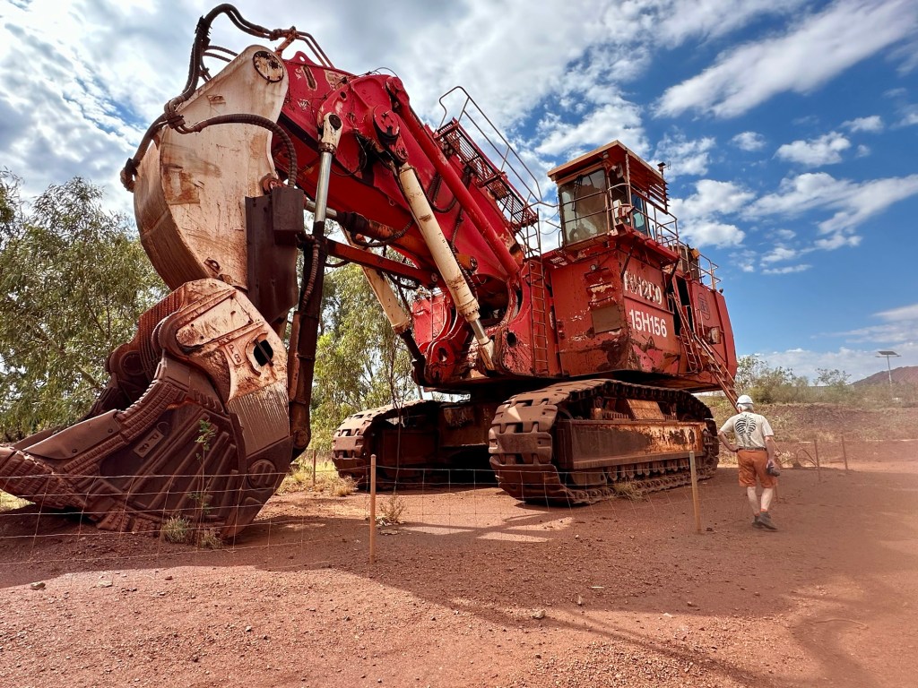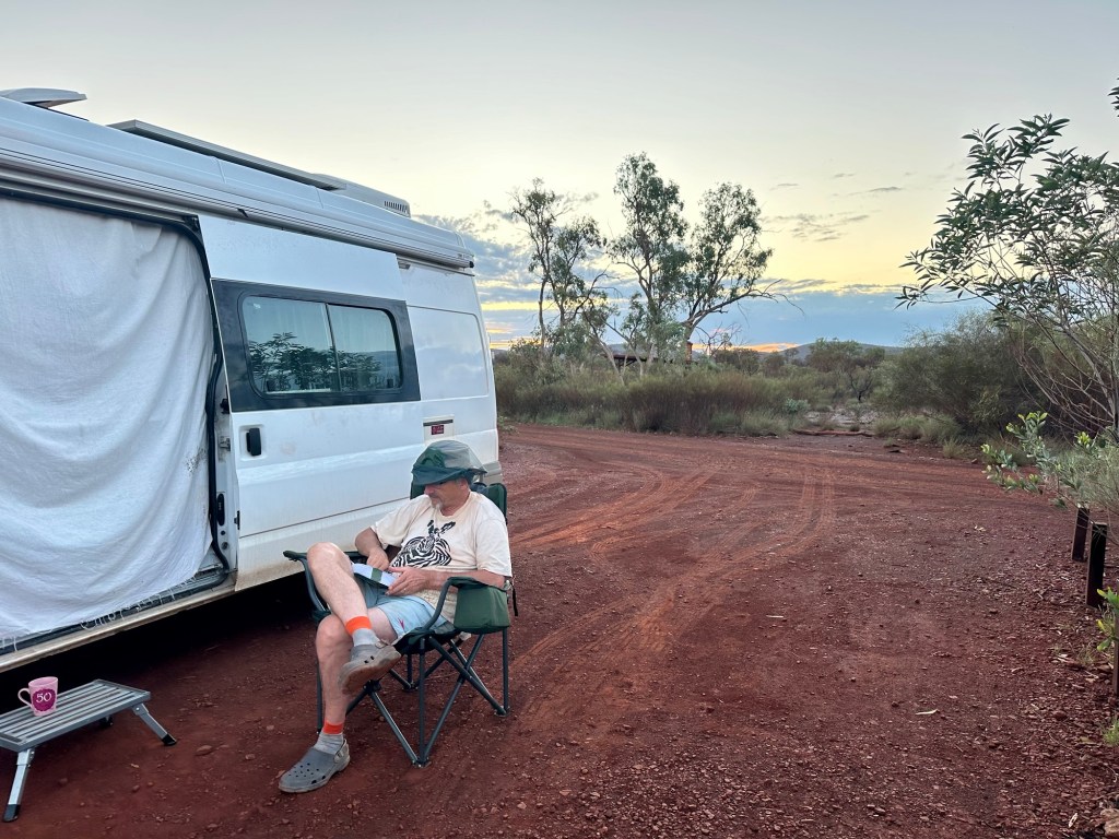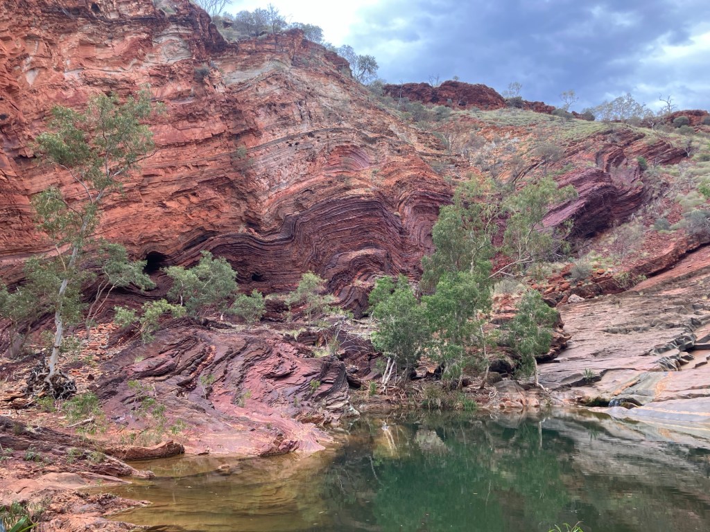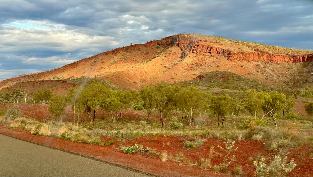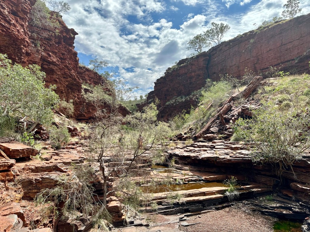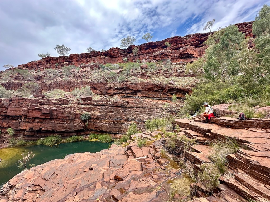 The iron ore mining town of Tom Price lies 540 km further inland. The road is good, and it starts to get hilly the closer you get to the town. The hills around Tom Price are primarily built up by hematite and magnetite. The concentration of these minerals is so high that they only have to blast the mountain, crush the rock, and send it by train to the coast for shipment overseas. We booked a mine tour to get a better look at the mining process. At one point there was a deep hole in the ground where they had followed a high-grade seam till it ran out. Many of the hills/mountains around the mining area form the Karijini NP. We are spending now our second night at the park’s Eco Campsite. The main attraction is the many deep gorges the water streams have cut into the deep-sea sedimentary hematite rock over millions of years. We have now visited 4 of them. In 2 we climbed down for a refreshing swim and one we climbed down and walked along the gorge floor out of the mountain. Given both Jamaliah’ hernia and my condition we are immensely proud of these achievements and enjoyed them.