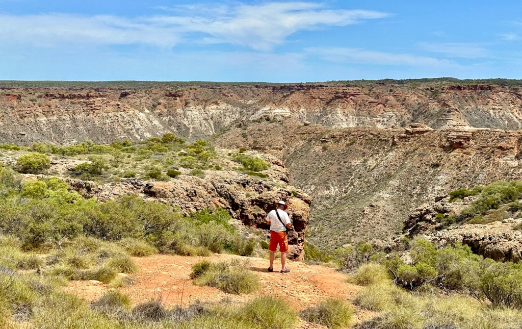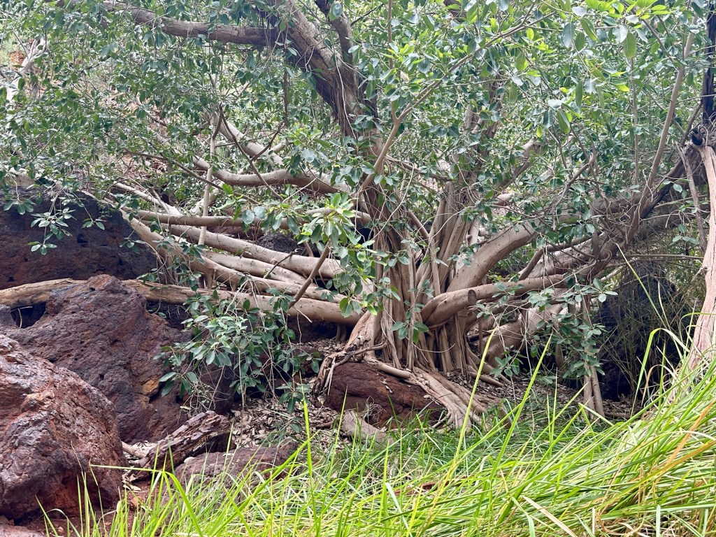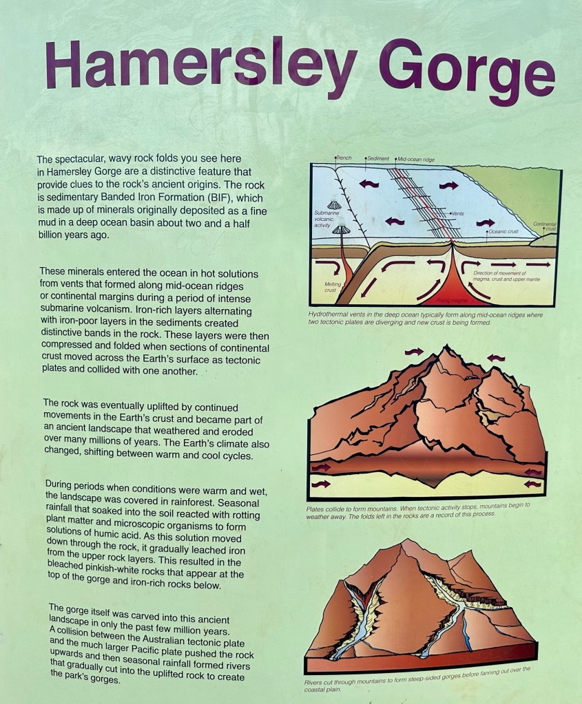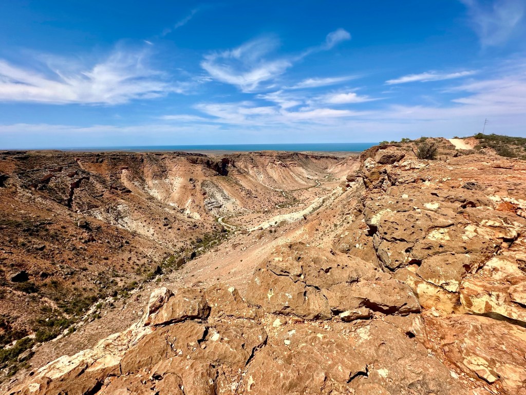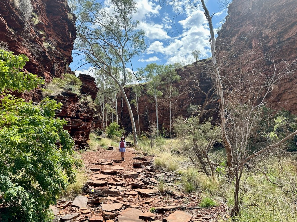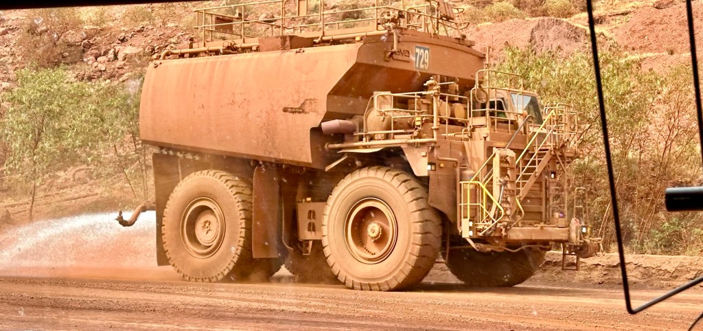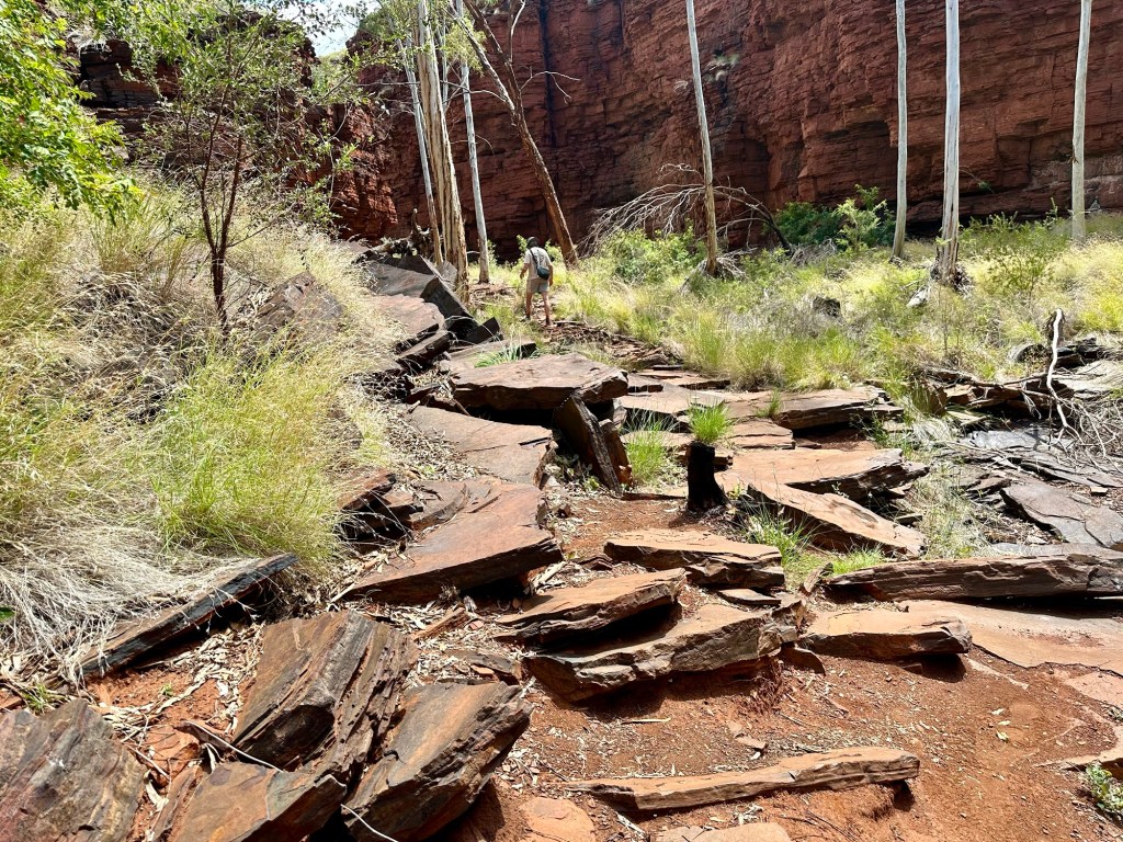 The iron ore mining town of Tom Price lies 540 km further inland. The road is good, and it starts to get hilly the closer you get to the town. The hills around Tom Price are primarily built up by hematite and magnetite. The concentration of these minerals is so high that they only have to blast the mountain, crush the rock, and send it by train to the coast for shipment overseas. We booked a mine tour to get a better look at the mining process. At one point there was a deep hole in the ground where they had followed a high-grade seam till it ran out. Many of the hills/mountains around the mining area form the Karijini NP. We are spending now our second night at the park’s Eco Campsite. The main attraction is the many deep gorges the water streams have cut into the deep-sea sedimentary hematite rock over millions of years. We have now visited 4 of them. In 2 we climbed down for a refreshing swim and one we climbed down and walked along the gorge floor out of the mountain. Given both Jamaliah’ hernia and my condition we are immensely proud of these achievements and enjoyed them.