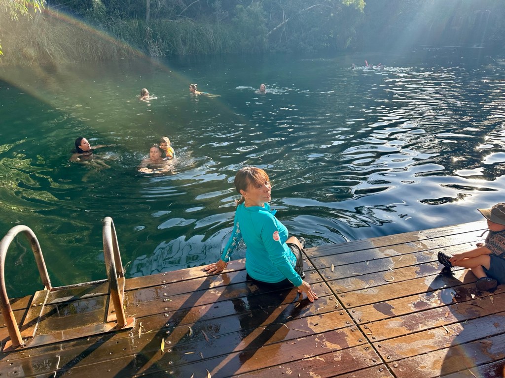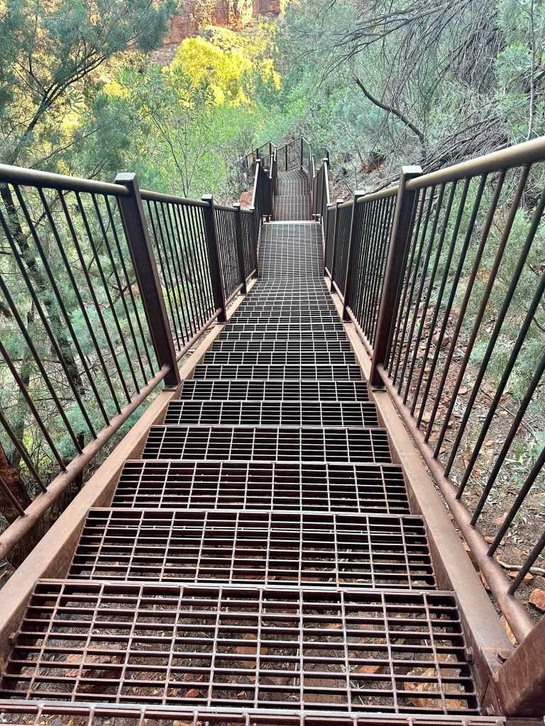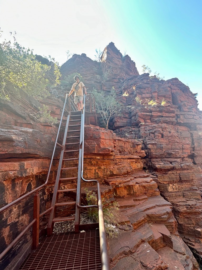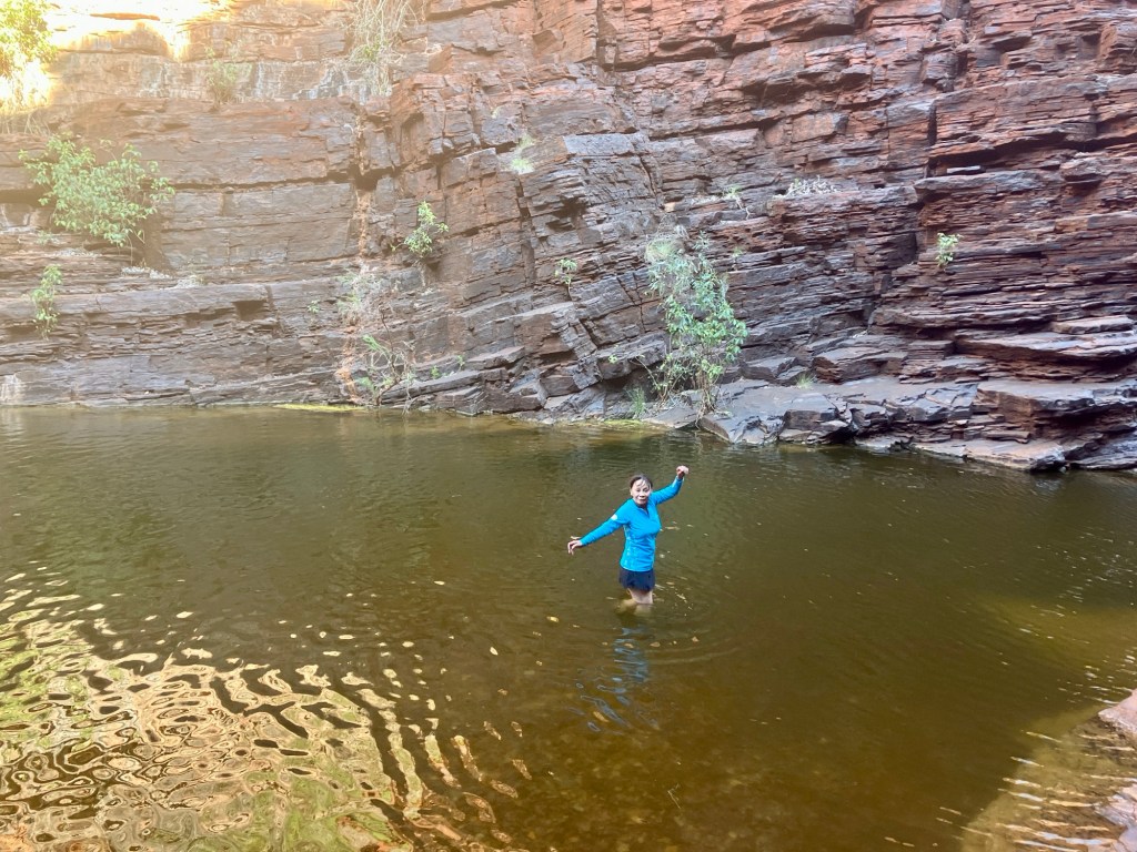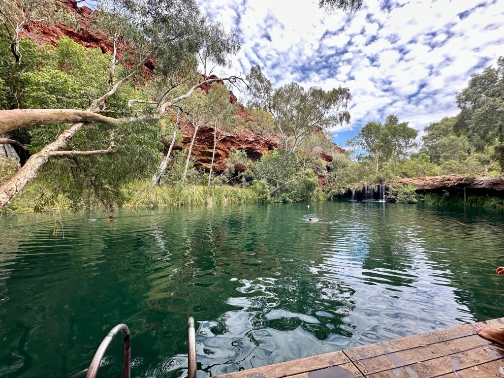 A bit further up is the second campsite ion the park. We stayed overnight there and made 2 trips to the Dale’s gorge and its swimming pools. The first without our bathing suit as a reconnaissance and the second in the afternoon with. You had to climb down a ladder with 300 steps to reach the bottom of the gorge. The fern pool is accessible by a short walk through a forrest on the floor of the gorge. It is a popular swimming place with an overhang and waterfall. Jamaliah had brought along her float and after overcoming the scare of the small fish-eating nibbling at her feet, she also took the plunge. The sun was just at the right spot and shinning on to the water. A magical experience.