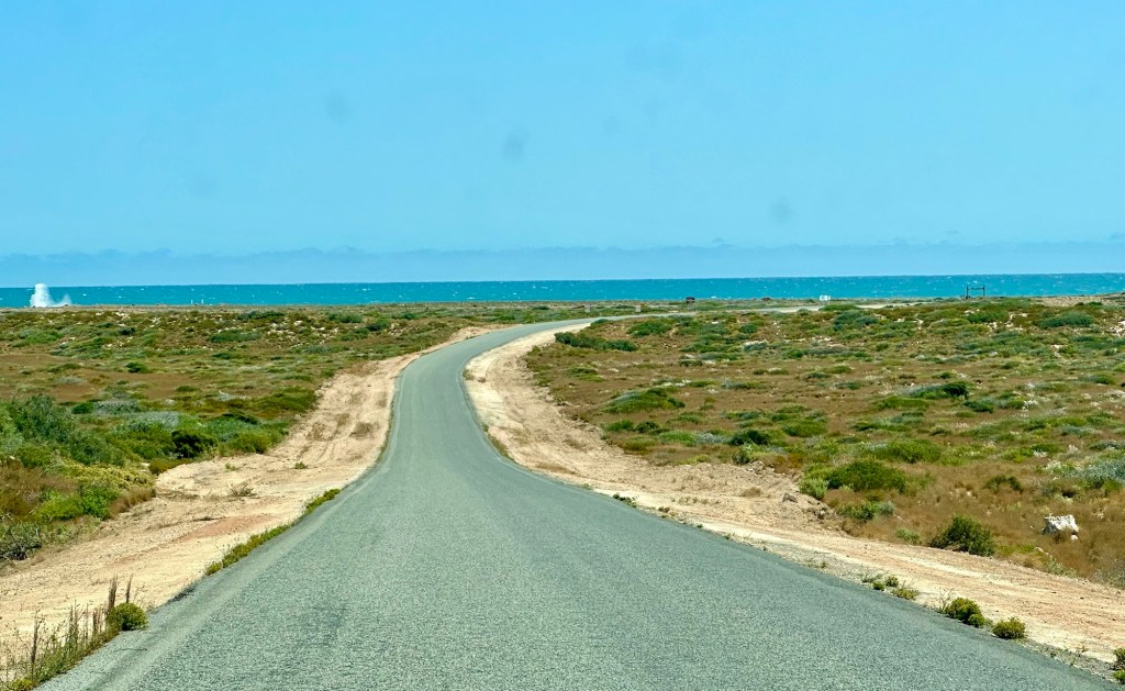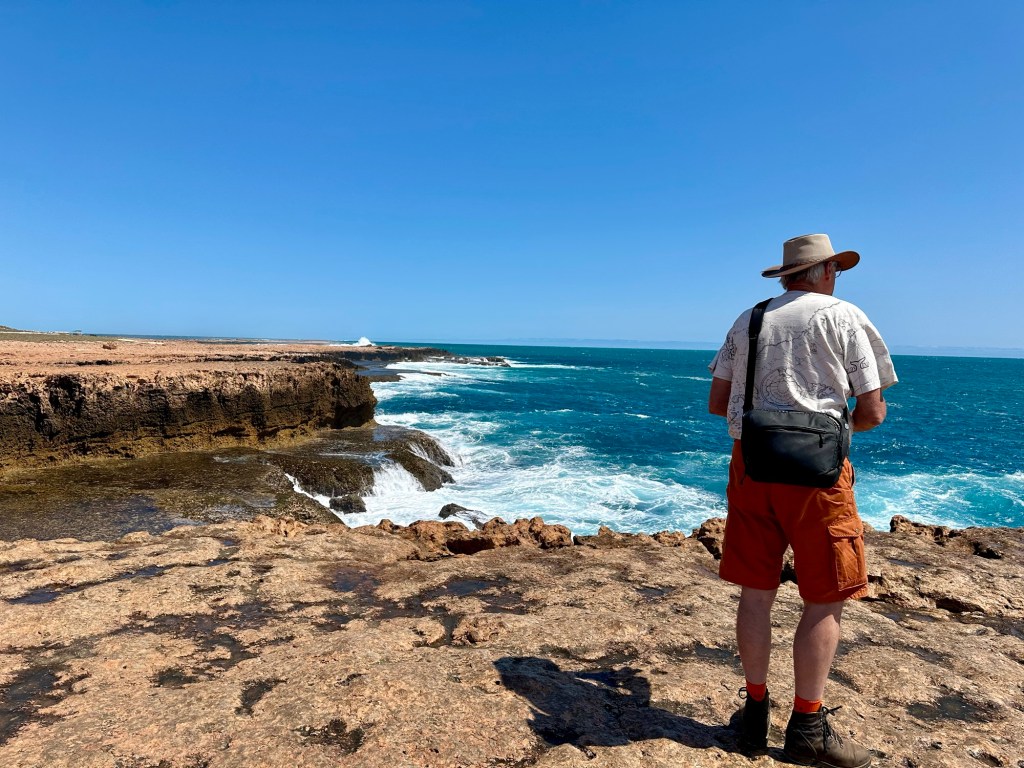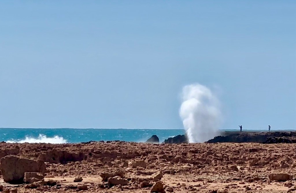 Further up the coast at Quobba there are blowholes. At low tide, the strong ocean waves push the water from the underwater cavern’s up into the sky. We arrived at high tide, so the spray was not spectacular but later in the day the spray was much higher as more pipes were functioning. The sea was too rough to go snorkeling. More chance at the Ningaloo Reef Marine Park, 450 km further up the west coast of Australia.