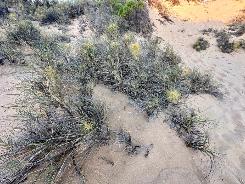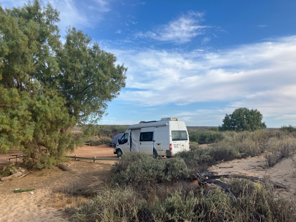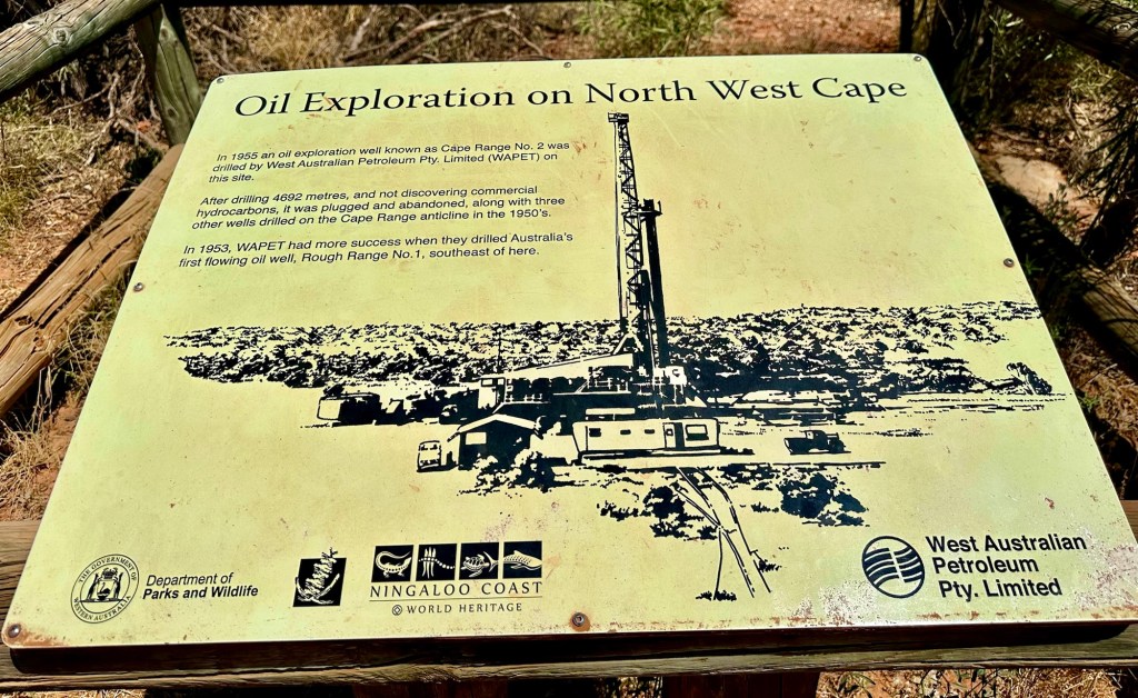 We managed to book a NP campsite in the dunes close to the sea. It is still school holidays, so we were lucky to get this spot. On the way in we made a short detour up a road over ridges to an old, abandoned drill site from the fifties. Although the environment was different it felt a lot like Labi road in Brunei. Also, there an exploration well was drilled far inland on top of a hill. The idea was that gas/oil accumulates in such layers (anticlines) deep in the ground. After 4500 m drilling, they did not find anything other than some hydrocarbon shows. Later producible quantities of gas were found offshore on Barrow Island.