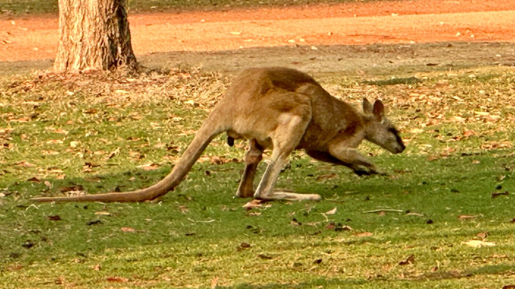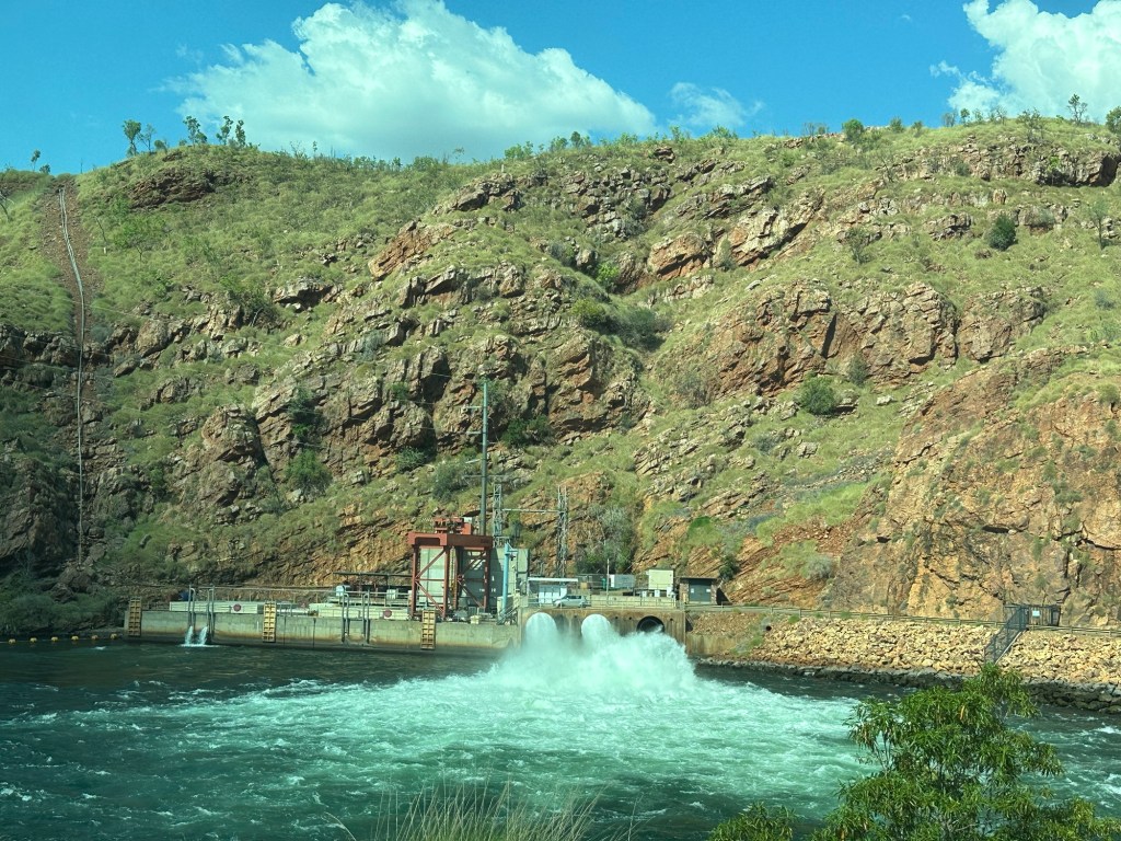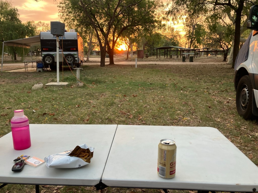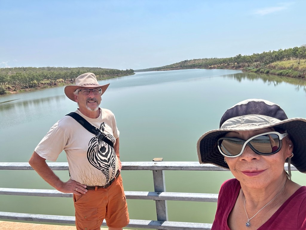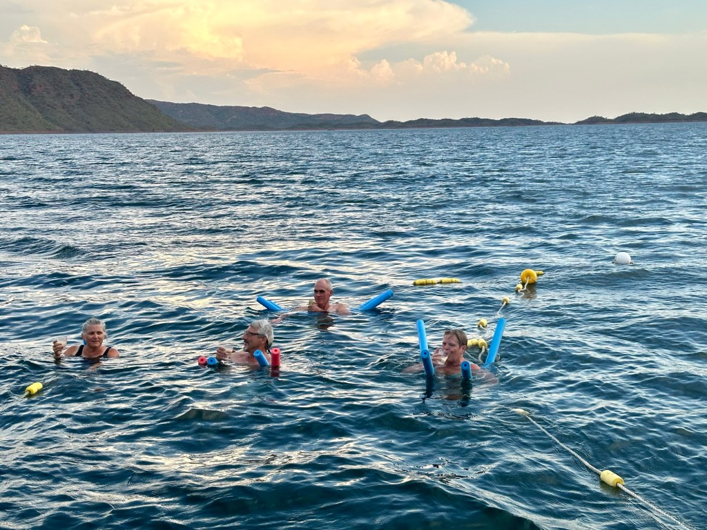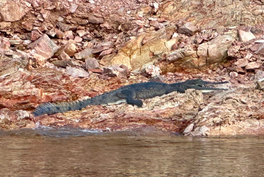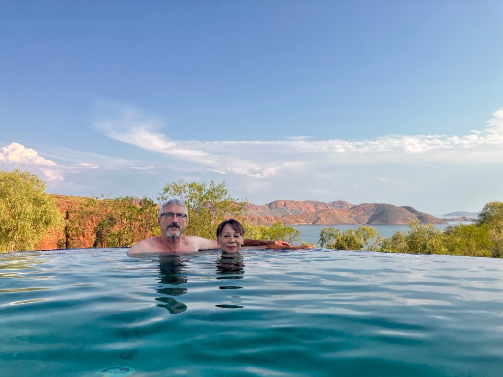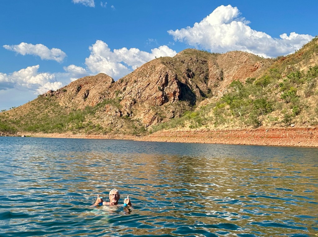 On the day of arrival there we were too late for the “Sunset Tour” on the lake. We did it the next day starting at 14:00 hrs till 18:00 hrs. Meanwhile we amused ourself with their infinity pool. There were not many passengers on board the tour, so we had lots of room. The water has filled up the valleys inbetween the mountains. Therefore there are many islands (hill tops) in the lake. Fresh water crocodiles and wallabies populate some of the islands. Twice the cruise boat stopped and we could swim/cool down around the boat. The second time with a glass of procecco in hand. By that time the wind has picked up, so we didn’t spend too long in the water. We managed to get back just before a heavy storm started. Lots of lightning, heavy wind and rain. The camper was shaking and the power went out too. A large branch dropped out of a nearby tree but luckily caused no damage.