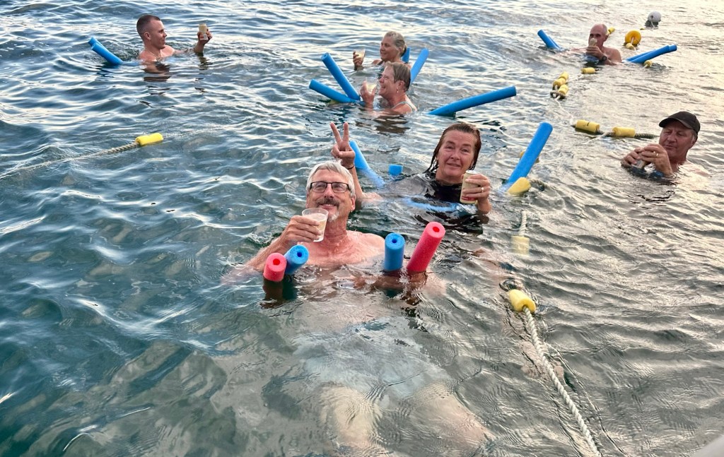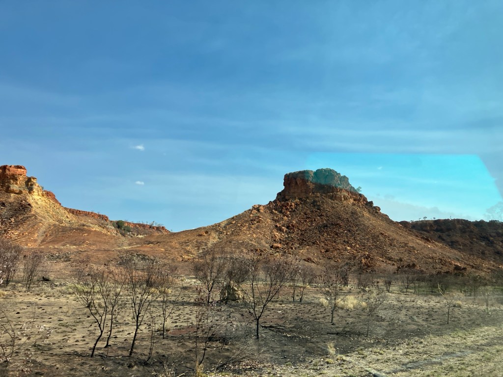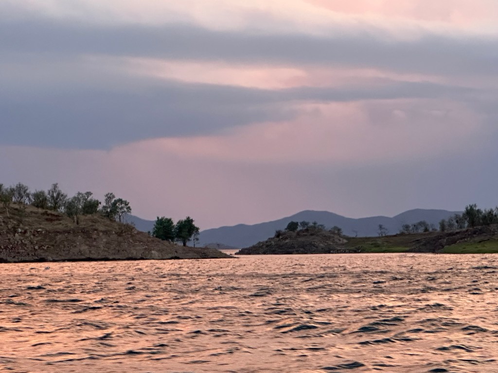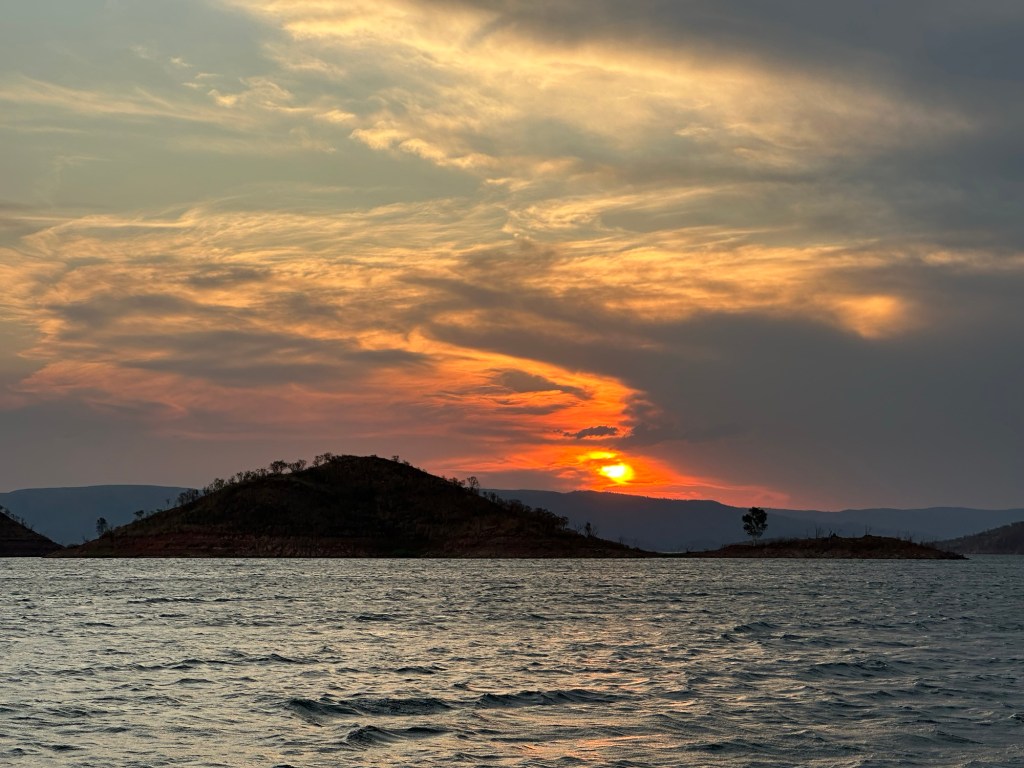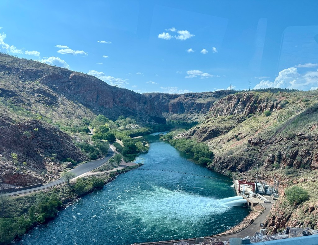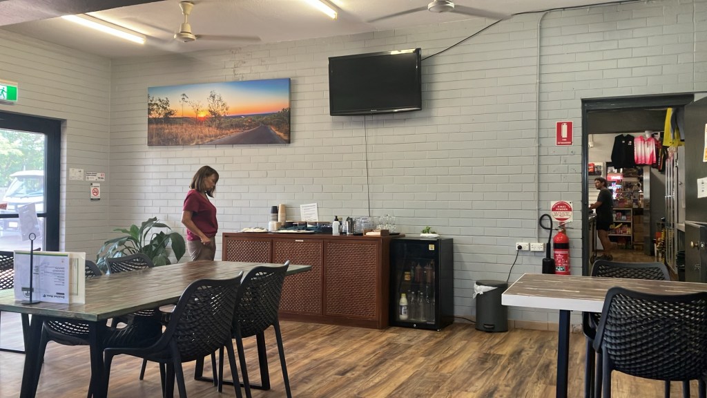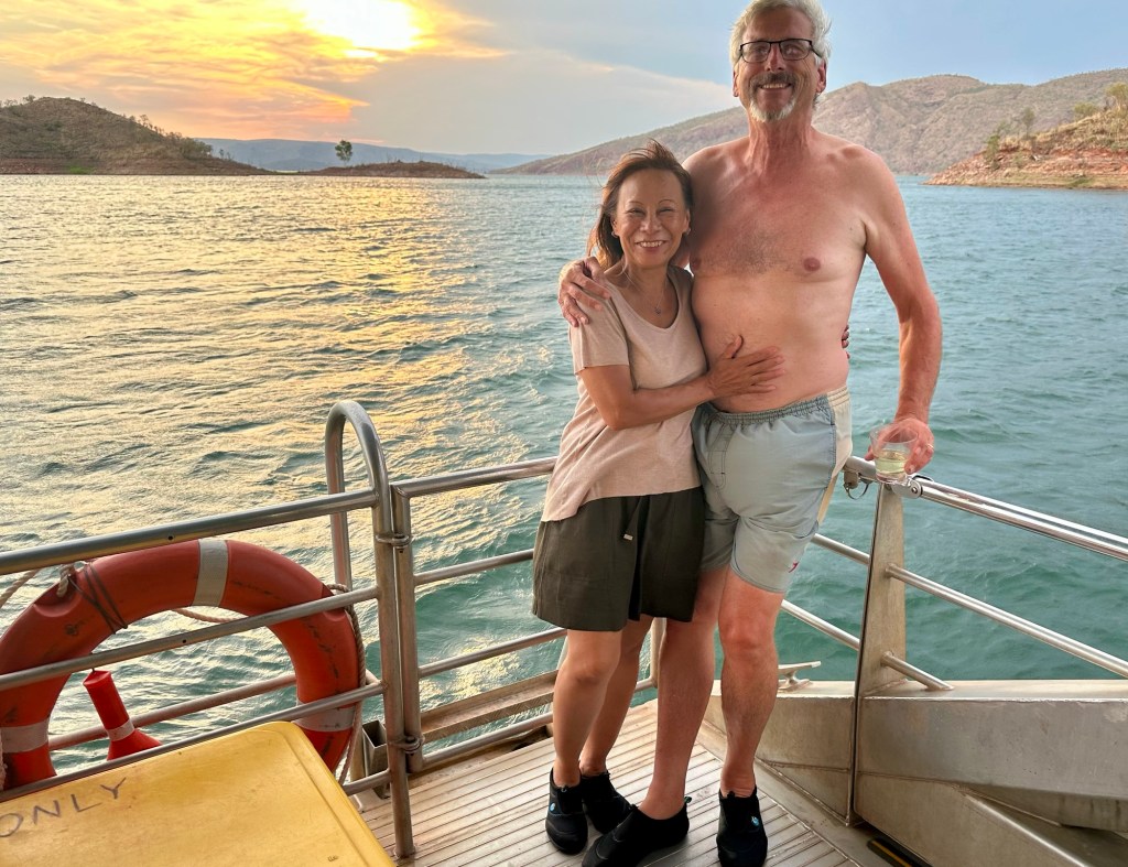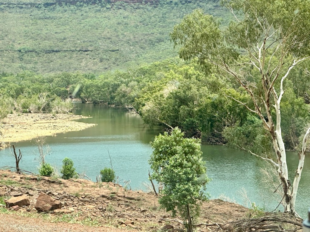 On the day of arrival there we were too late for the “Sunset Tour” on the lake. We did it the next day starting at 14:00 hrs till 18:00 hrs. Meanwhile we amused ourself with their infinity pool. There were not many passengers on board the tour, so we had lots of room. The water has filled up the valleys inbetween the mountains. Therefore there are many islands (hill tops) in the lake. Fresh water crocodiles and wallabies populate some of the islands. Twice the cruise boat stopped and we could swim/cool down around the boat. The second time with a glass of procecco in hand. By that time the wind has picked up, so we didn’t spend too long in the water. We managed to get back just before a heavy storm started. Lots of lightning, heavy wind and rain. The camper was shaking and the power went out too. A large branch dropped out of a nearby tree but luckily caused no damage.
