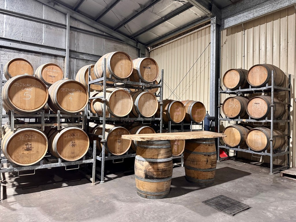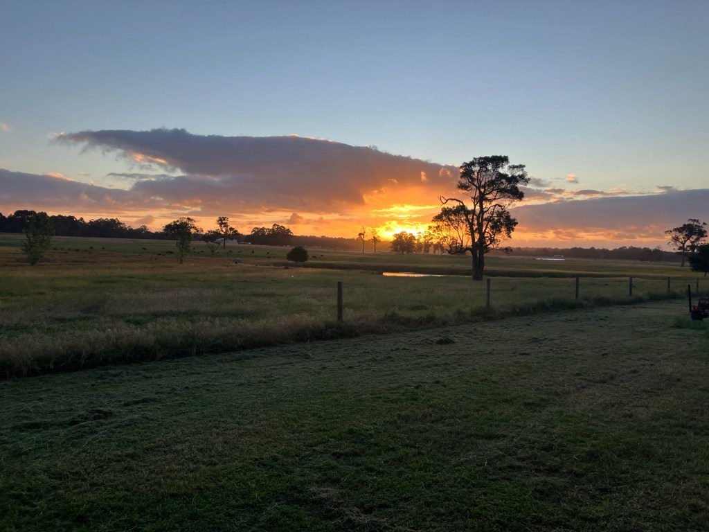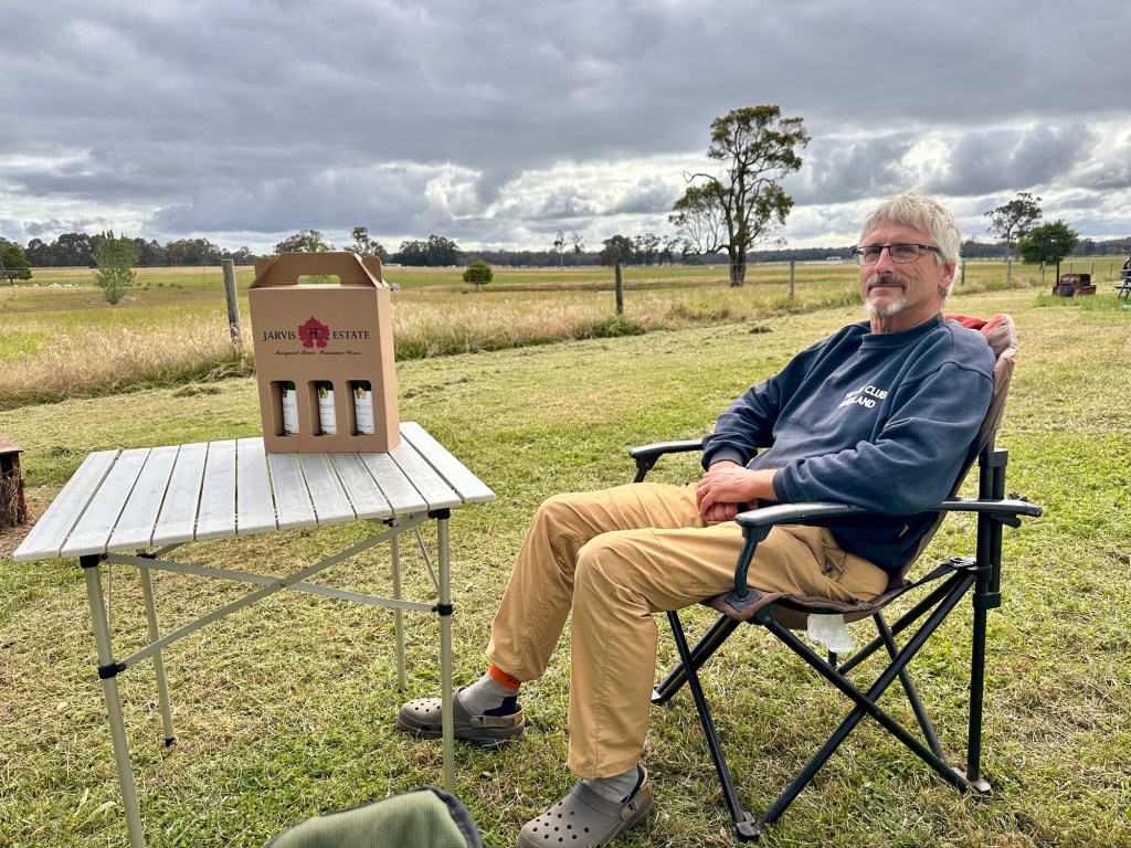 We are sitting in the evening sun looking over the winery on the other side of the water reservoir. Beside wine vines, you see in the distance sheep and cattle grazing in the setting sunlight.