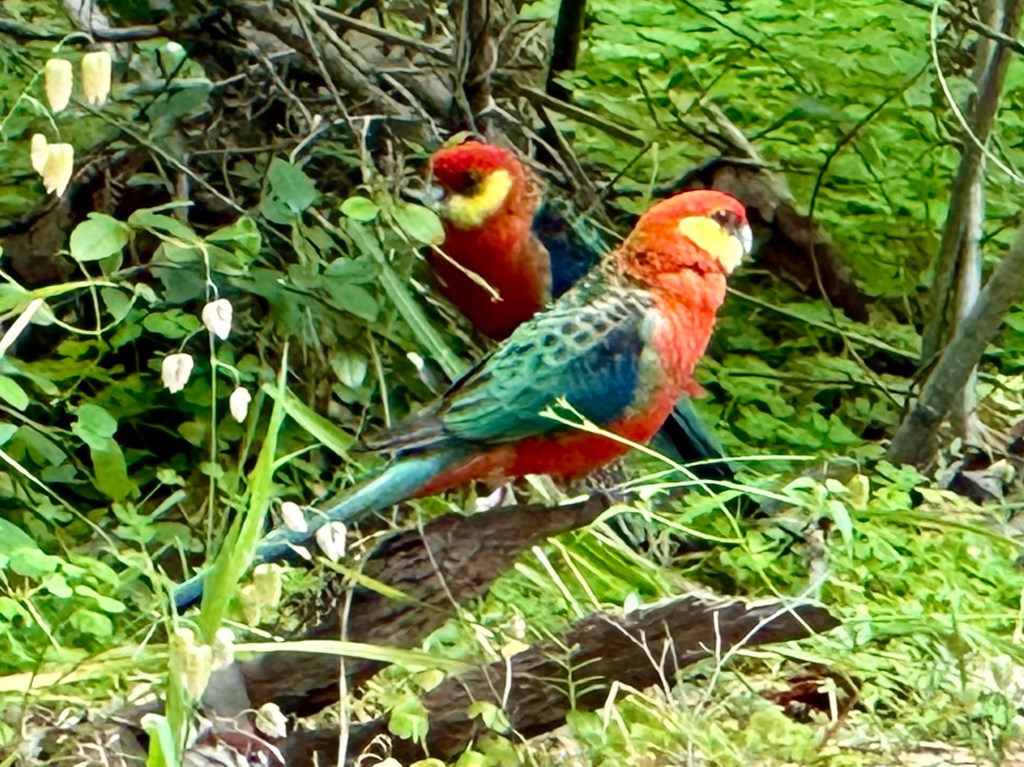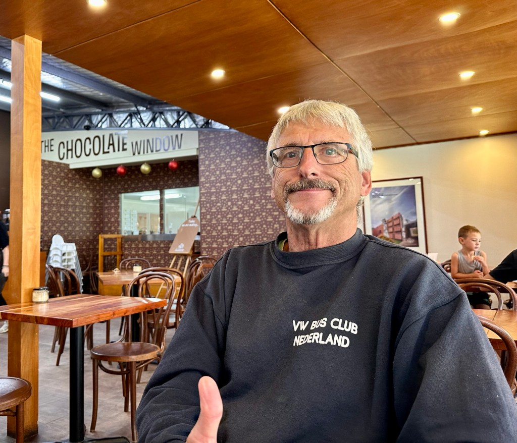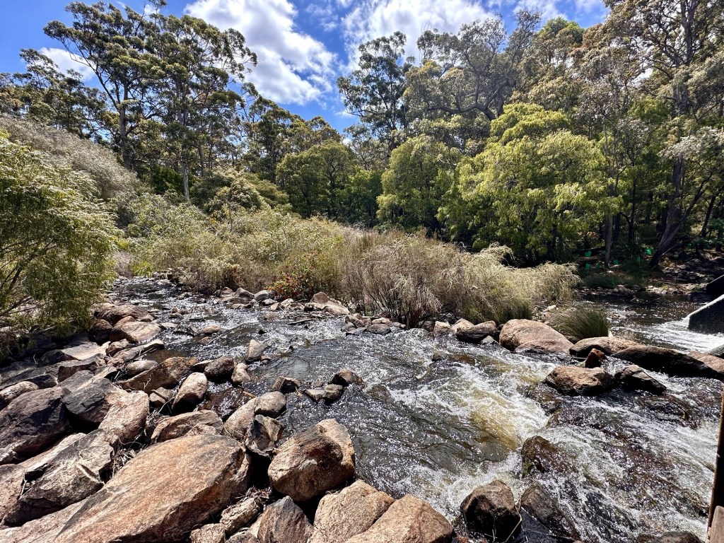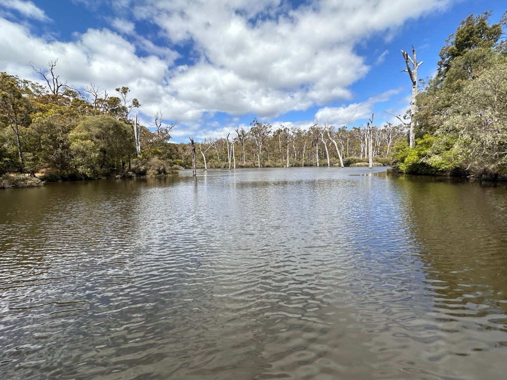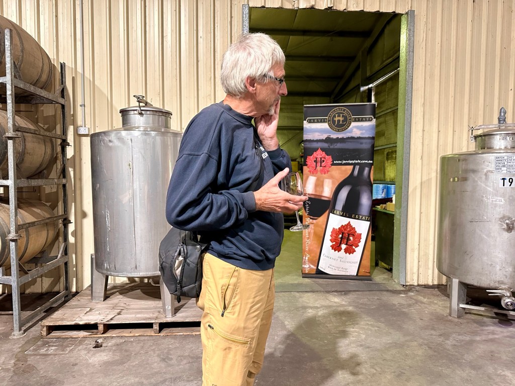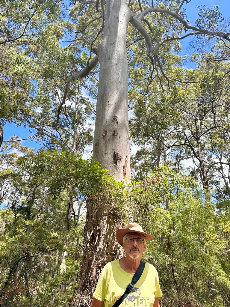 To celebrate Rudy’s birthday, we first made a stop at a Chocolate factory (for cake and coffee). Then we went for a lovely walk along the Margaret river through an old forest. Mighty large and high Karri trees with their pealed bark are rising above many juvenile trees. The forest floor is littered with fallen family members, providing nutrients for the youth. There are mighty Marri and Jarra trees too. The river had several weirs to make sure there is enough water. In town we bought a takeaway meal for tonight’s dinner. In this way Rudy did not have to drive, after the wine tasting since the winery also provides a campsite.