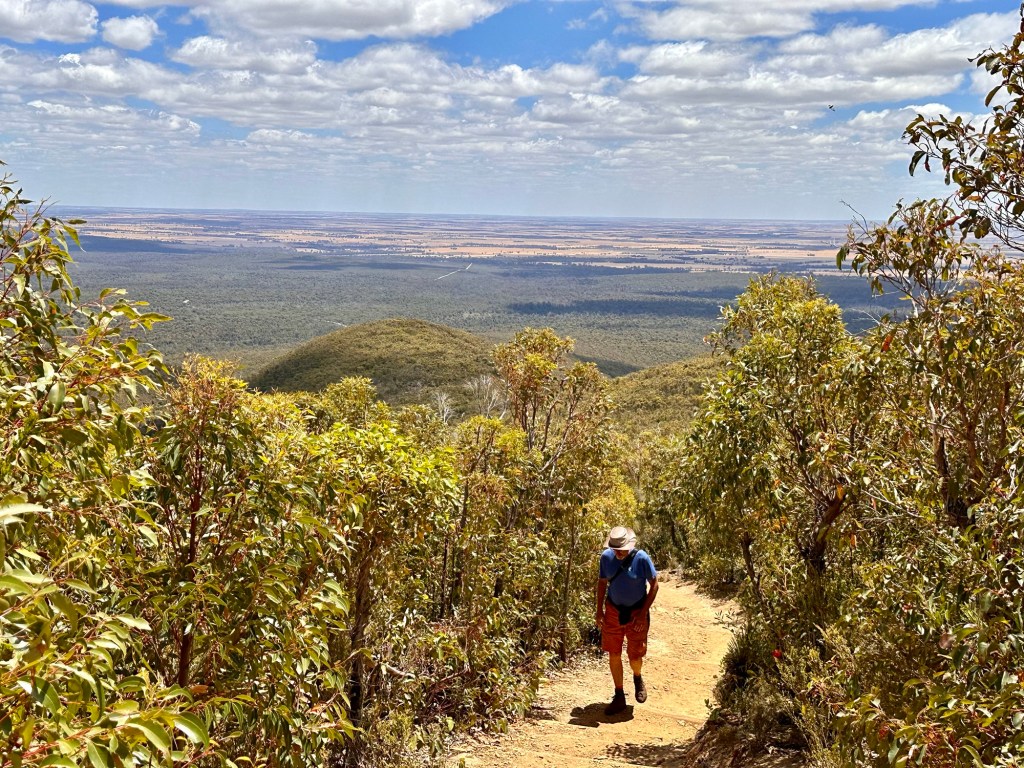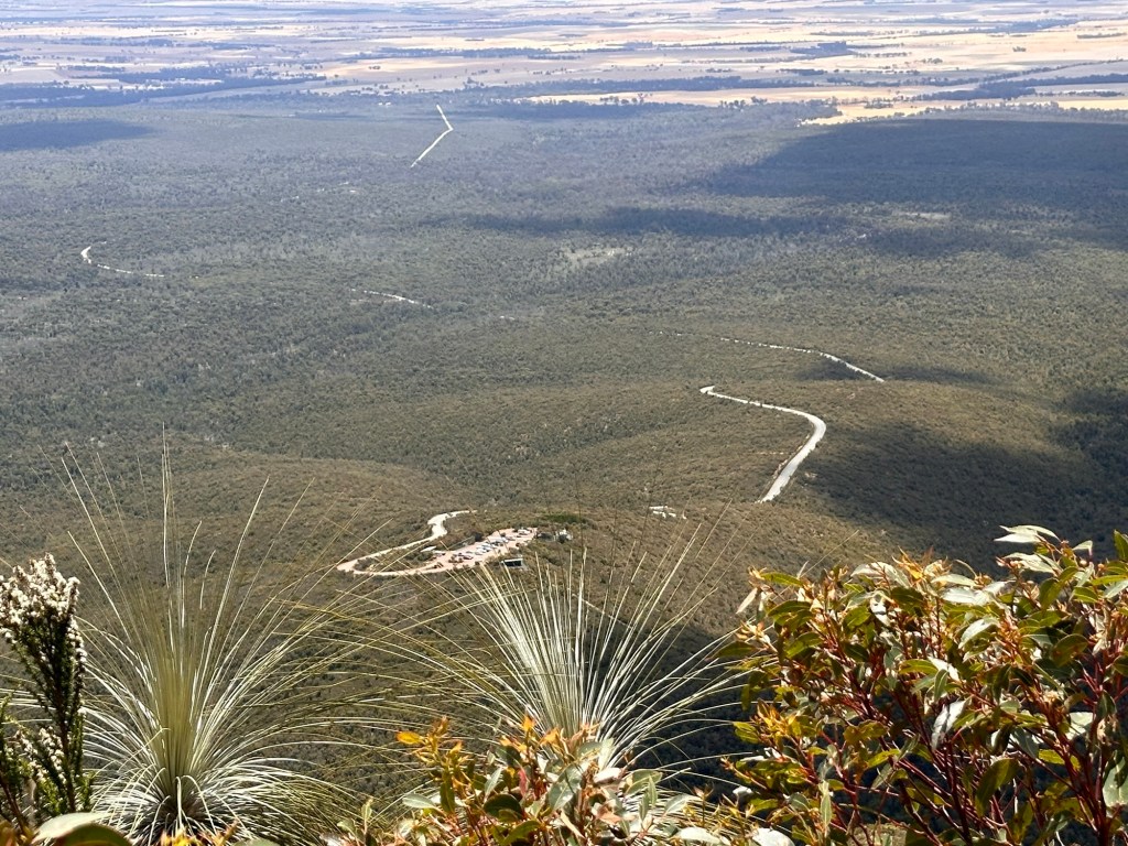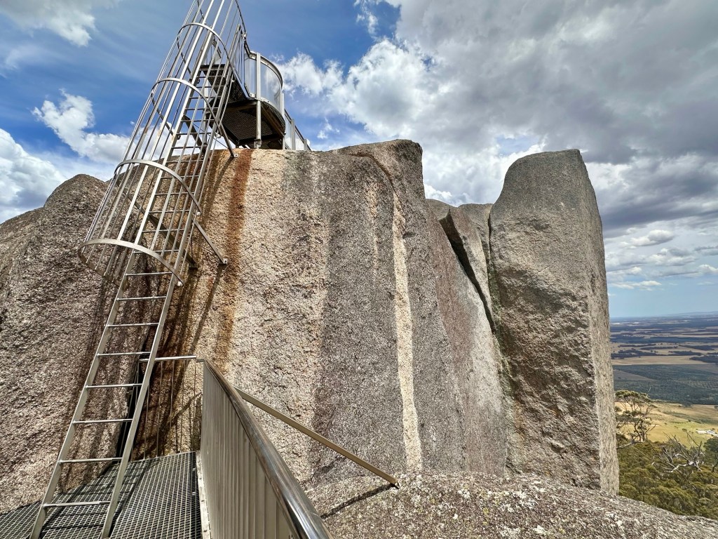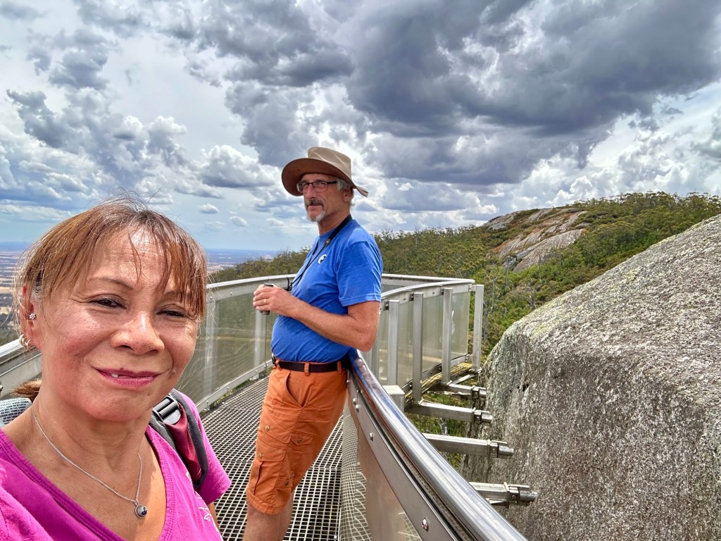 Well what for us was a long climb was actually only a 5 km walk with 260 m height difference. We are slowing down and not in a hurry. You continuously climb up on a path through the forest with the larger Karri and Marri trees near the top. Higher up you start to walk over granite and the last stretch had handholds so you can hoist youself up through the cracks between the boulders. The skywalk provides a 270 deg walk around the top boulders with nice view af the surrounding tree plantation and coastline in the distance. Tiring walk but well worth with the views up the top.