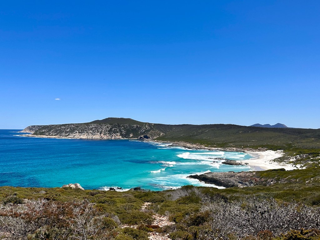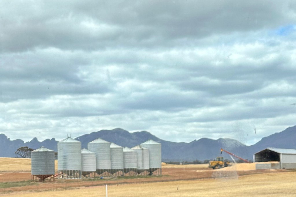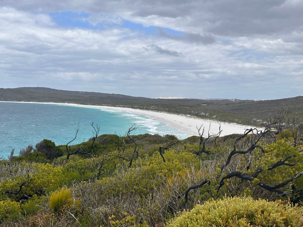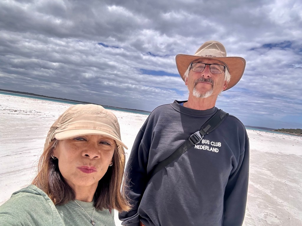 Jamaliah found a direct route on the map to Bremer bay. In December you can make a boat trip to see Orca’s. Unfortunately the Orca’s are only expected to arrive end December. Instead we drove along the very white sandy beaches of the town. The cold wind was blowing hard and there was not much sunshine. So no swimming in the sea today. After stopping for coffee, hot chocolate, muffin and croissant at the ex telegraph office we drove back to Hwy 1 and continued going East. Along the way we saw miles and miles of wheat fields. Only farms. No more trees.