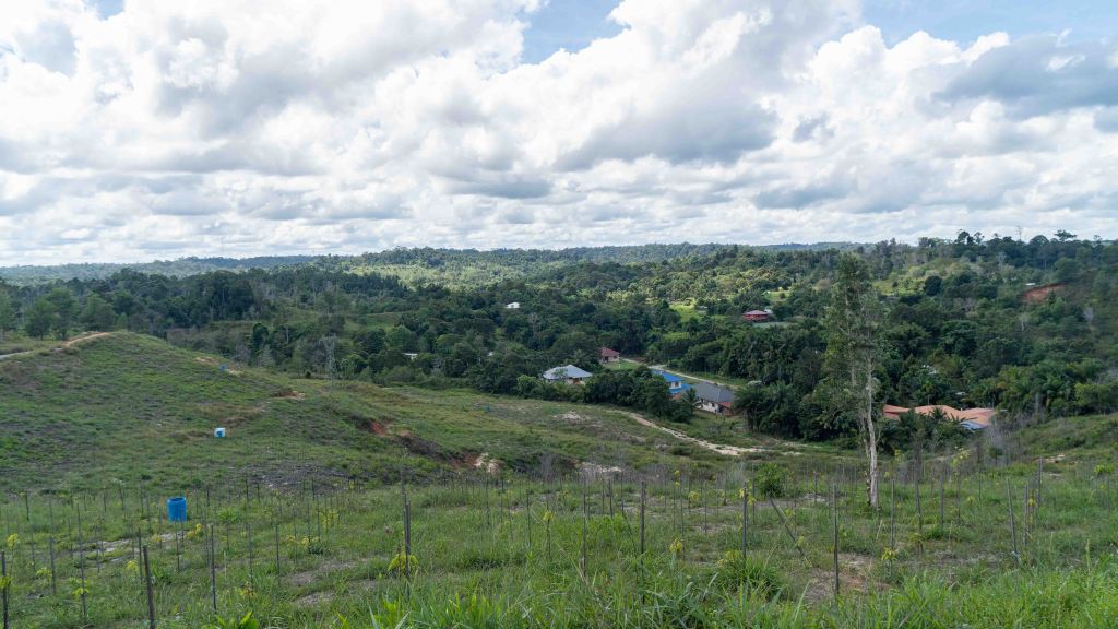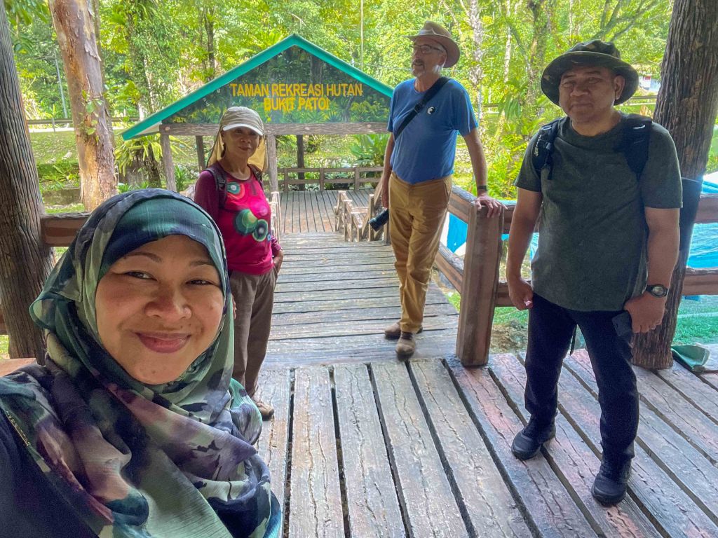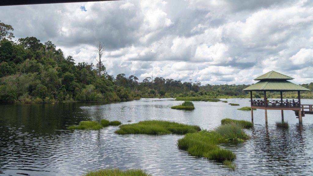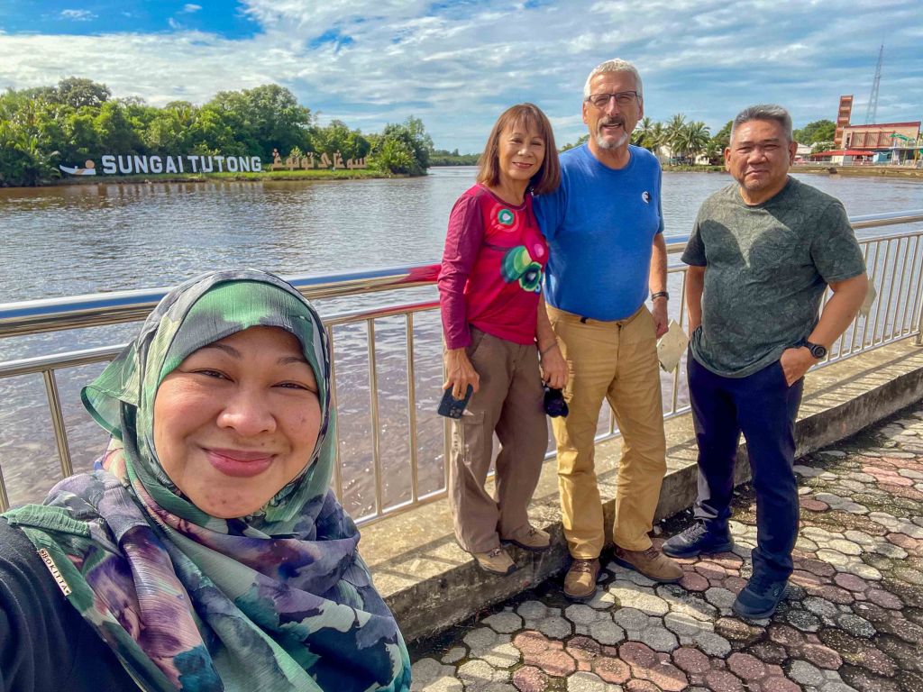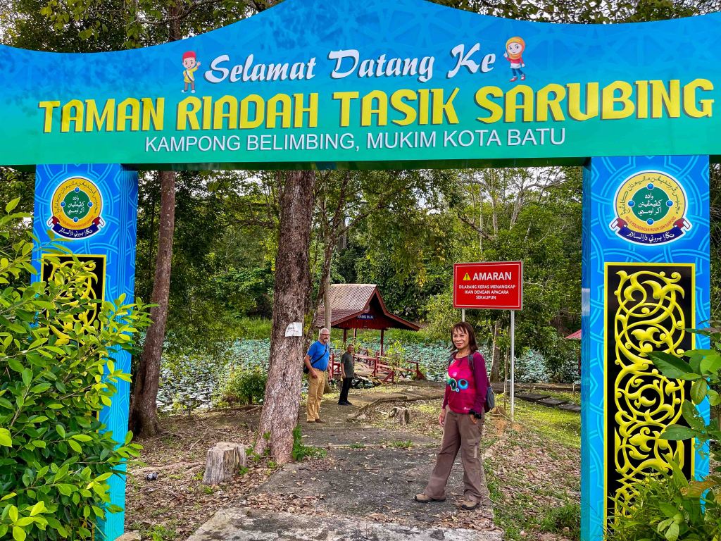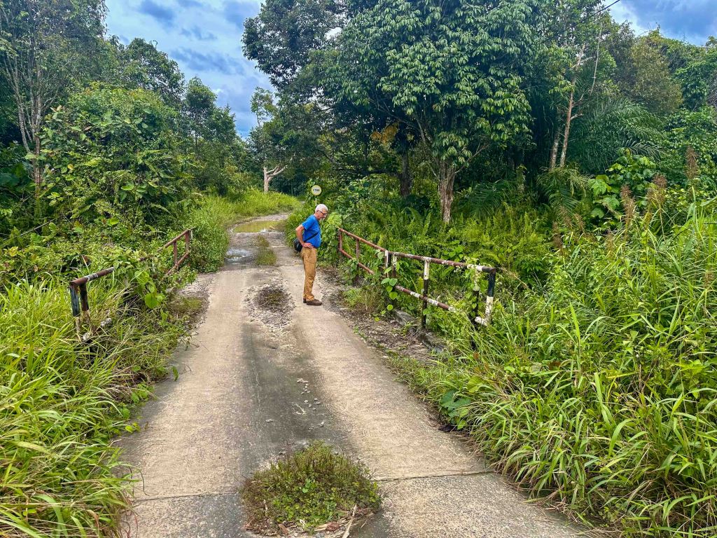 On another trip Jamaliah and Rudy drove a 4×4 pickup truck to the end of Labi road. This is one of Rudy’s favorite roads. It is tarmacked and runs over the top of the hills for 50 km to the border with Sarawak (Malaysia). The road was built in the 1920’s by Shell in their search for oil. They never found any there but instead some years later, in the swamps along the coast at Seria. The road cuts through primary jungle. In the valley at Labi, there is extensive farming of Limes, Papaya, Mango, Cassava, Rice etc. At the end of the road lies Bukit Teraja with at its base a longhouse. The mountain is 417 m high. The old road/paths to the top have been washed away or are overgrown. A new route is under development. In the past (1989-1992) Jamaliah and Rudy made many trips exploring the area with its many waterfalls. On the way back to the coastal road a detour was made to an old rice planting area close to the Belait river. The road is in very poor condition. You could no longer reached the river. Instead, we parked the car and walked over a small bridge to the nearby longhouse. The longhouse community was busy building an extension to one of the 2 longhouses. Years ago, Rudy visited this longhouse area. It was made of wood then. This burnt down some 10 years ago. With help from the government, a new concrete longhouse was built. The last trip over the eroded road from Labi towards lake Tasek Merimbun was made in pouring rain. At one point we (Chris and Rudy) had to turn back and find another road. The road conditions were too bad. Tasek Merimbun lake was once a well-developed recreational area with several small islands in the lake connected with wooden walkways. You could also rent boats here. Unfortunately, this has all disappeared